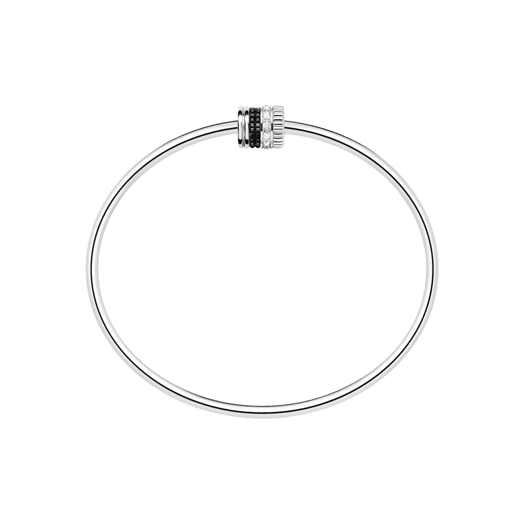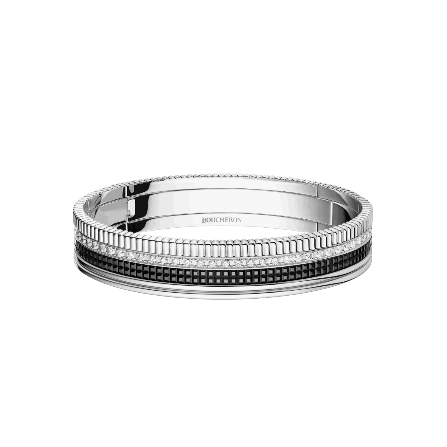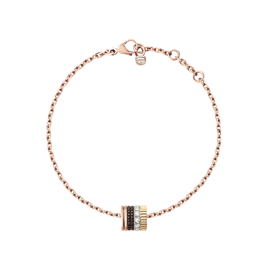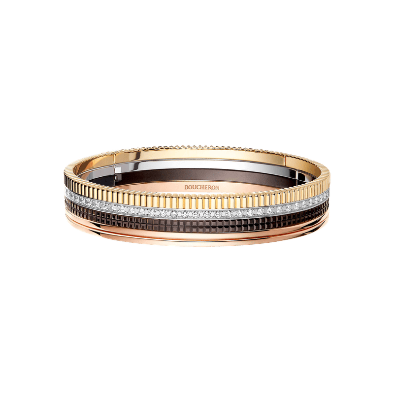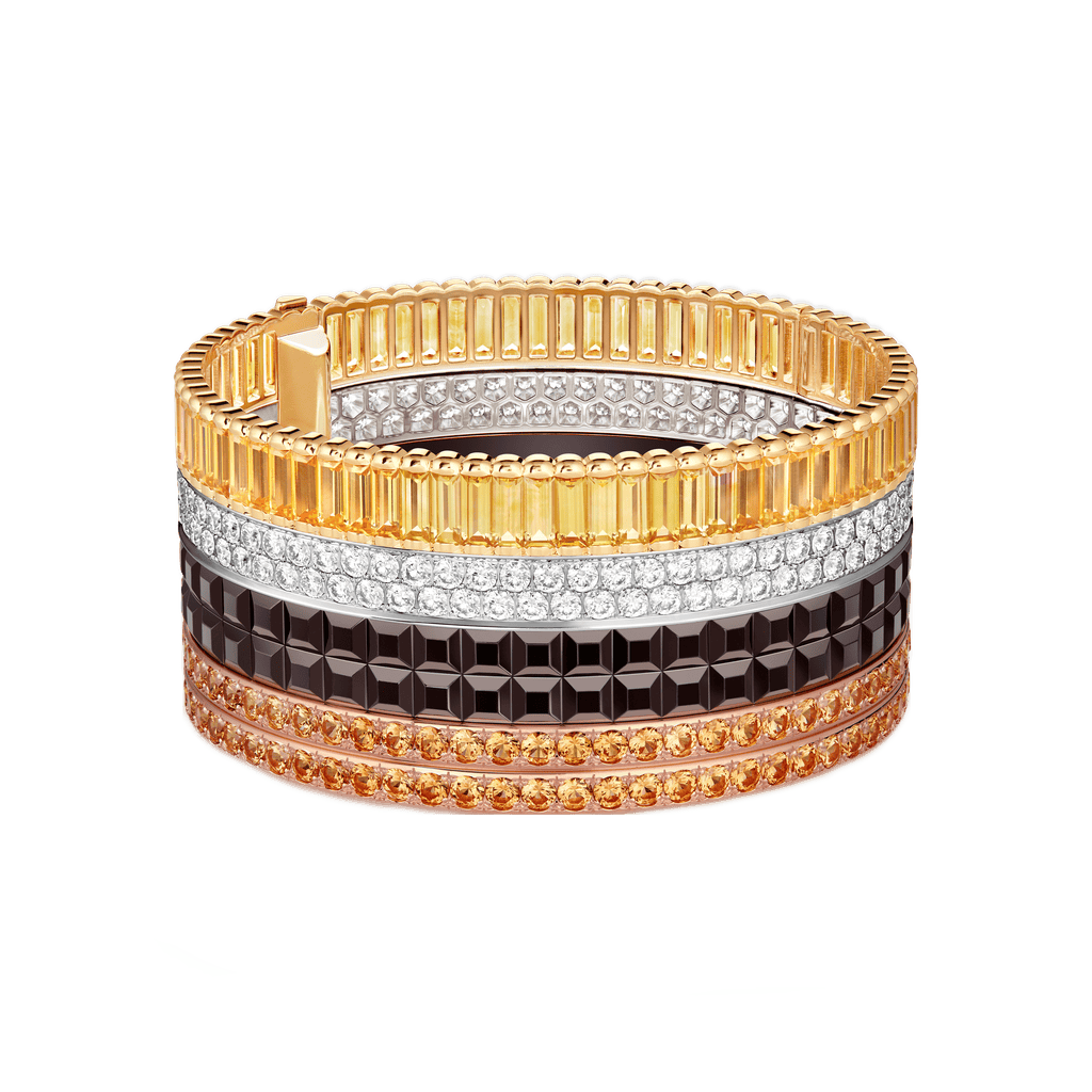 I’m very surprising because I wear my jewelry every day, even if it costs a lot. If I have a bigger diamond, I’ll wear it on the Metro. I’m not afraid of wearing anything in the daytime. In general, the more casual [pieces] that I wear every day are Quatre. [Shows off her bracelet stack.] I have a grey one, a red one, a black one, so I always have a Quatre. I love stacking. I always have rings, but I don’t wear earrings, and I don’t wear necklaces, except for last night. My gosh, I wore the Question Mark necklace. It was an emerald and ivory Question Mark necklace; it was stunning.