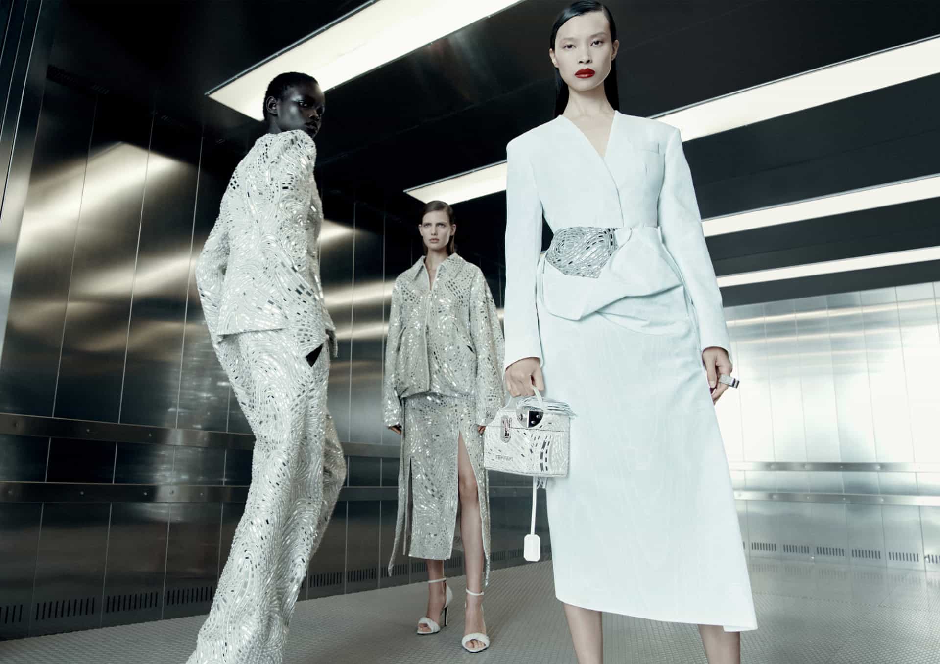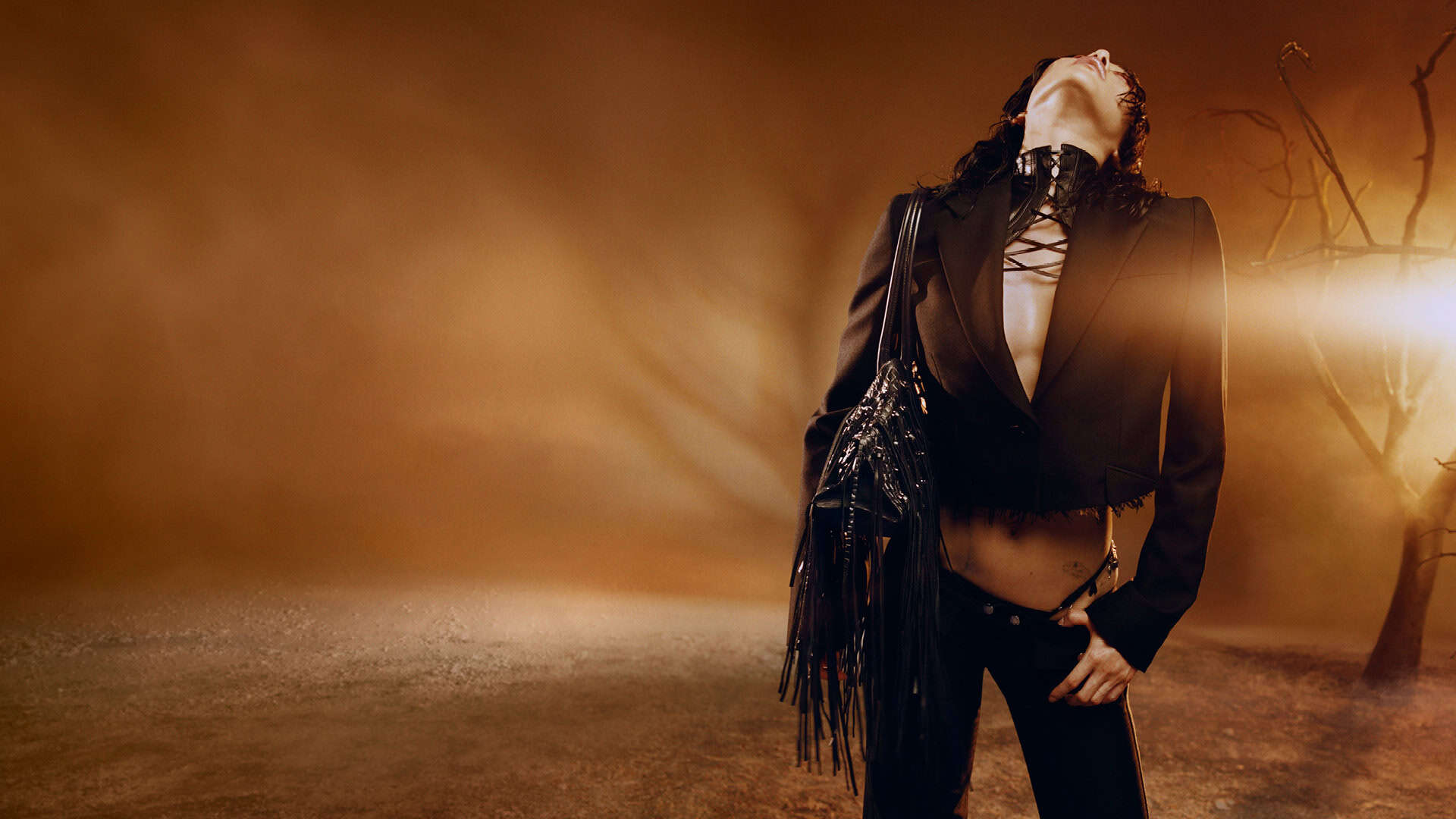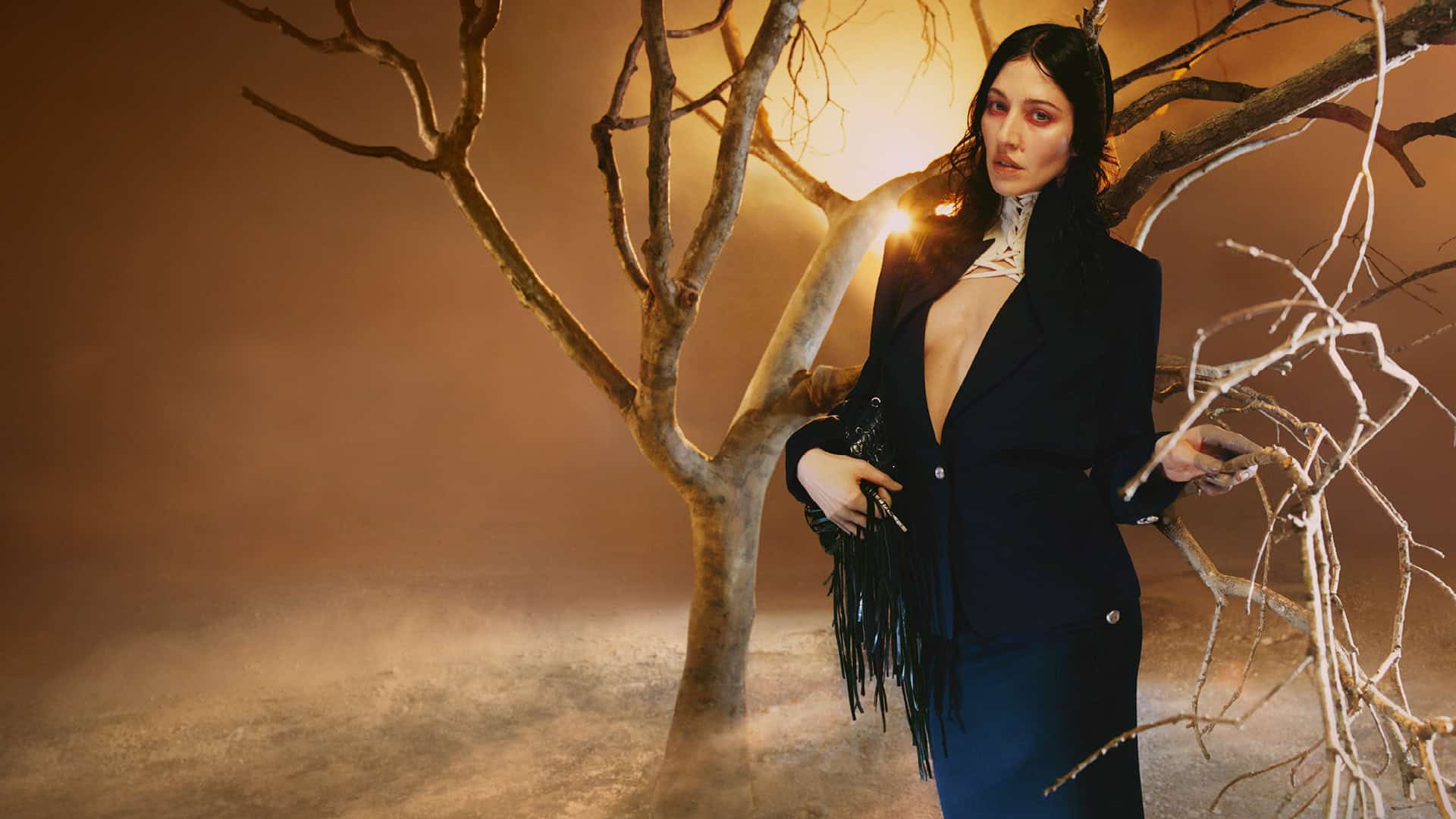 Seán McGirr loves a horror story. Whether it’s diving into the legend of the banshee or most recently, for McQueen spring 2026, taking inspiration from The Wicker Man, a tale about a religious policement searching for a missing child in a remote Celtic pagan vilage. That haunting backdrop serves as the perfect setting for the accompanying ad campaign. Photographed and directed by Harley Weir, the images capture musicians Caroline Polachek, Celeste and Amy Taylor alongside models Alex Consani and Sora Choi. Set within a scorched earth looking world, it’s an exploration of the tension between nature and urban landscapes, mirroring the collection’s contrasts.