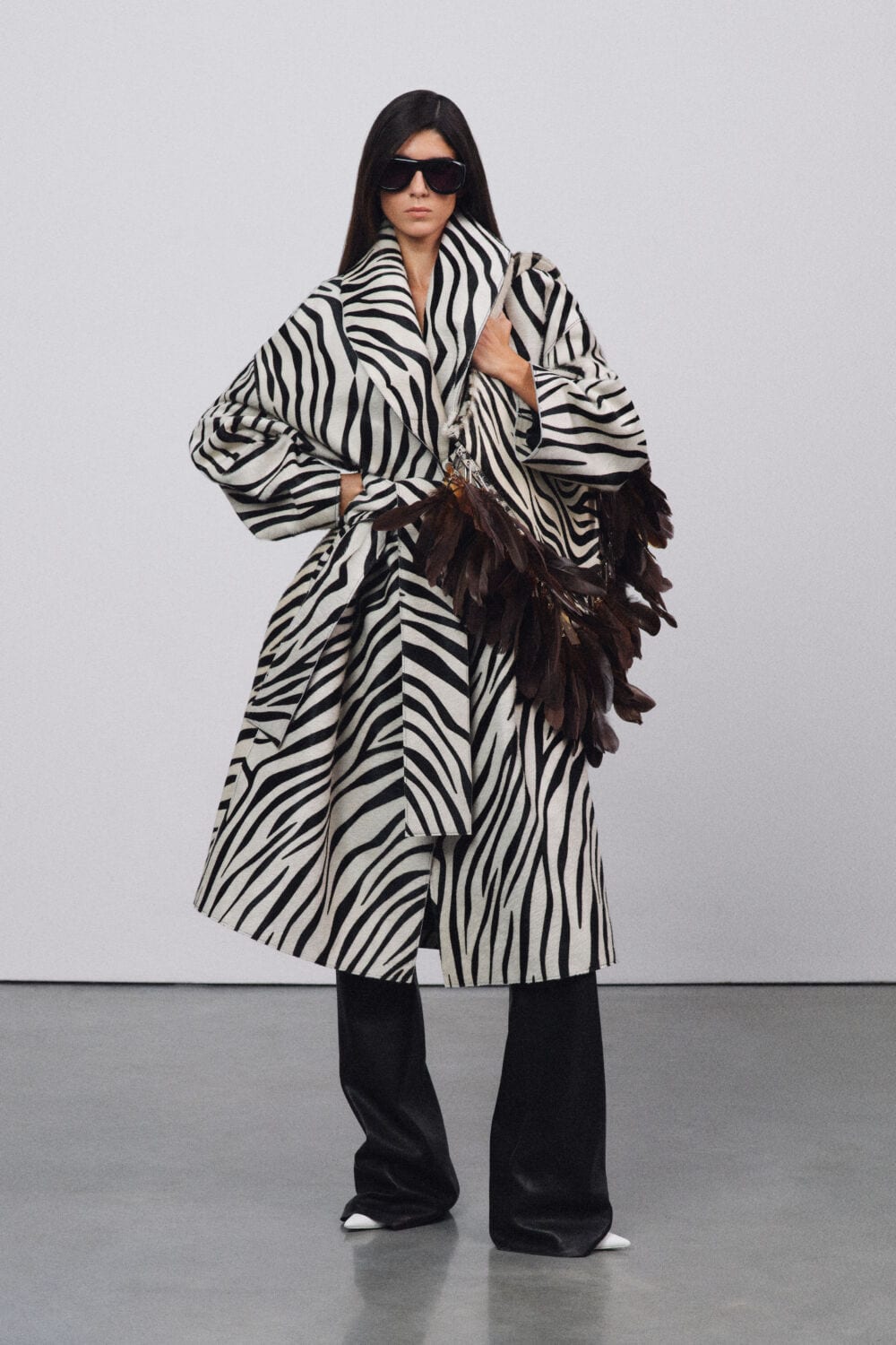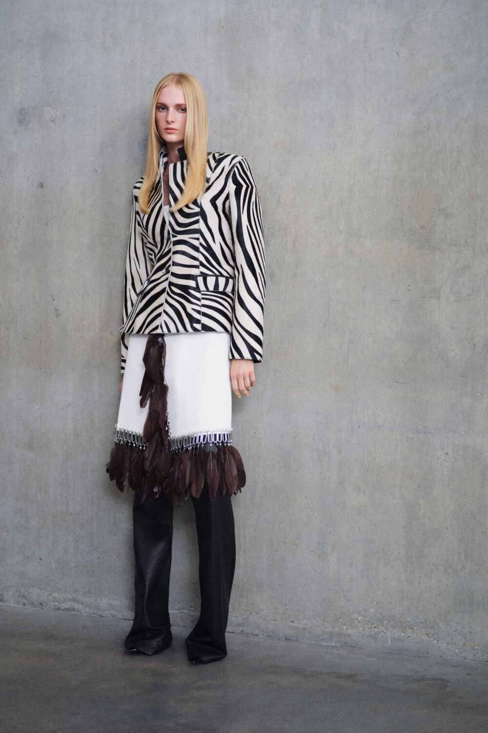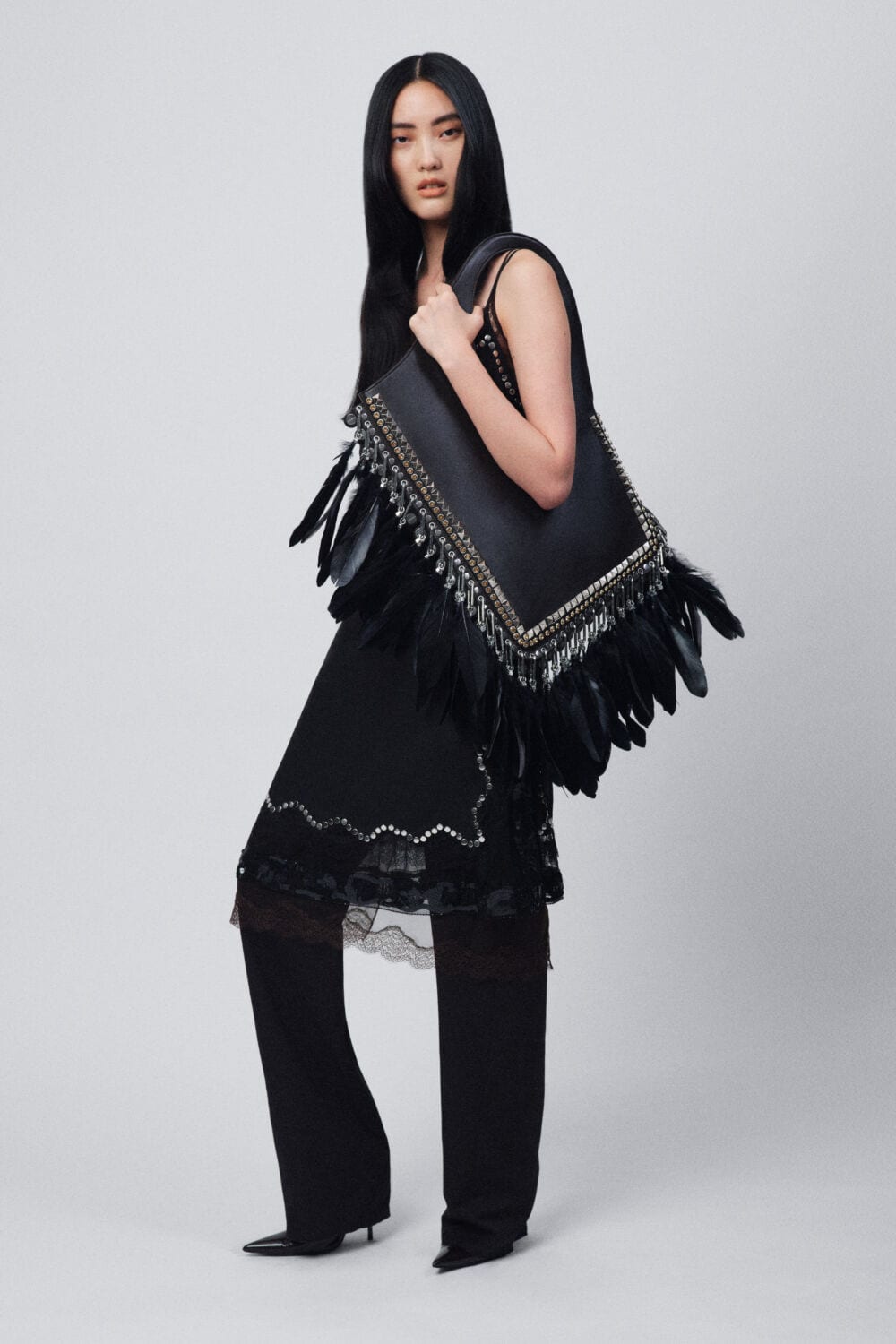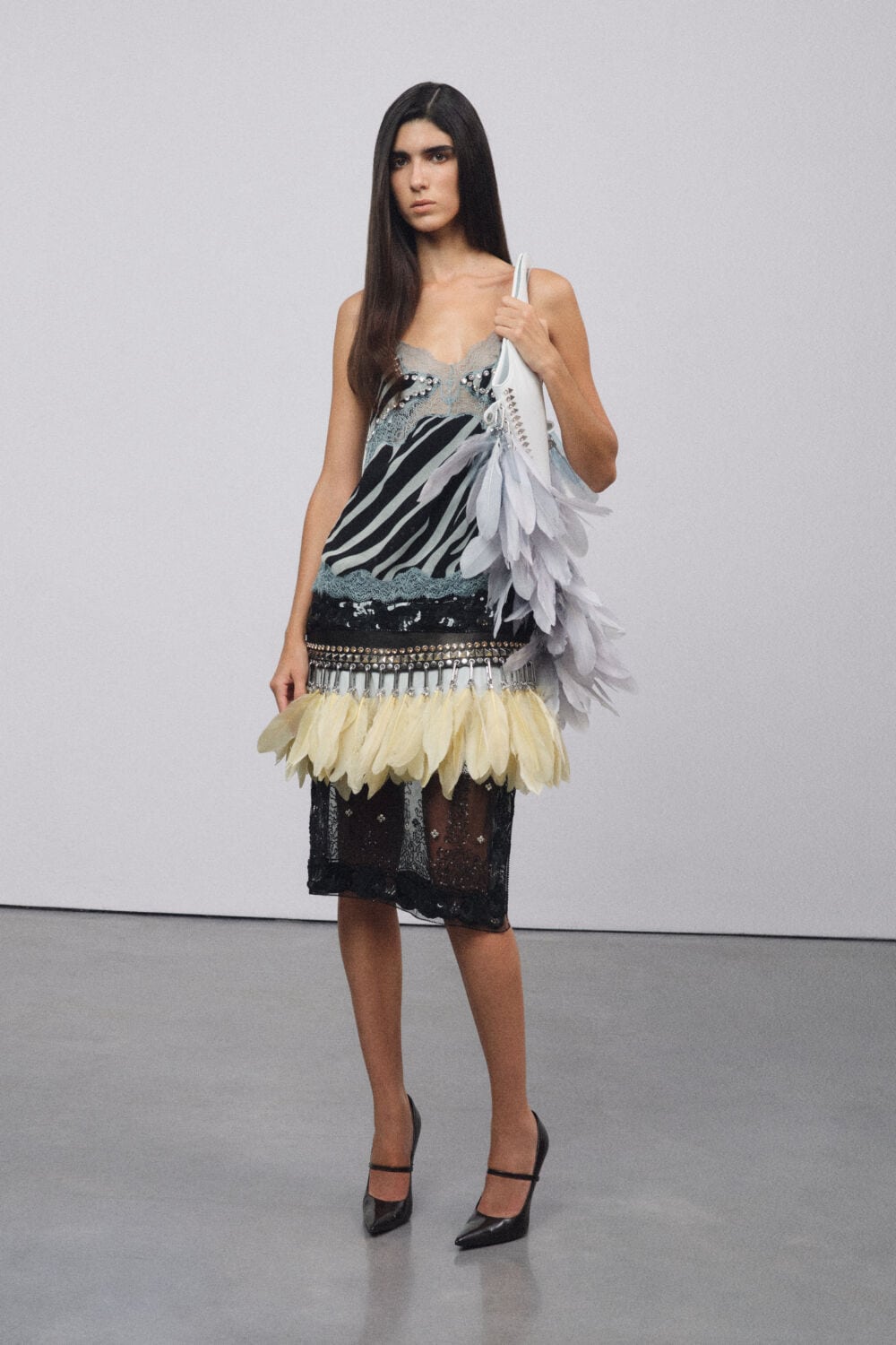 The 16Arlington girl has always loved a party and these clothes are laced with the sort of pizzaz that’ll have heads turning on the dance floor. Zebra print blouses? Gorgeous. Lace slip dresses frosted with confetti-shaped paillettes? Delish. Such pieces make for a hedonistic uniform without ever teetering on silly or ridiculous. Massive triangular totes come accented with a curtain of feathers hung from carabiners. Camisoles migrate into crystal-embellished pencil skirts with zebra stripes at the hem and extra dramatic trench coats are whipped into shape thanks to XL studded belts. This is a collection that celebrates the joy of dressing up and being just that little bit extra with your look before stepping out the door.