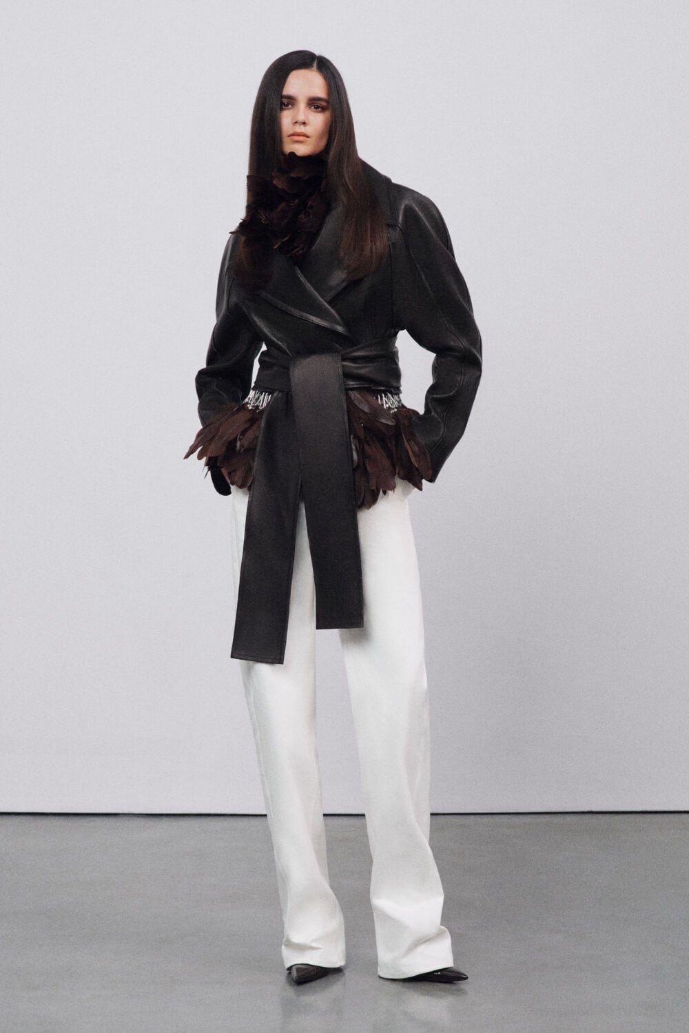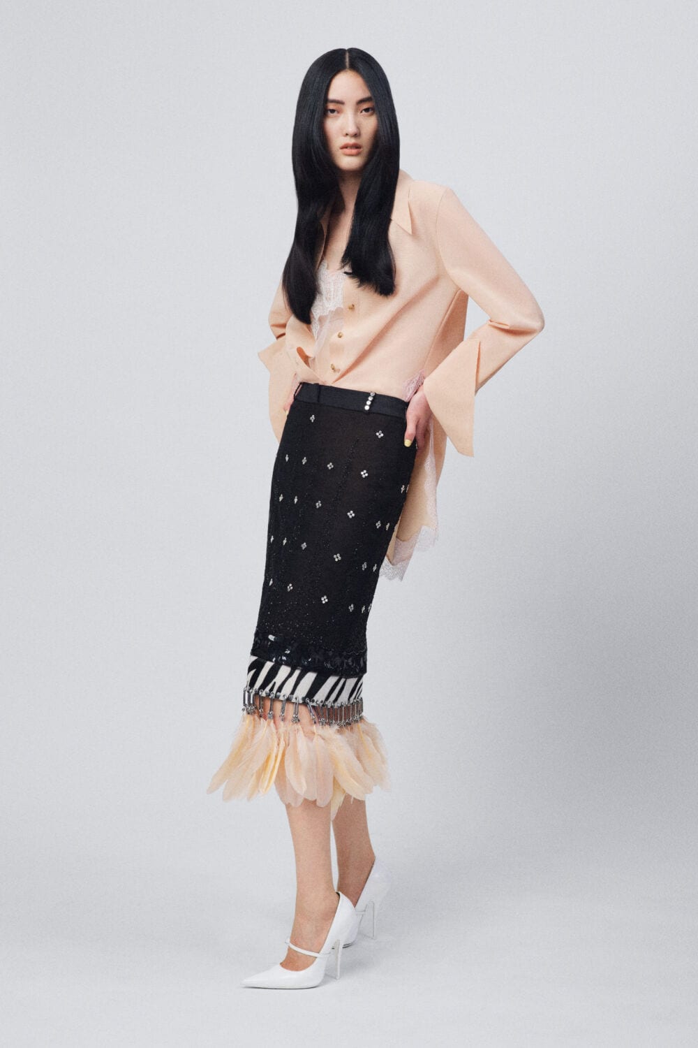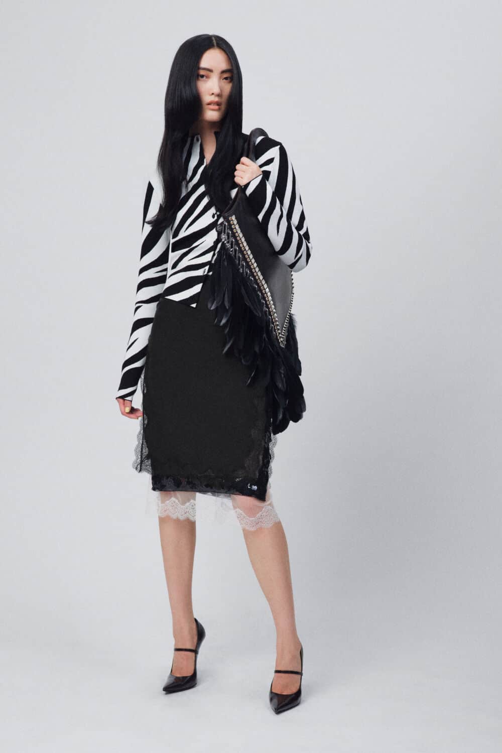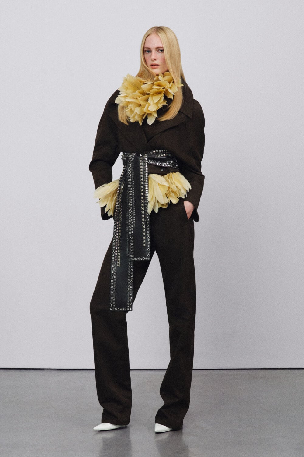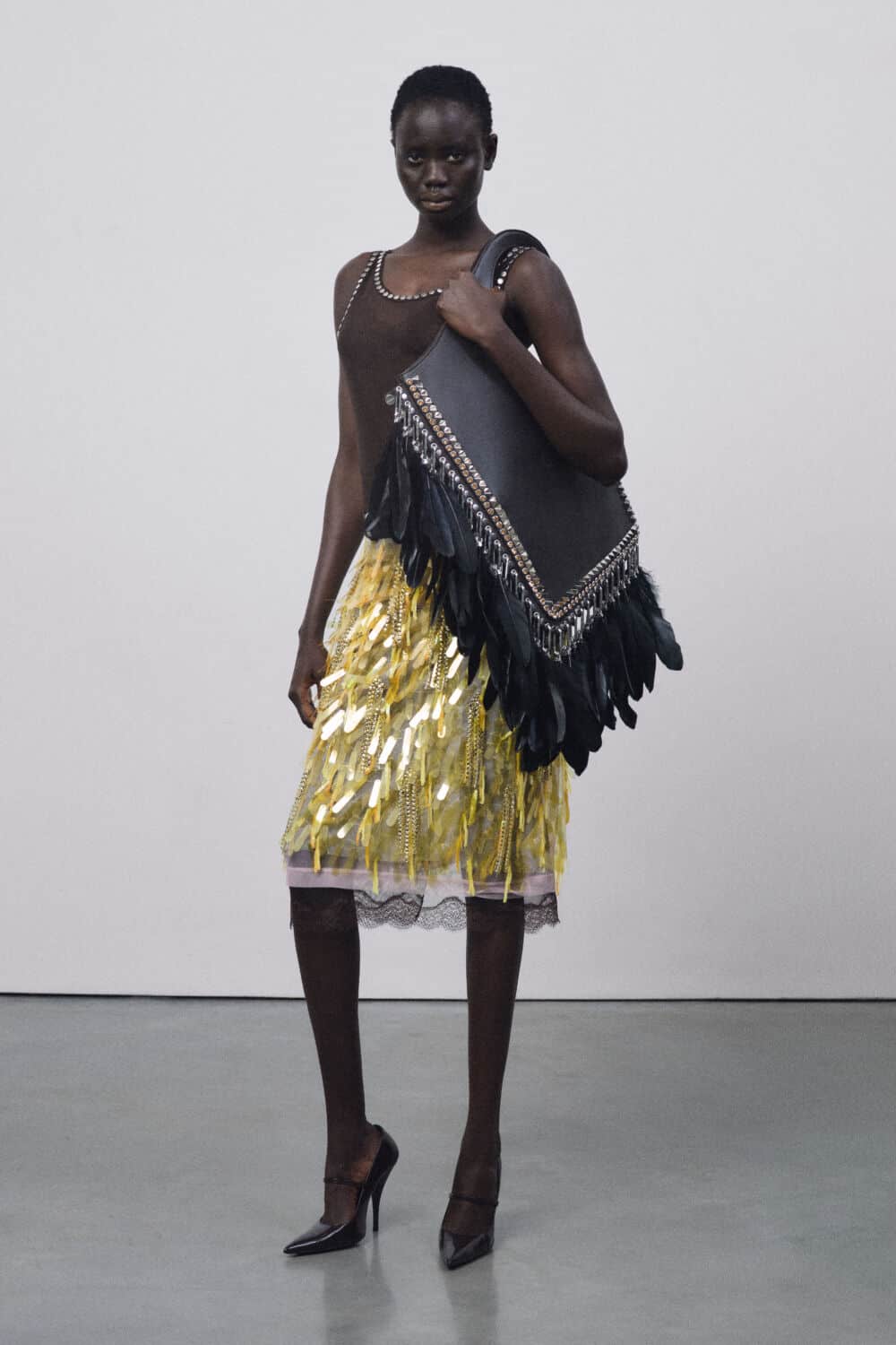 The 16Arlington girl has always loved a party and these clothes are laced with the sort of pizzaz that’ll have heads turning on the dance floor. Zebra print blouses? Gorgeous. Lace slip dresses frosted with confetti-shaped paillettes? Delish. Such pieces make for a hedonistic uniform without ever teetering on silly or ridiculous. Massive triangular totes come accented with a curtain of feathers hung from carabiners. Camisoles migrate into crystal-embellished pencil skirts with zebra stripes at the hem and extra dramatic trench coats are whipped into shape thanks to XL studded belts. This is a collection that celebrates the joy of dressing up and being just that little bit extra with your look before stepping out the door.