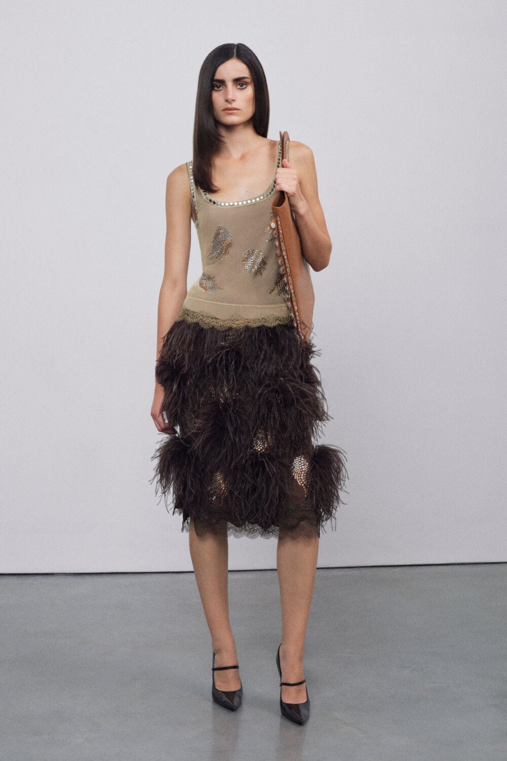Unveiling his latest collection via a lookbook, 16Arlington’s Marco Capaldo proves he doesn’t need the glow of the catwalk for his clothes to dazzle: they shine brightly all on their own. If there’s someone who could make a textural pile-on look ultra glam, it’s Capaldo. For his spring 2026 outing, he toured through age-old wardrobe heroes like Twenties lingerie, Forties sleepwear and Nineties pencil skirts, bulldozing each into one another with lashings of sparkle and plenty of feathers.