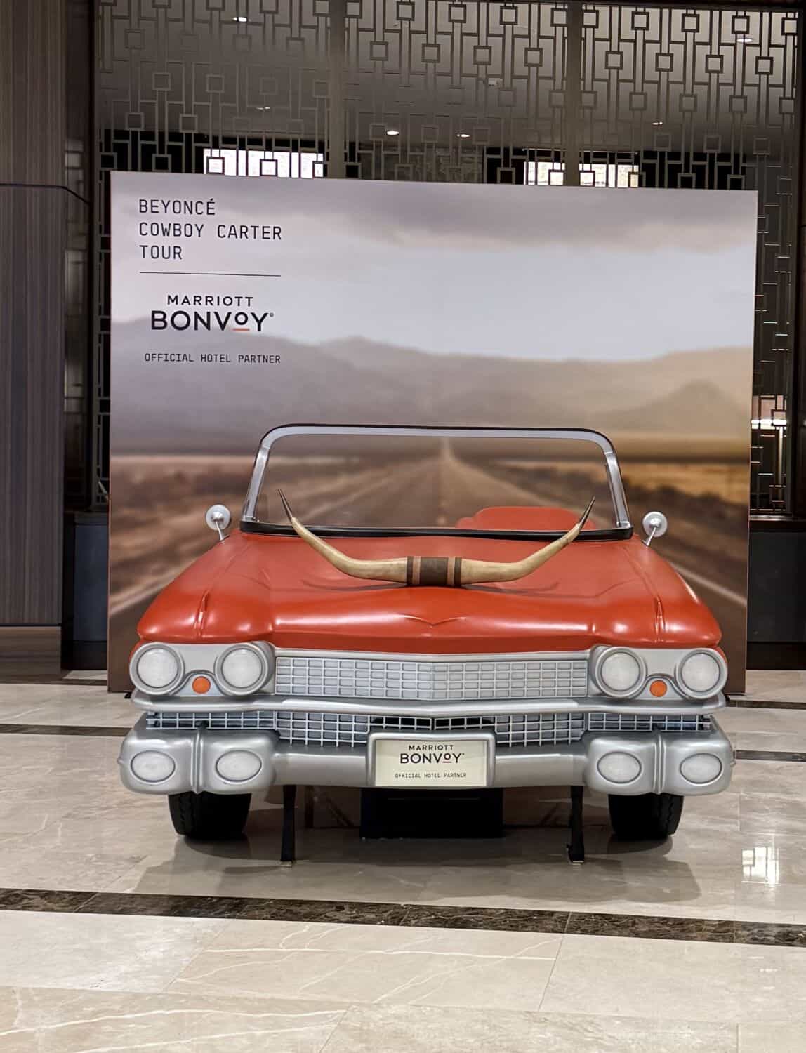 2:00 p.m. The Marriott Marquis Houston is prepared for their concert-going guests. There’s a DJ playing Beyoncé’s best hits; QR codes with discounts on her haircare line, Cécred; activations like glitter tattoos, cowboy hat customizing, and permanent jewelry; and a photo moment with a model of the floating red convertible from the show in which she sings “16 CARRIAGES.” (It should be noted that during her first show of the weekend, the floating car malfunctioned, much to the audience’s distress. Nevertheless, the singer was unharmed but chose not to use the car for night two.)