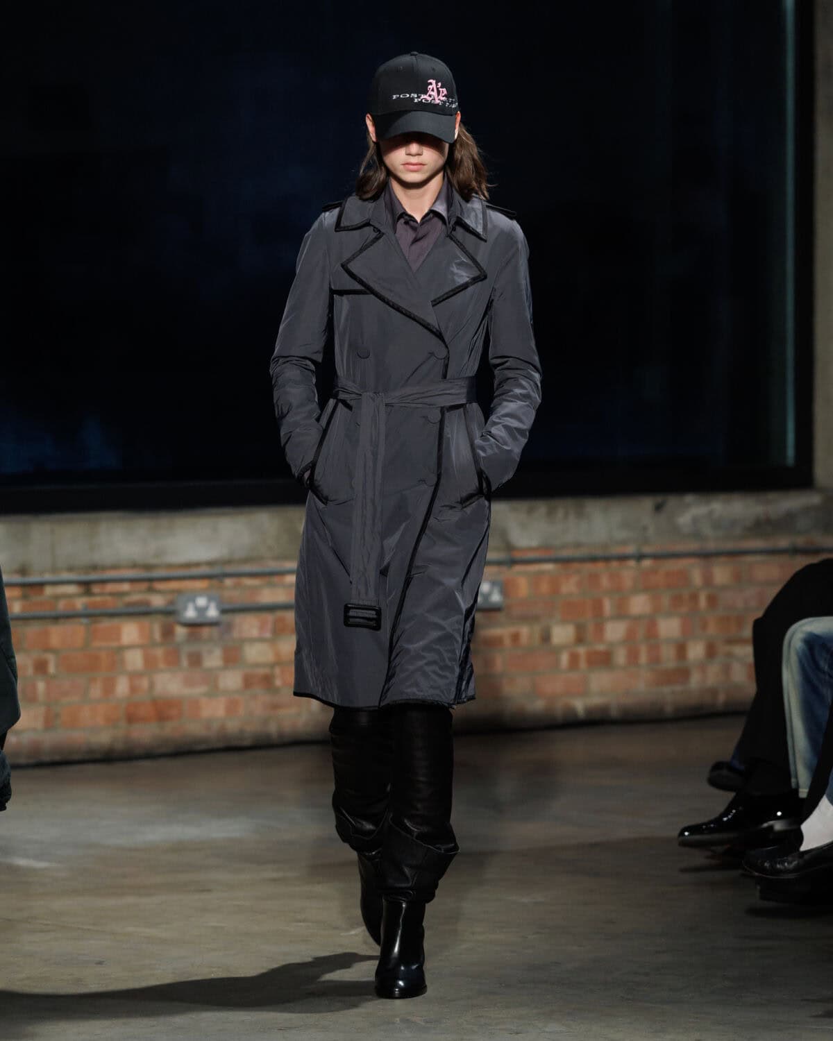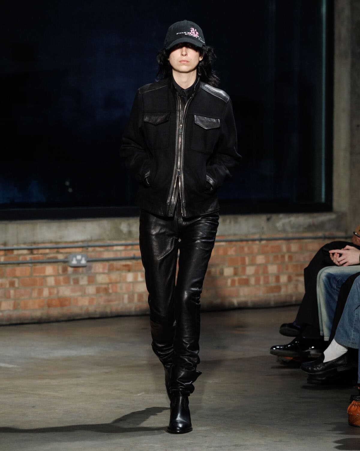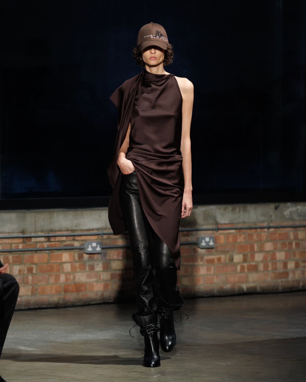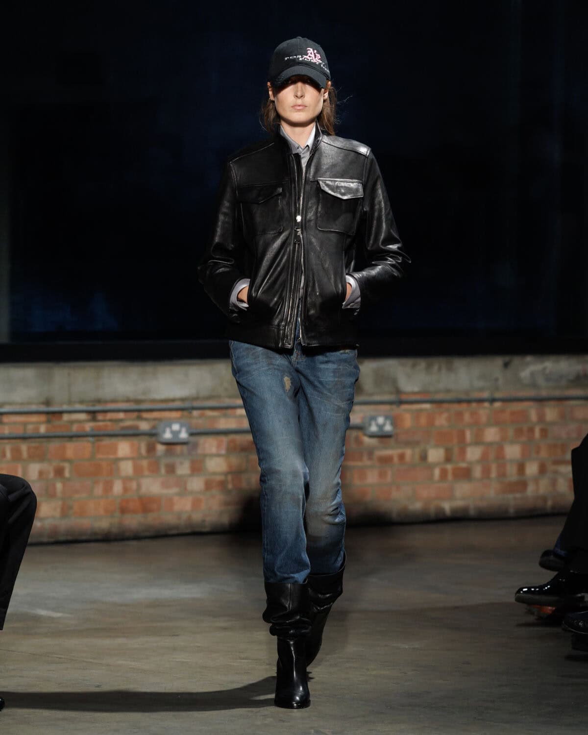 Working again with stylist Katy England, his troupe looked like off-duty indie kids. Out they came in cropped leather bombers with matching skinny trousers with access-all-areas passes plonked on the bum. There were suede military jackets and trench coats thrown over distressed skinny jeans, and glam bias-cut silk dresses that were played down with distressed baseball caps and slouchy boots. You can see these looks parading down Kingsland Road with a certain swagger, the way a great coat or that perfect cut to a jean can unleash a new attitude from within.