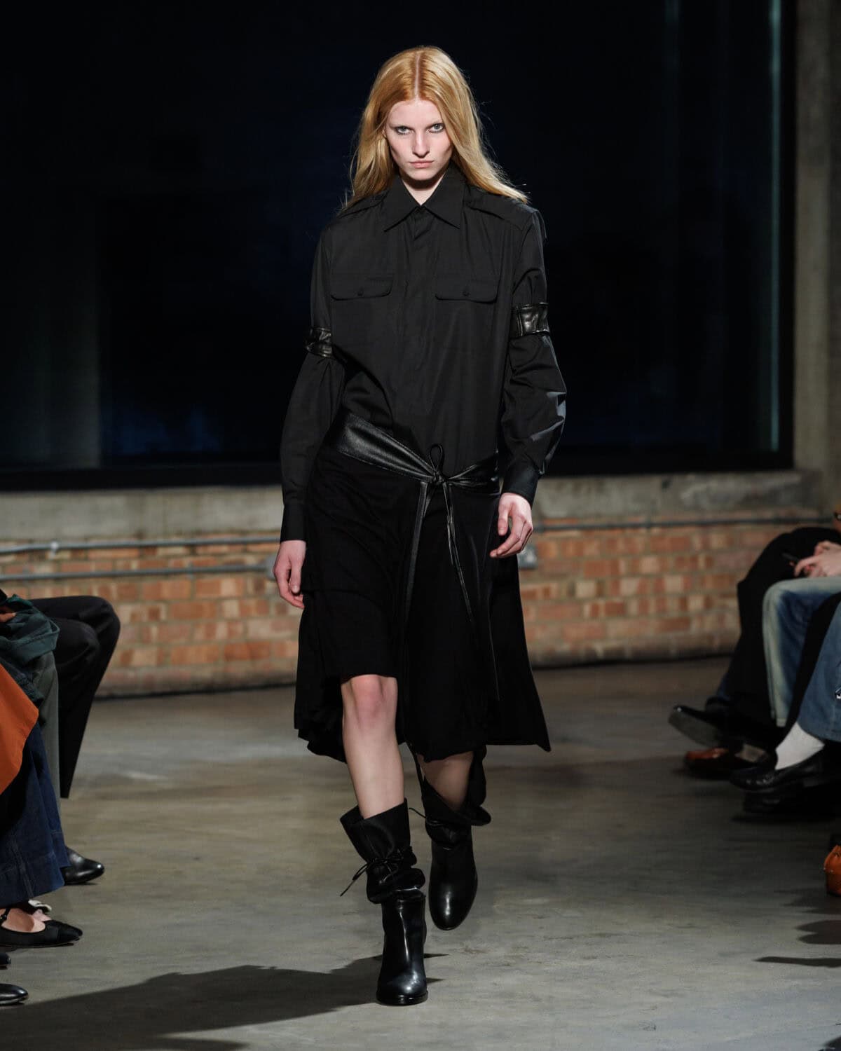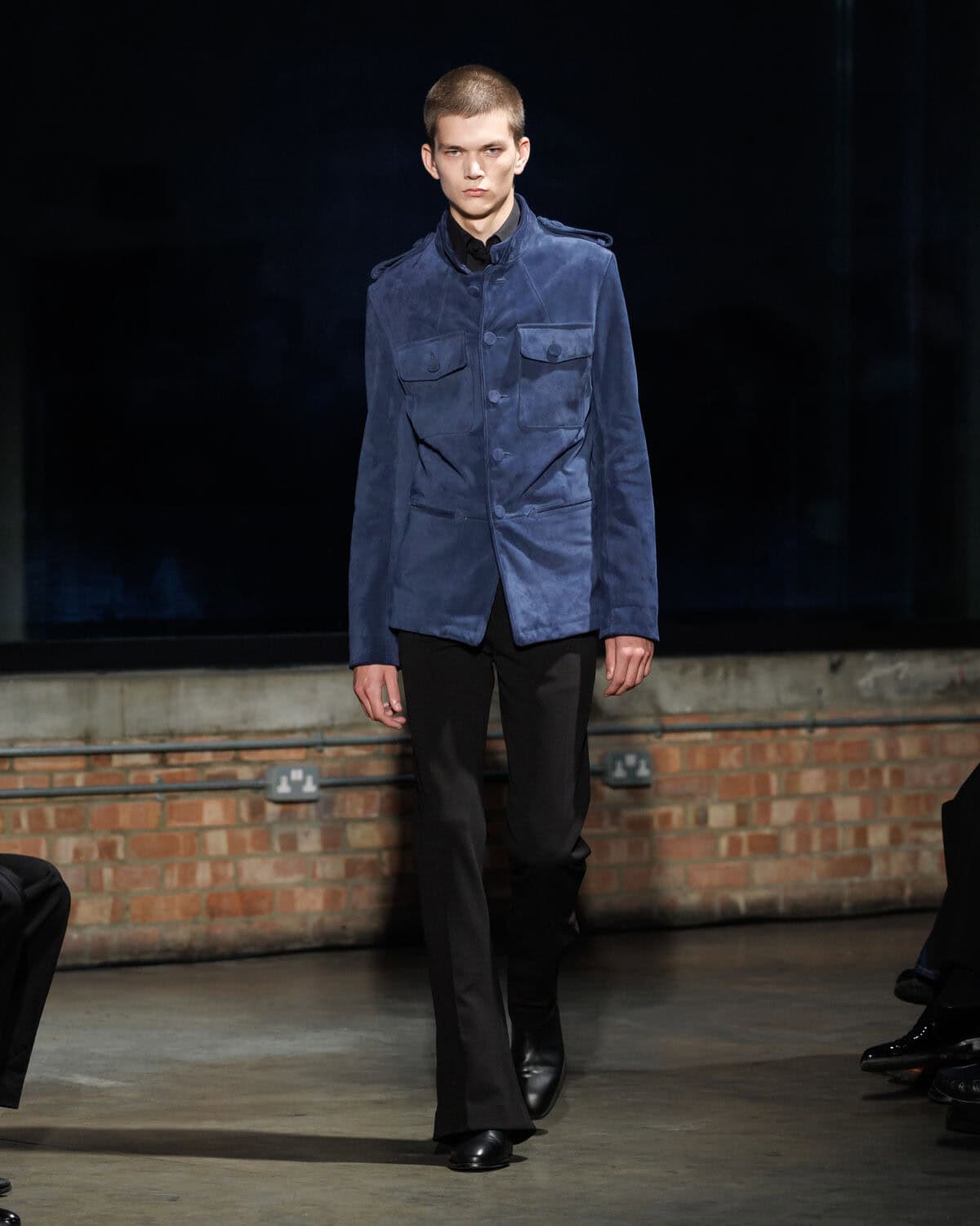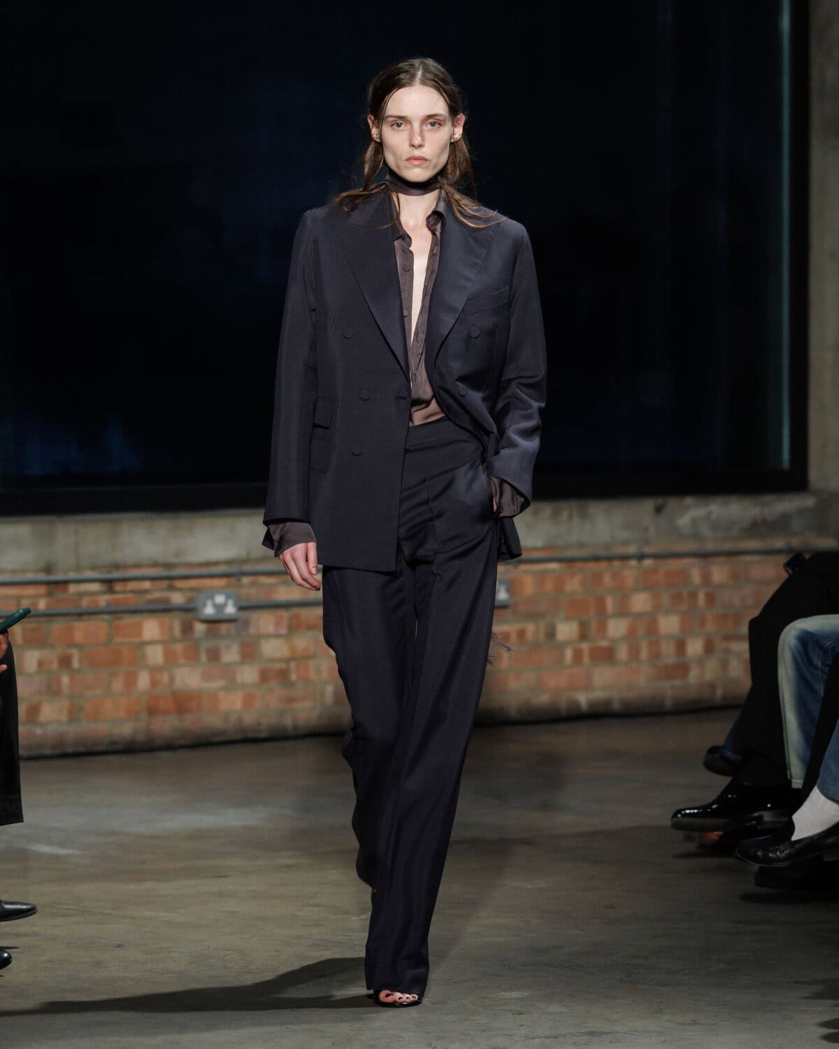 Working again with stylist Katy England, his troupe looked like off-duty indie kids. Out they came in cropped leather bombers with matching skinny trousers with access-all-areas passes plonked on the bum. There were suede military jackets and trench coats thrown over distressed skinny jeans, and glam bias-cut silk dresses that were played down with distressed baseball caps and slouchy boots. You can see these looks parading down Kingsland Road with a certain swagger, the way a great coat or that perfect cut to a jean can unleash a new attitude from within.
