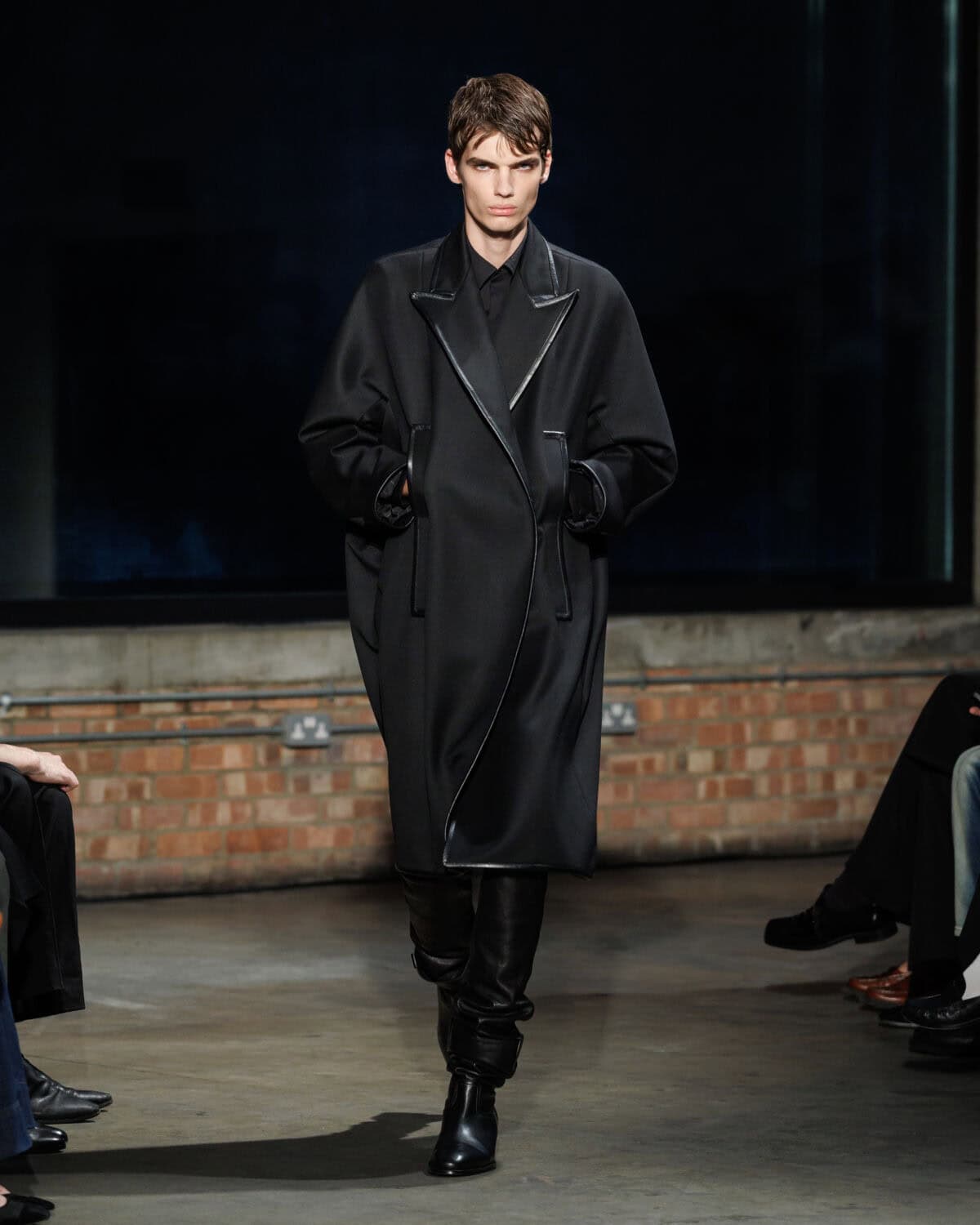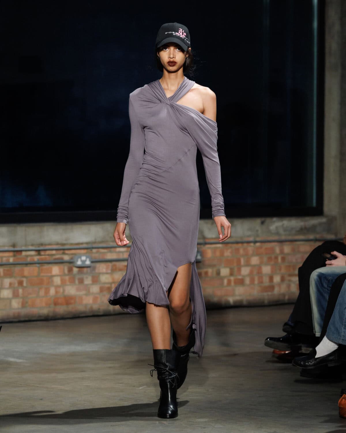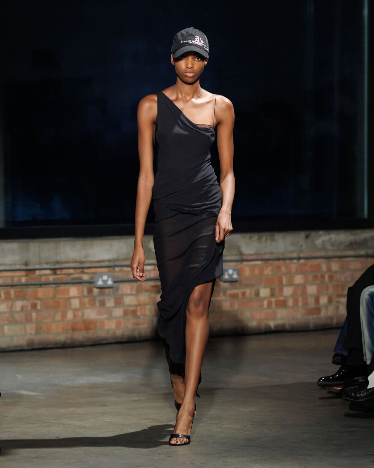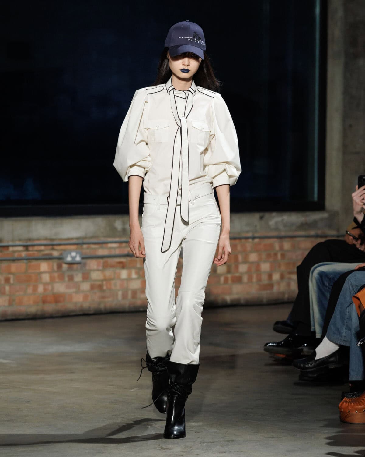 Working again with stylist Katy England, his troupe looked like off-duty indie kids. Out they came in cropped leather bombers with matching skinny trousers with access-all-areas passes plonked on the bum. There were suede military jackets and trench coats thrown over distressed skinny jeans, and glam bias-cut silk dresses that were played down with distressed baseball caps and slouchy boots. You can see these looks parading down Kingsland Road with a certain swagger, the way a great coat or that perfect cut to a jean can unleash a new attitude from within.