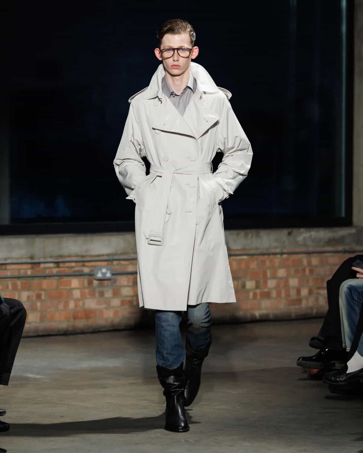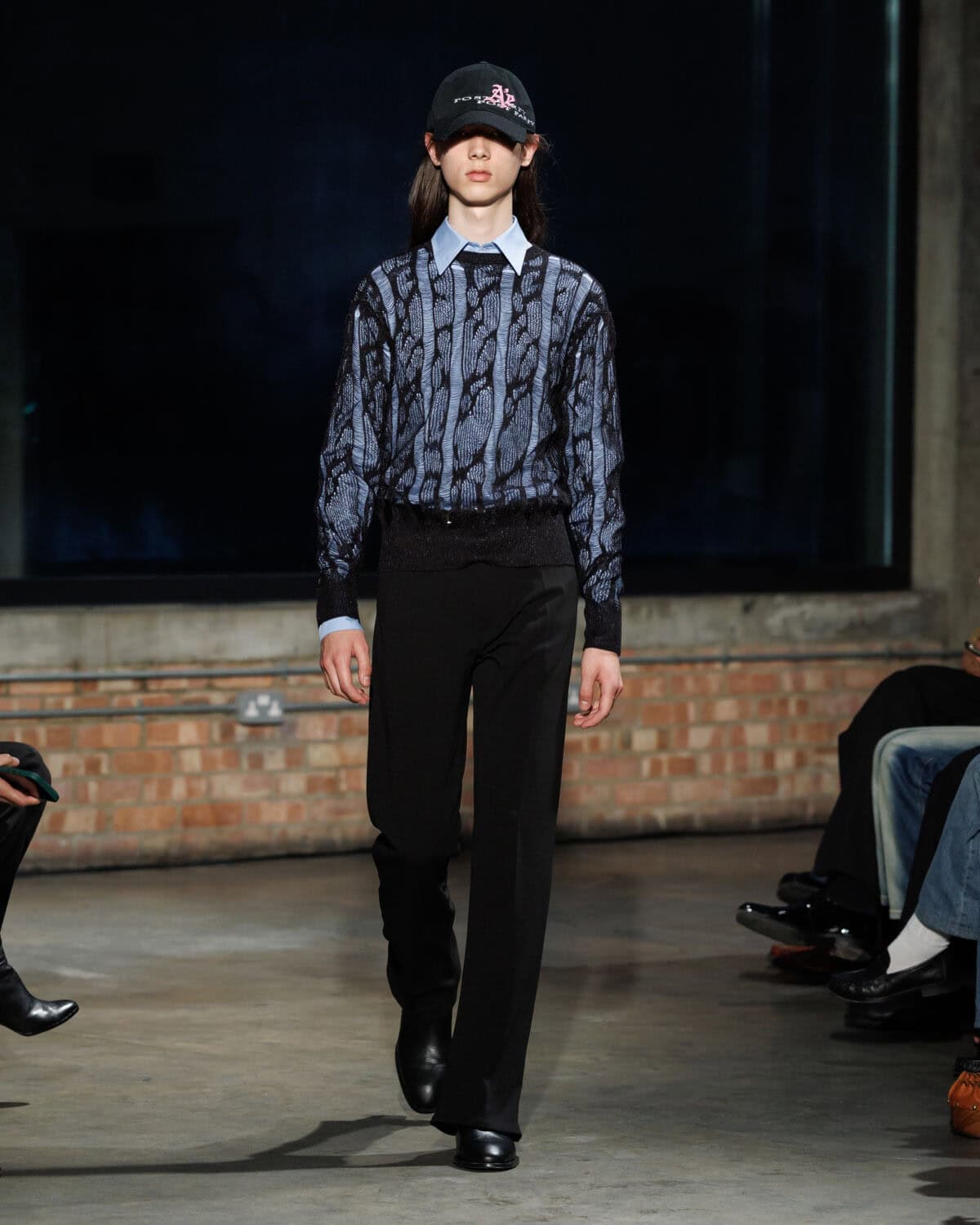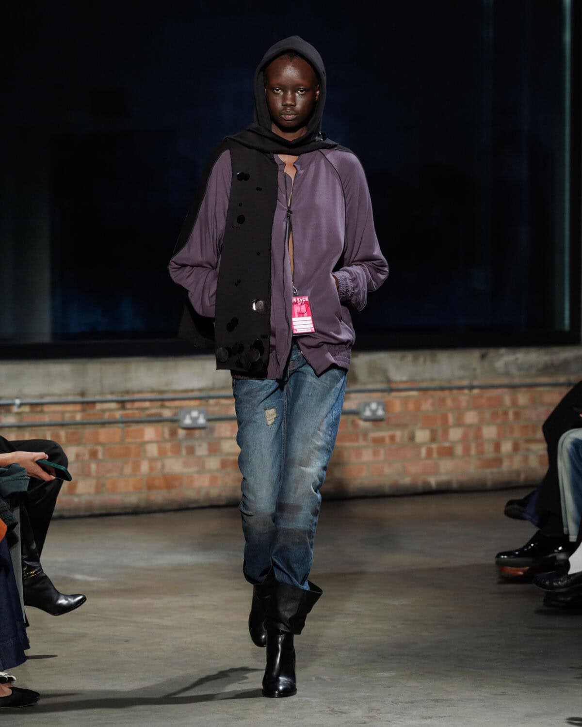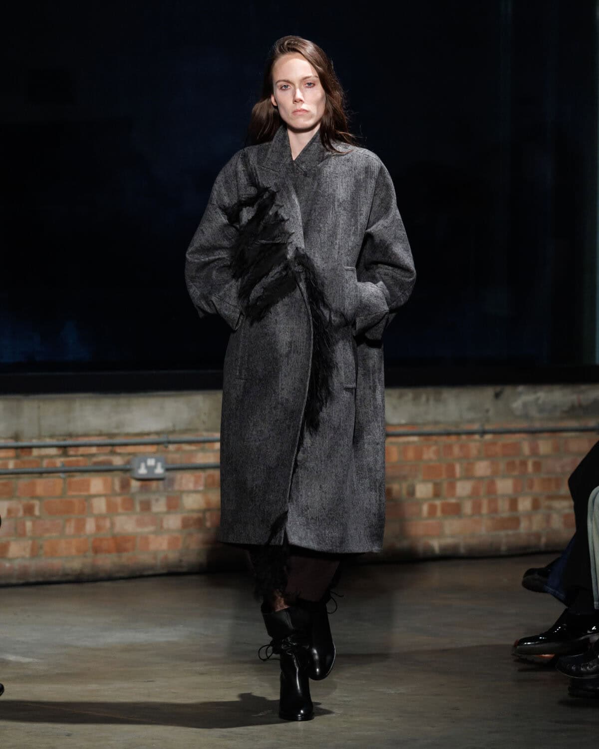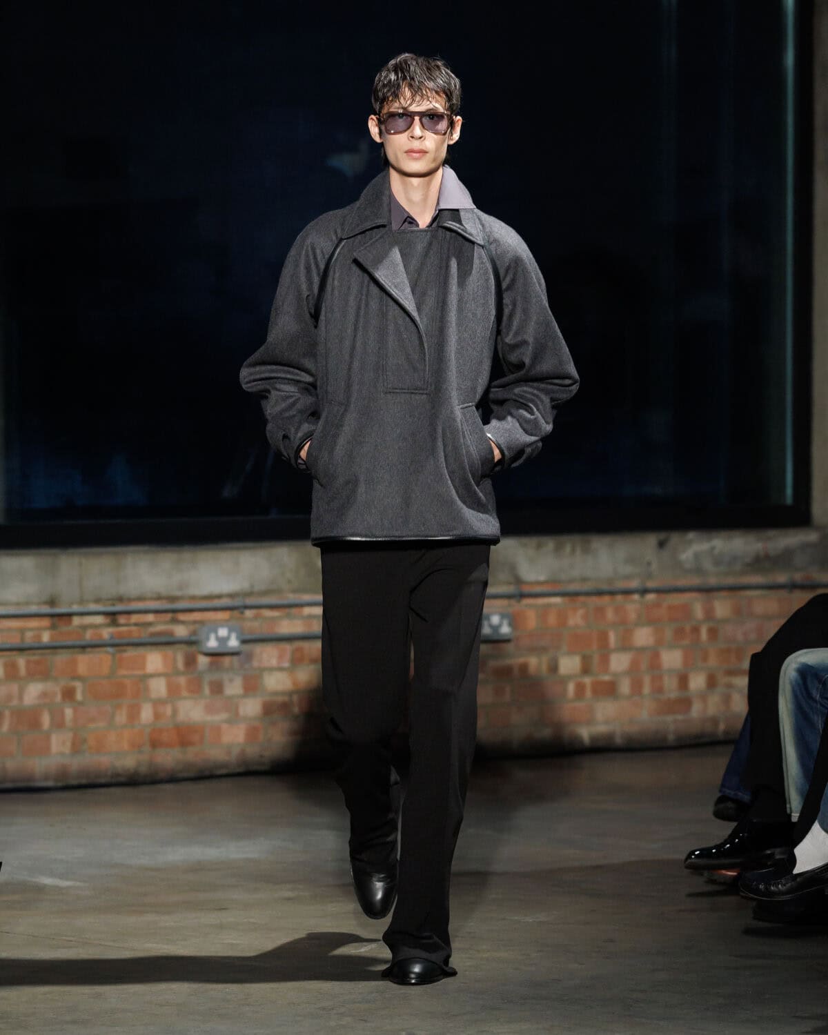 Aaron Esh whipped Saturday night into good shape with his elegant take on inner city cool, all to the best soundtrack of the season so far (Scouse rapper EsDeeKid into old Crystal Castles? Mega). Esh is particularly brilliant creating clothes with a lick of lived-in glamour. While he borrows techniques from 1930s couture and his tailoring has its sights on Savile Row, yet he designs for the everyday. His clothes feel more at home in basement clubs or Dalston boozers than snooty fashion happenings.