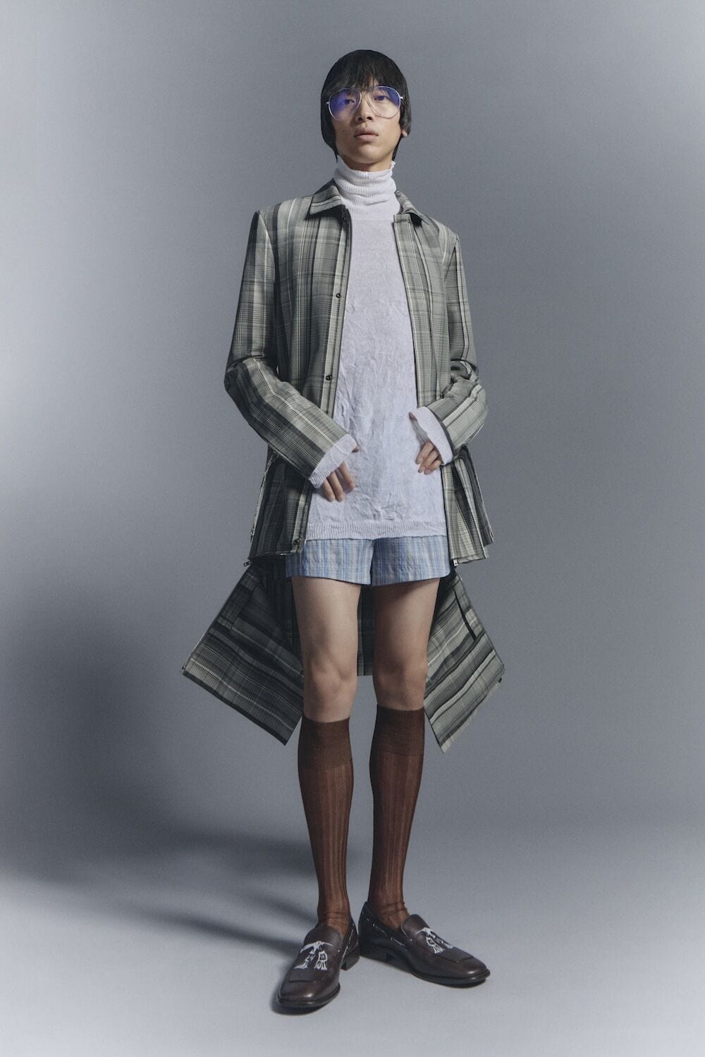 Staple hues and materials clash with curated abandon: acid turquoise cowboy boots, latex-coated denim, crinkled checks, neckties and chestnut leather loafers with funky painted tassels. There’s collegiate nostalgia throughout too, filtered through a kind of Swedish ennui.
