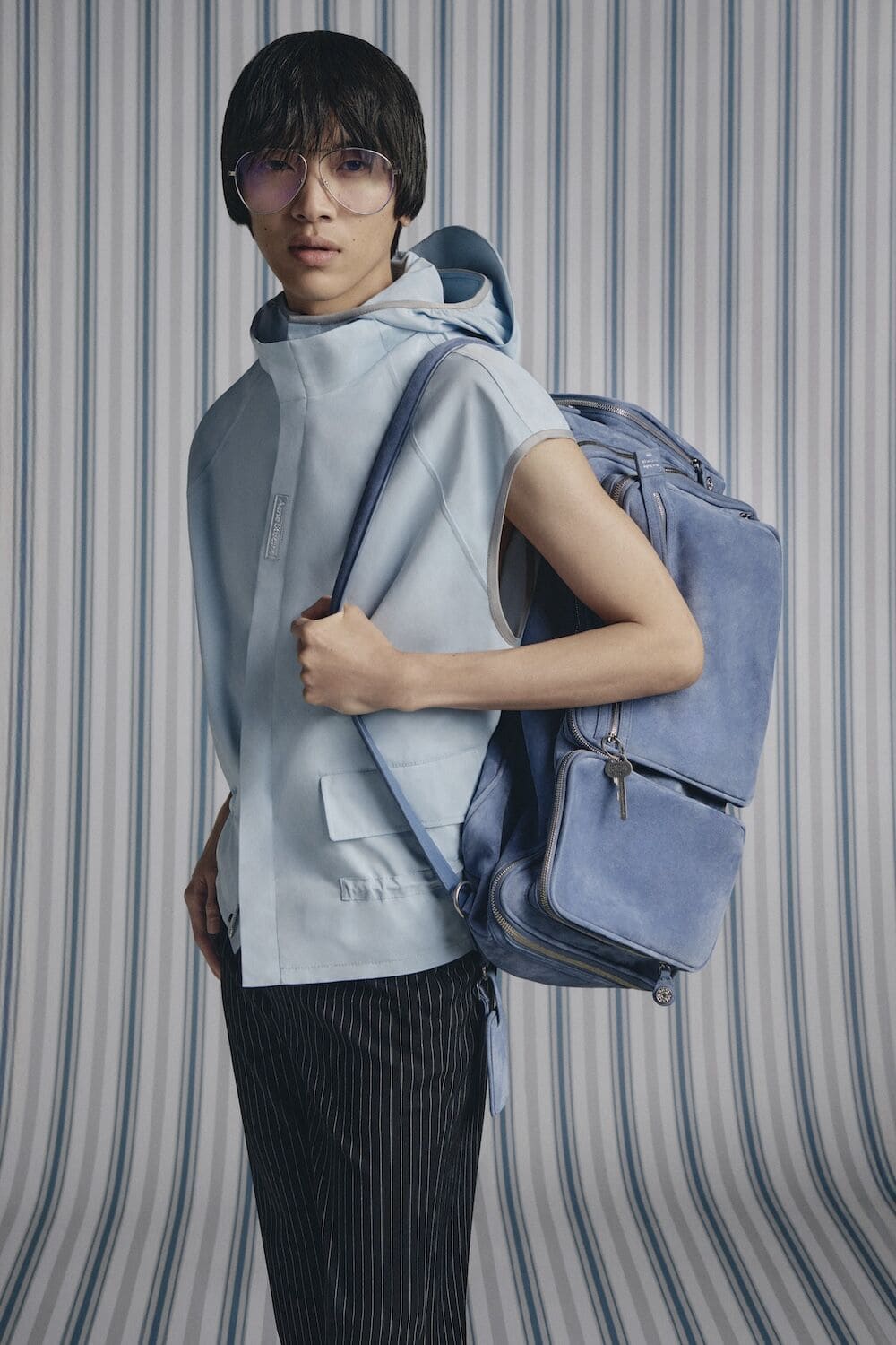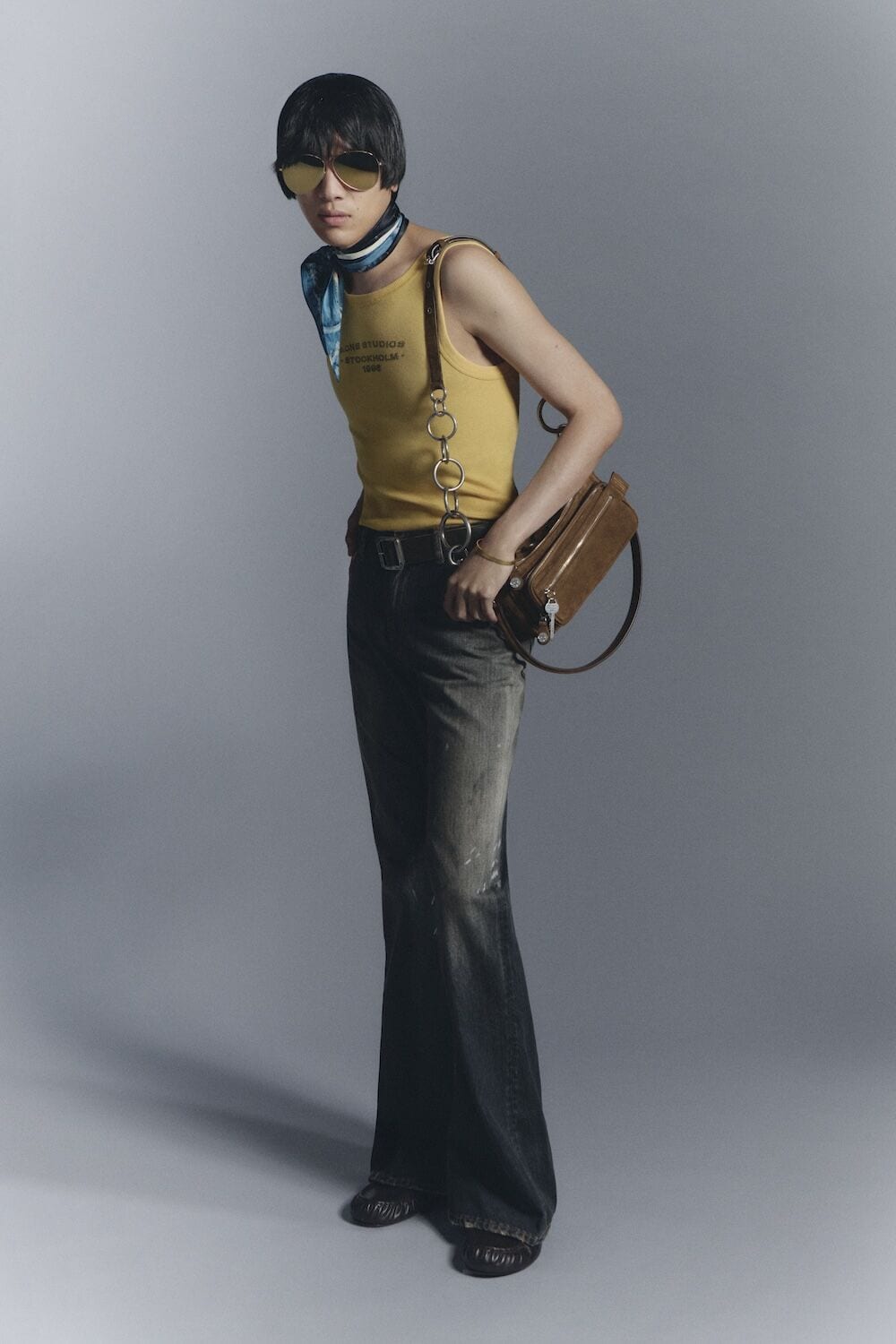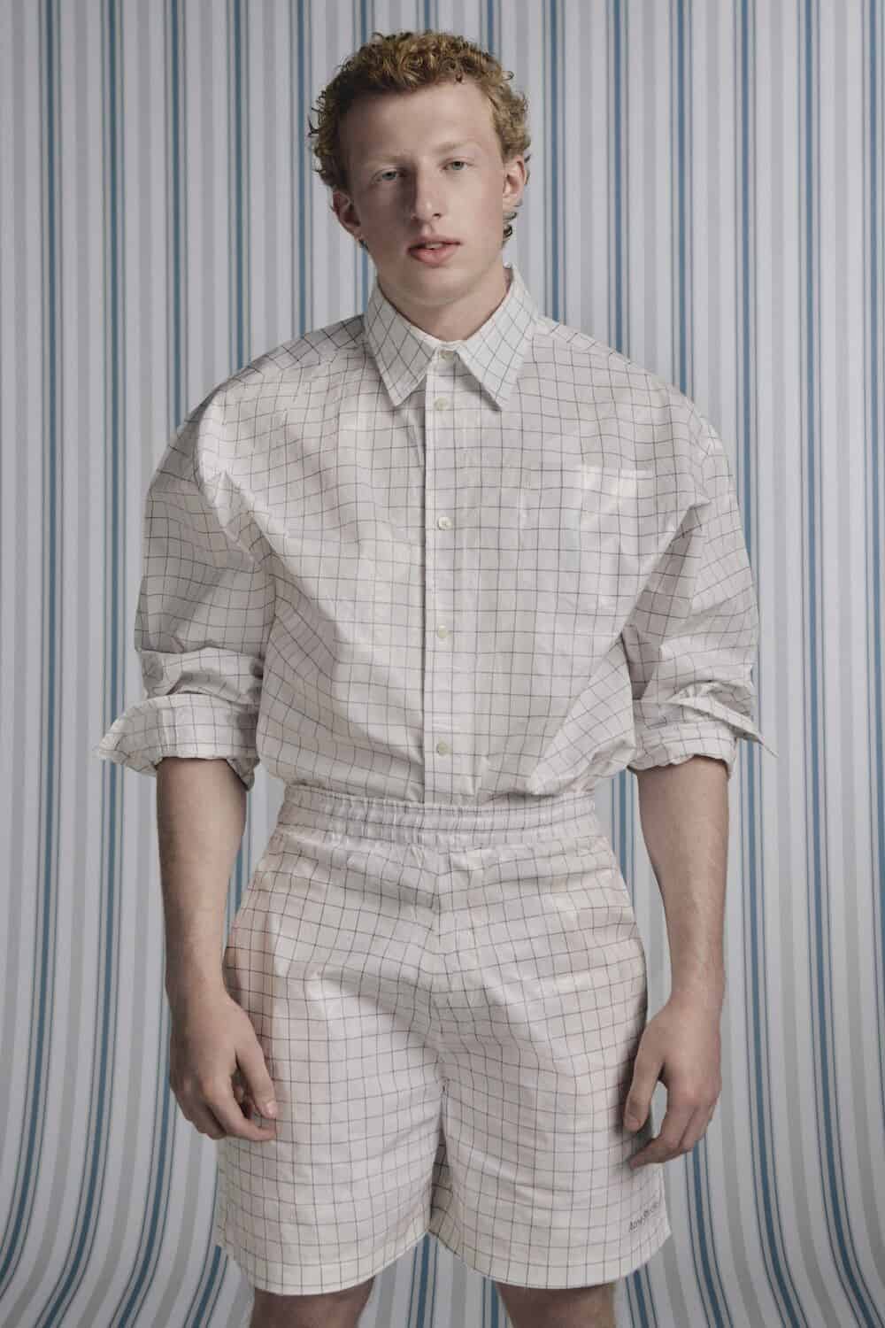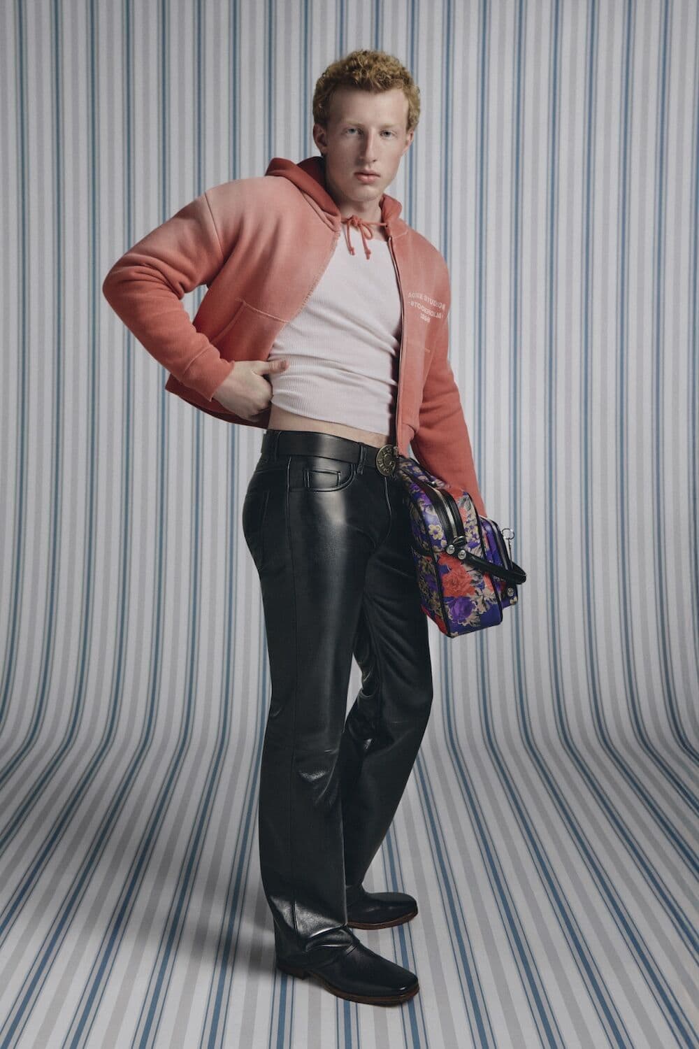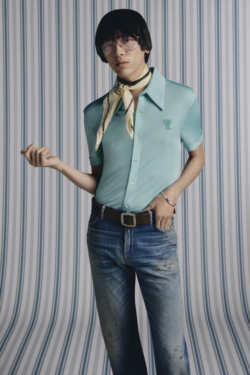 It’s not about polishing the Acne man into his final form. Instead, we meet him mid-transition, dressed up but not all the way – not yet a man, but not a boy either. The lookbook charts his evolving uniform – spliced suiting, shrunken T-shirts, pinstriped denim tuxedos and slouchy compartmented bags. Proportions hover in liminal spaces; fitted shirts hang past the hip, while vintage-cut jeans reappear boot-legged and boxy – cut with the volume of jogging bottoms.