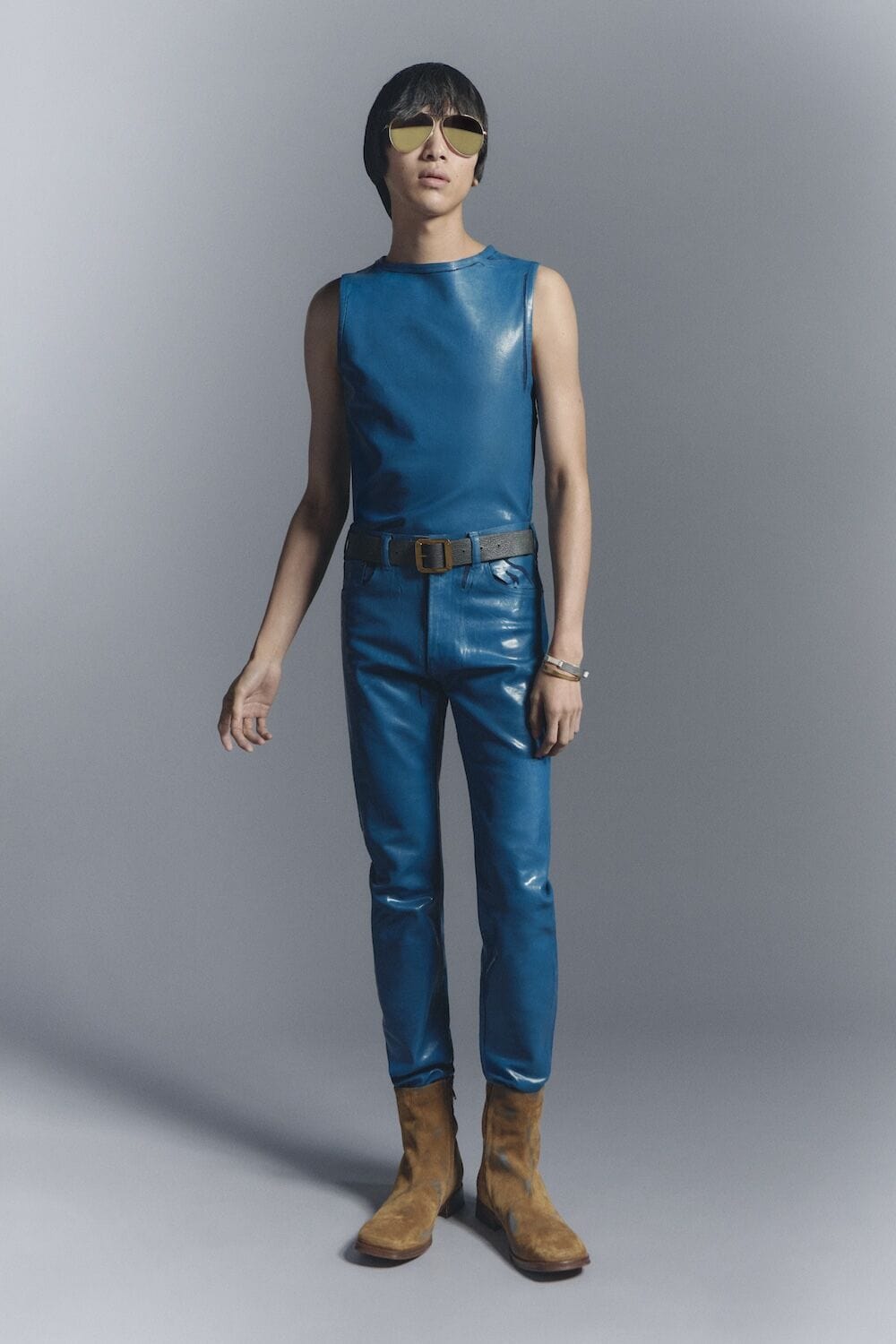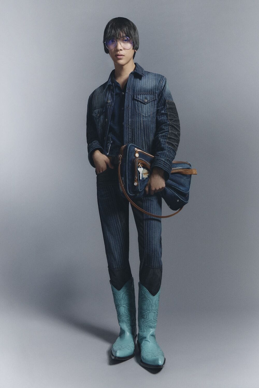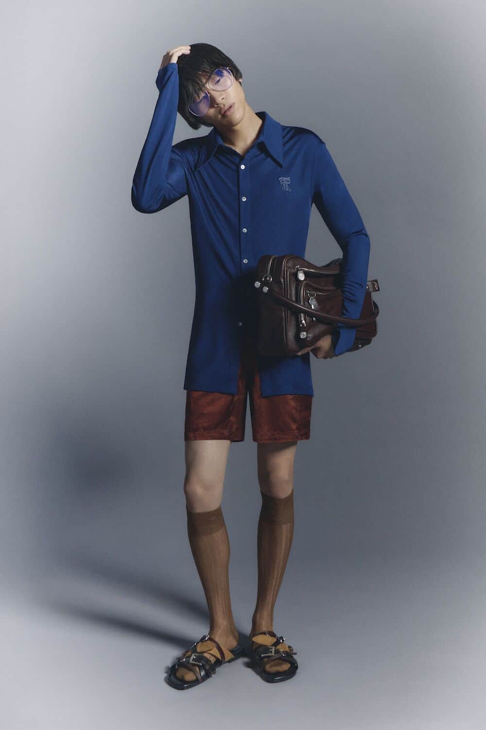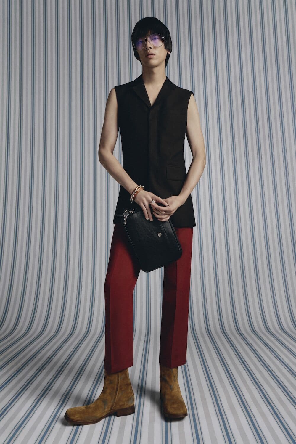 It’s not about polishing the Acne man into his final form. Instead, we meet him mid-transition, dressed up but not all the way – not yet a man, but not a boy either. The lookbook charts his evolving uniform – spliced suiting, shrunken T-shirts, pinstriped denim tuxedos and slouchy compartmented bags. Proportions hover in liminal spaces; fitted shirts hang past the hip, while vintage-cut jeans reappear boot-legged and boxy – cut with the volume of jogging bottoms.