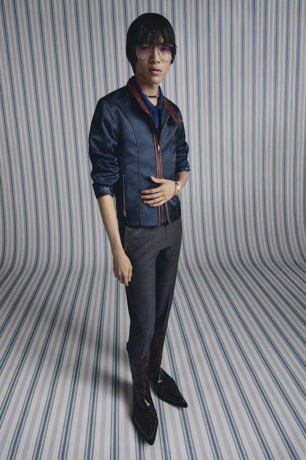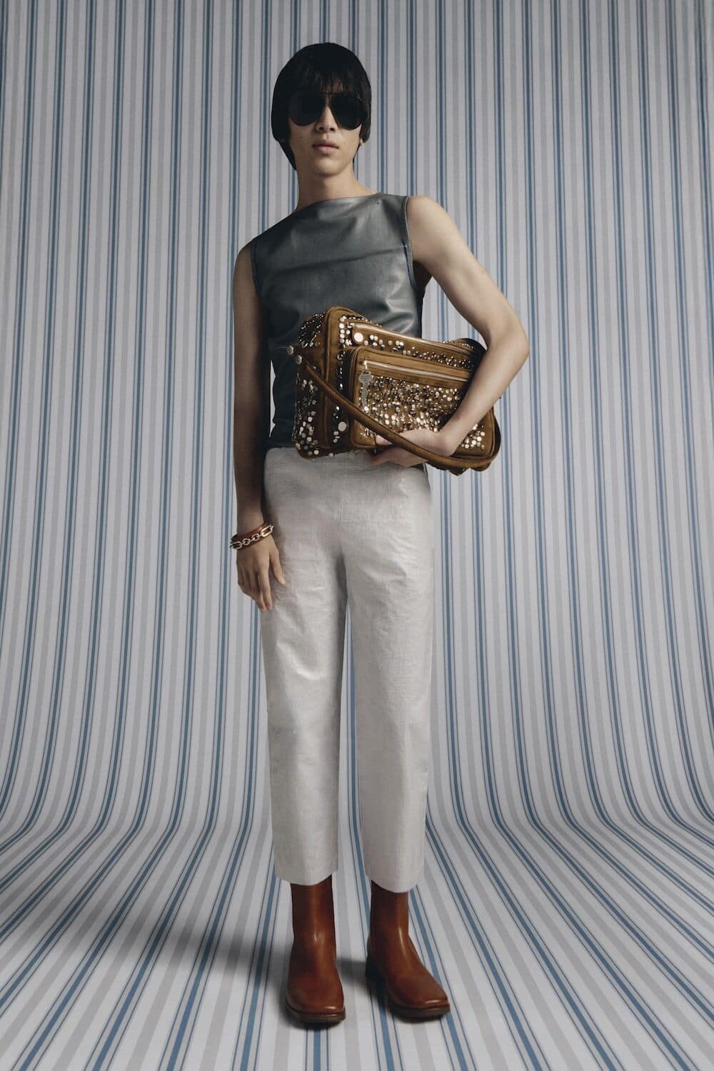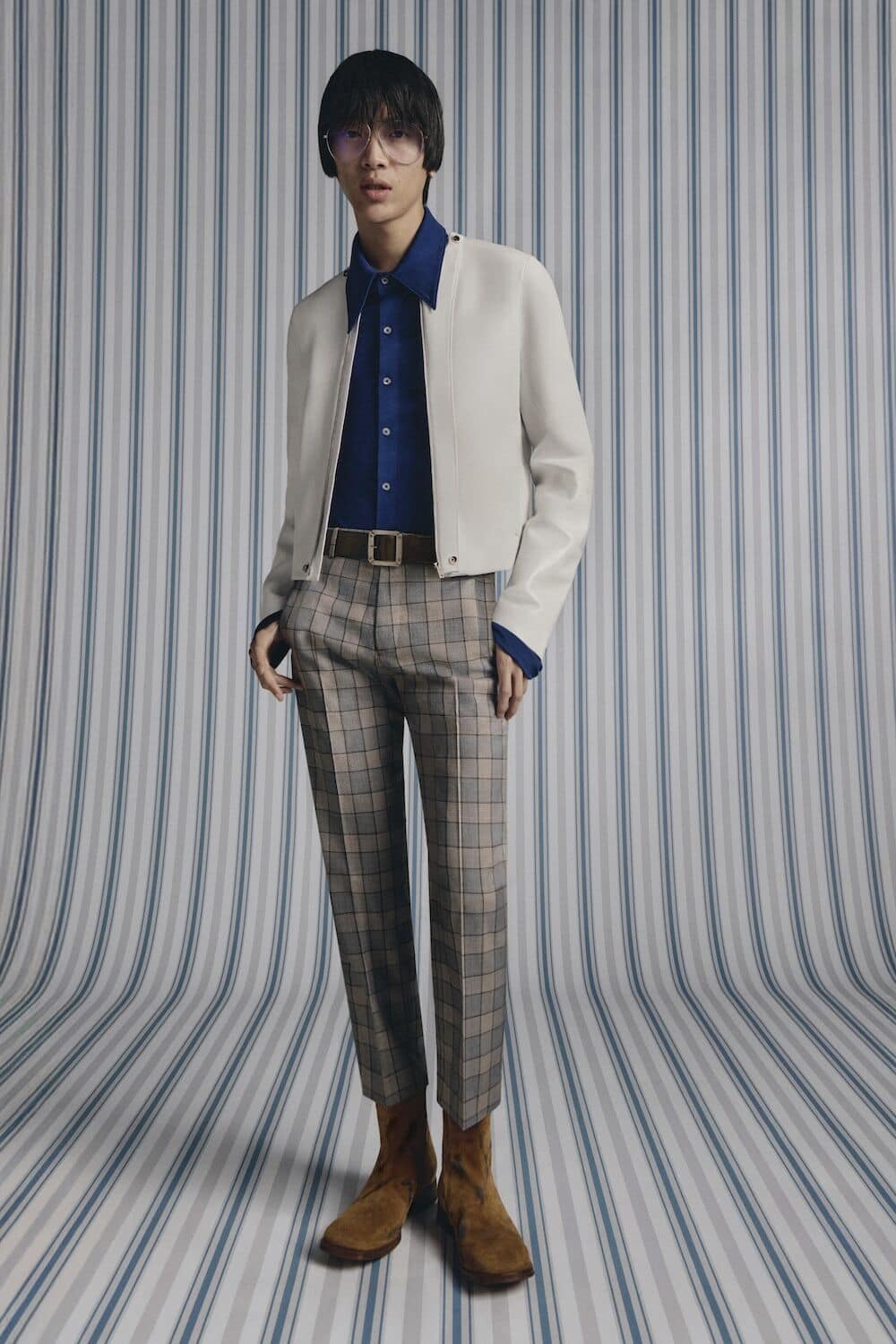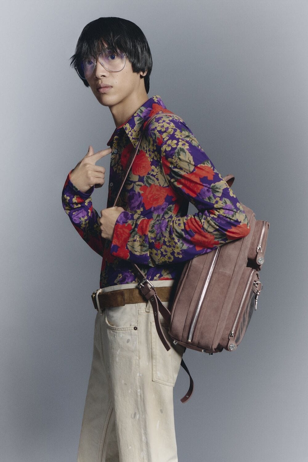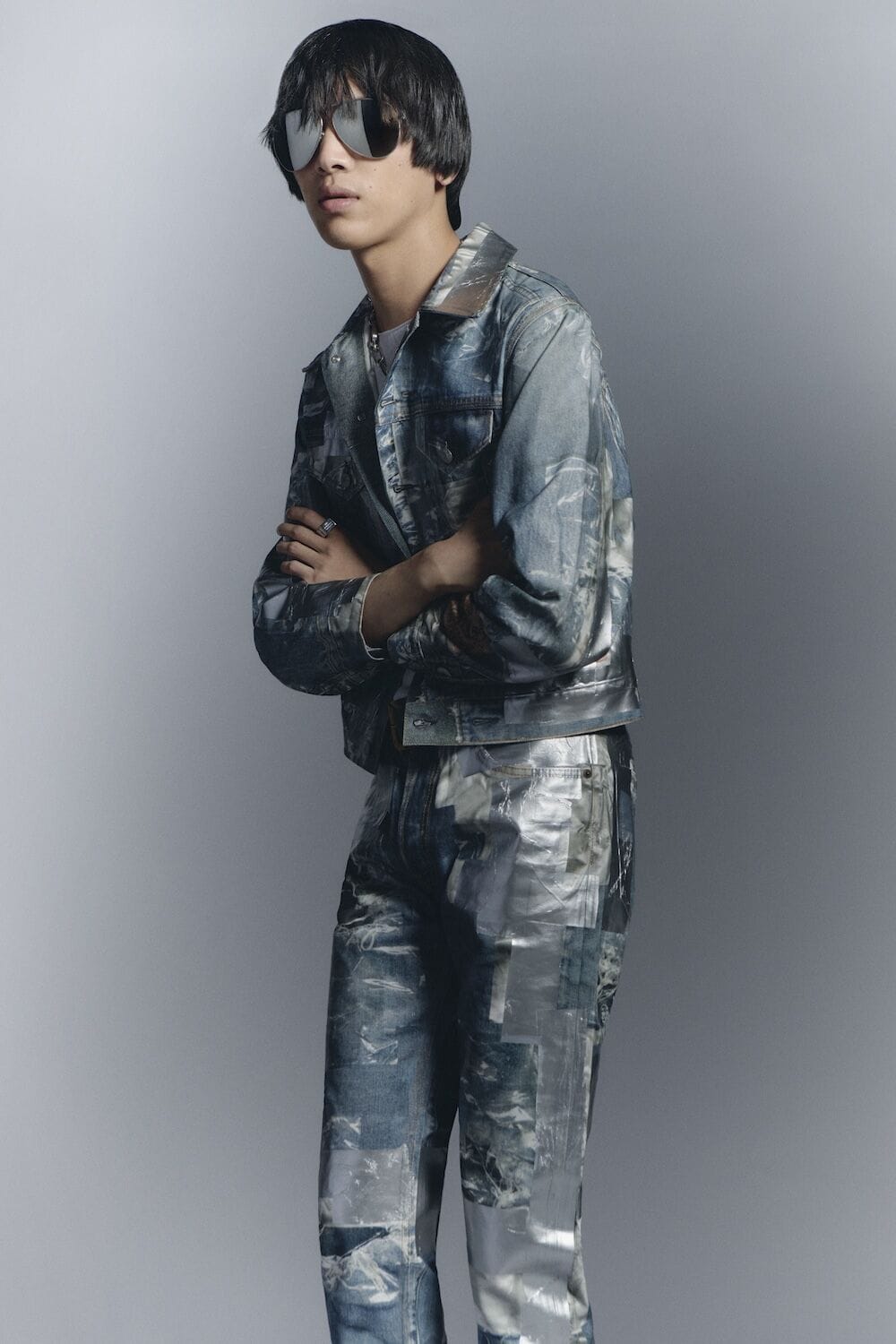 It’s not about polishing the Acne man into his final form. Instead, we meet him mid-transition, dressed up but not all the way – not yet a man, but not a boy either. The lookbook charts his evolving uniform – spliced suiting, shrunken T-shirts, pinstriped denim tuxedos and slouchy compartmented bags. Proportions hover in liminal spaces; fitted shirts hang past the hip, while vintage-cut jeans reappear boot-legged and boxy – cut with the volume of jogging bottoms.