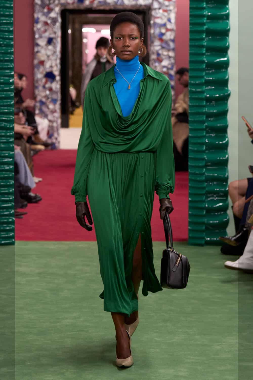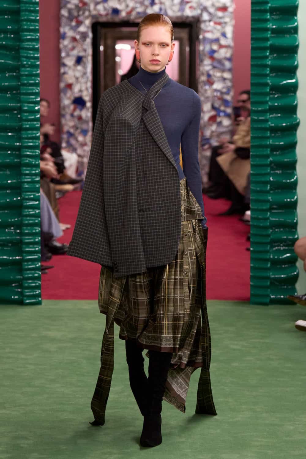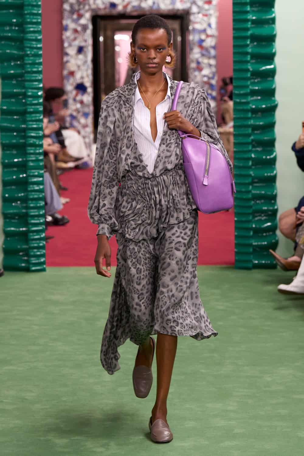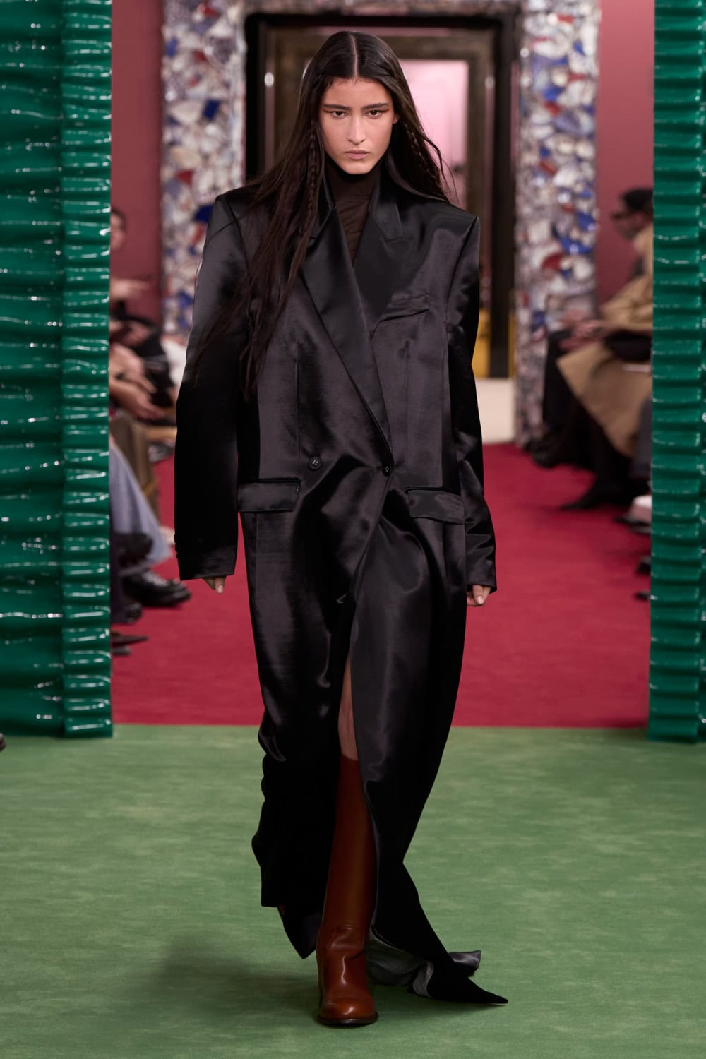 Silhouettes were at once precise – defined by tapered trousers and tight knee-high suede boots – and fluid, with long satin dresses draping over the boots. A similarly relaxed fit was found in the skirts and a dress printed with Paul Kooiker’s black and white portrait series of art school students – a nod to Acne’s unwavering commitment to creative collaboration. Finishing the looks: vintage-inspired eyewear with bright-hued lenses and a new single-handle bag design, as well as the house’s classic Camero.