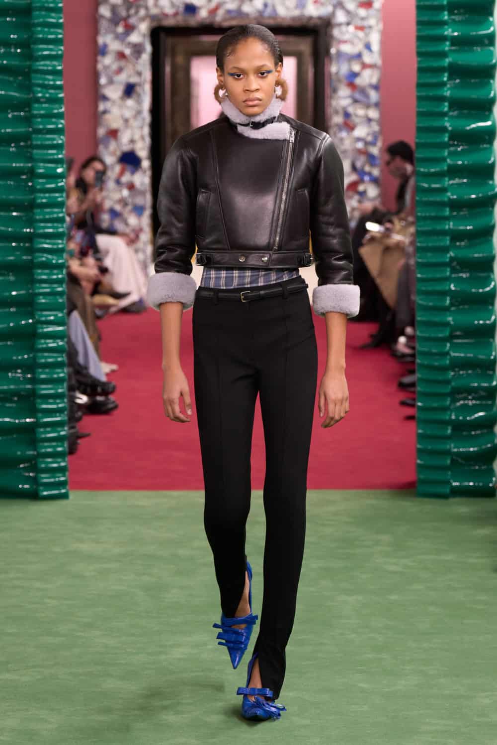 “I have a library in my mind,” said Acne co-founder and creative director Jonny Johansson ahead of the show, of “different historic moments, music references or cultural inspirations that feed the collective creation of the brand”. It is no surprise, then, that the looks presented on the coloured carpets of Collège des Bernardins were a dynamic mix of aristocratic dress codes, ’90s inspirations and Scandi minimalism. Take the biker and aviator jackets – here cropped, fitted and reinvented in punchy tones – or the sharp tailored jackets slung informally across the models’ bodies: the collection constantly tapped into preppiness, only to jump straight back into playfulness.
