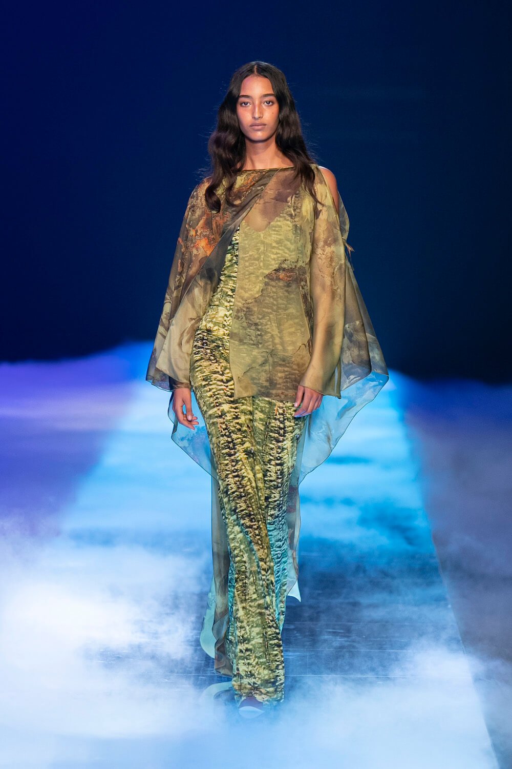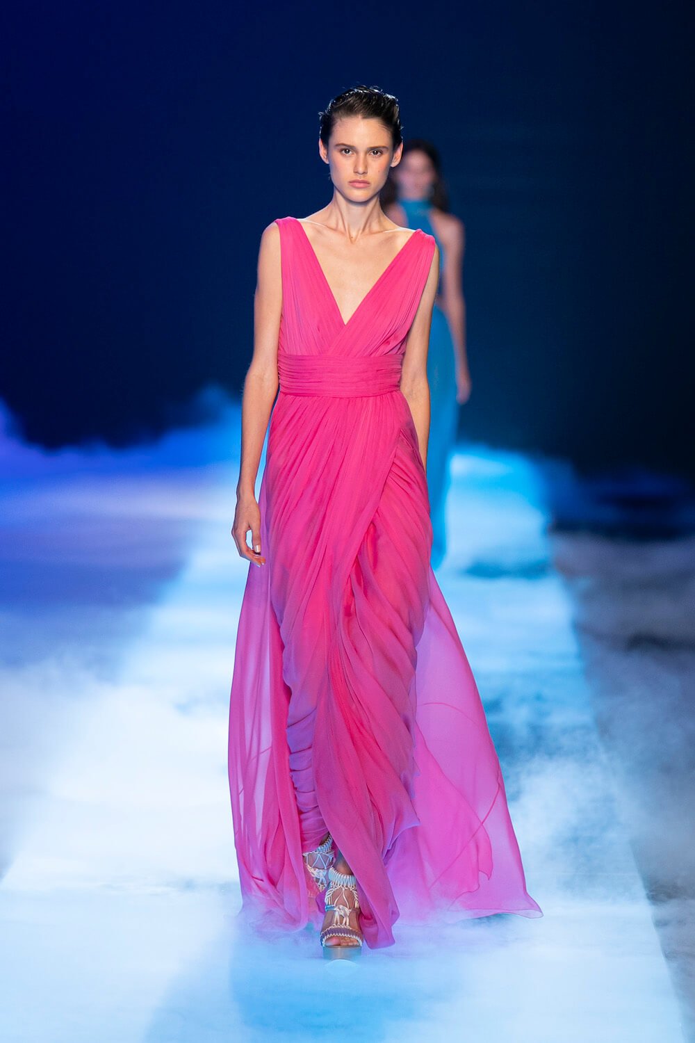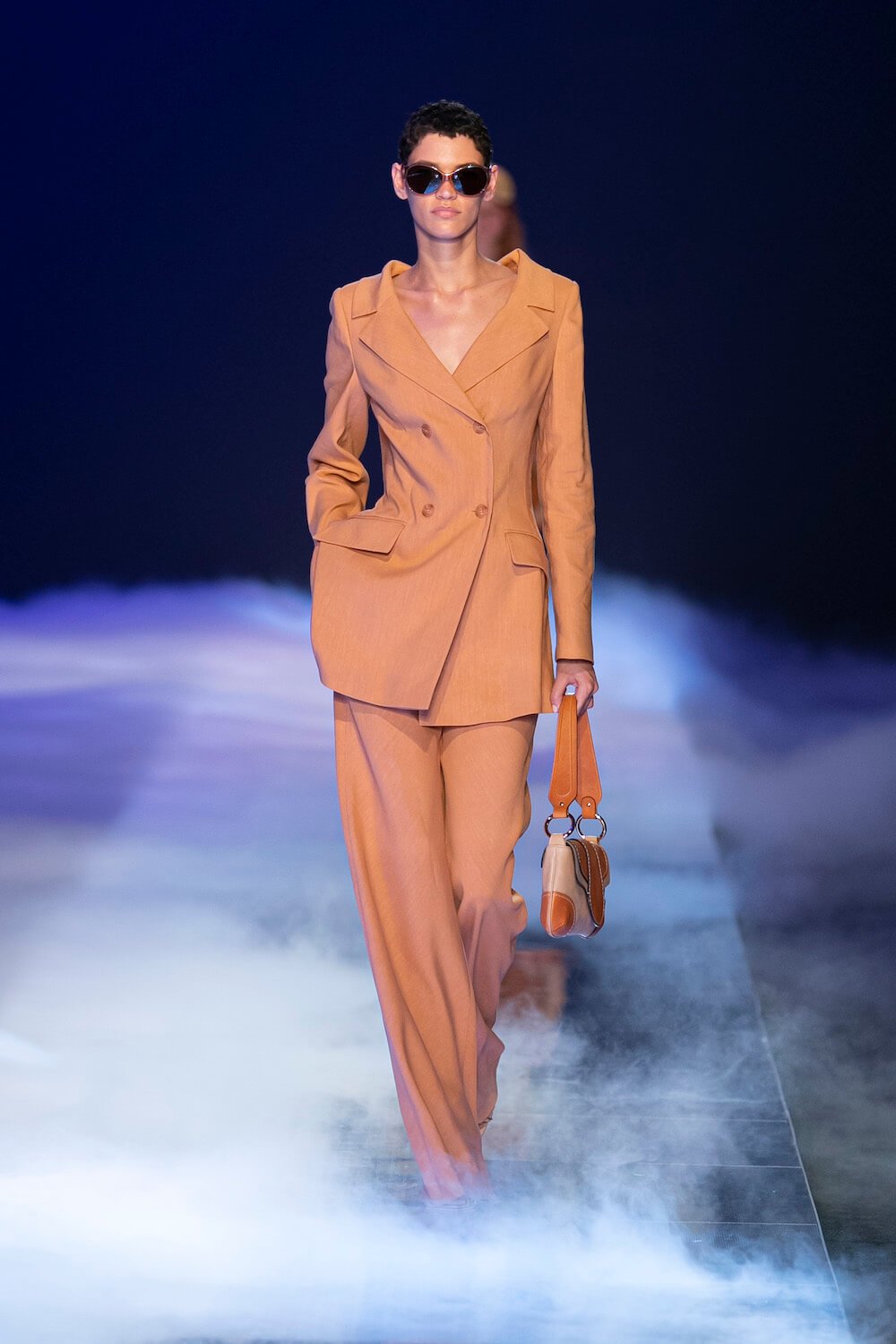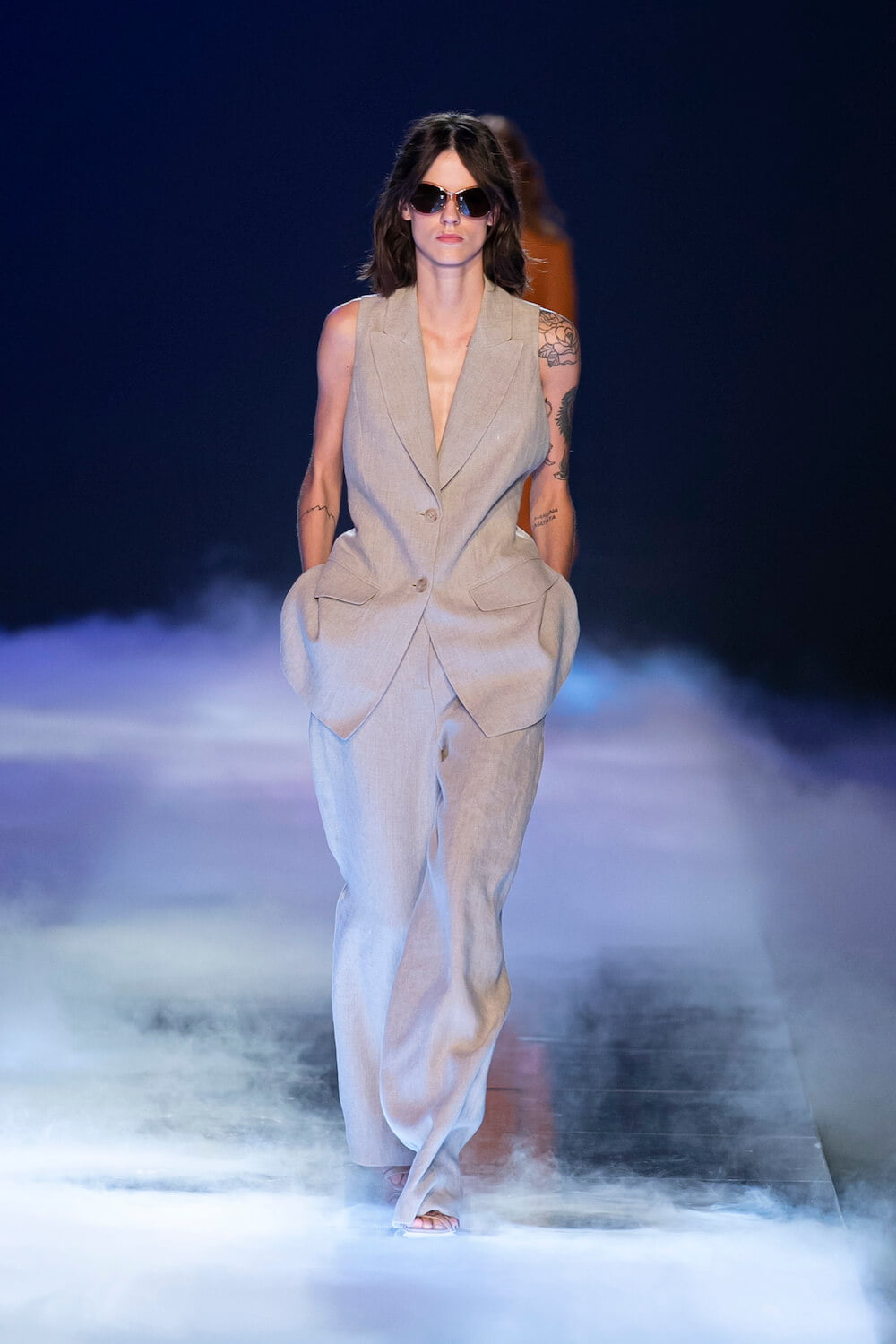 Veiled by a mirage-like mist, Alberta Ferretti’s seaside-resort-ready collection for SS23 was a hazy hymn to lightness and fluidity – no doubt, the smoke machines were hard at work. Named Wanderlust, an air of adventure prevailed, evoked in the precious elements from around the world that were woven into flowing frocks and tailoring to dance along the foggy footway. It was clothes for global citizens; travel-inflected clothing that became impalpable in the field jackets, blazers and sartorially splendid loose-fit suits. The tangy palette, too, felt fresh – think electric blue, calm clementine, fuchsia, burnt sienna, grass green, tobacco and amethyst. Peeking out from under liquid panels, bare skin turned heads while vests and jackets fall into handkerchief hems and shredded strips of chiffon spilled from structured bodices.