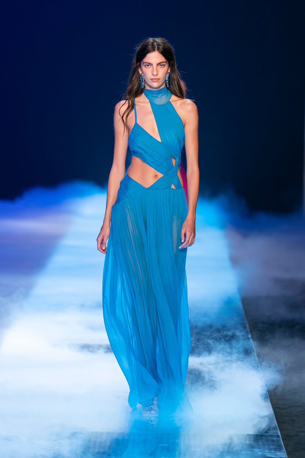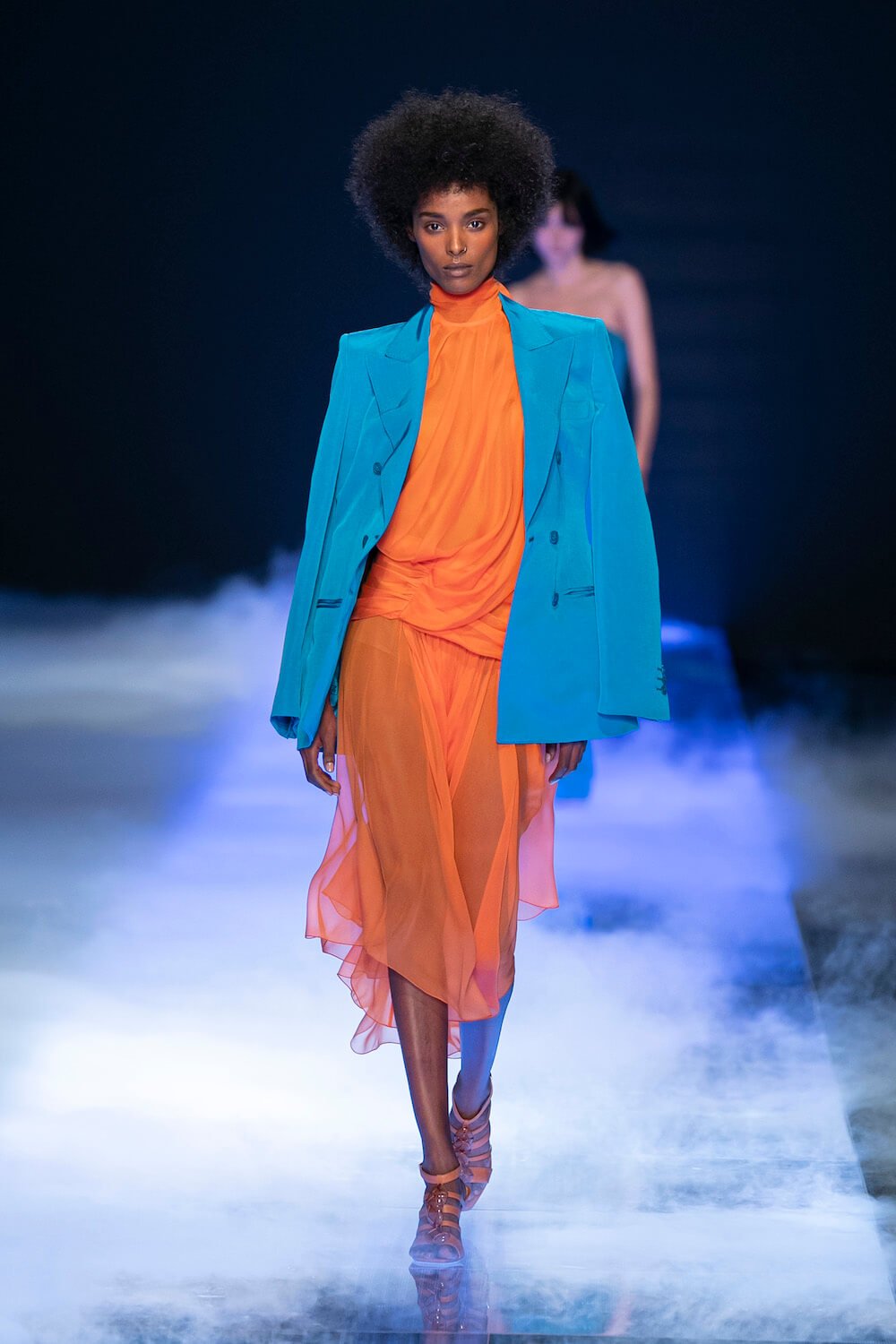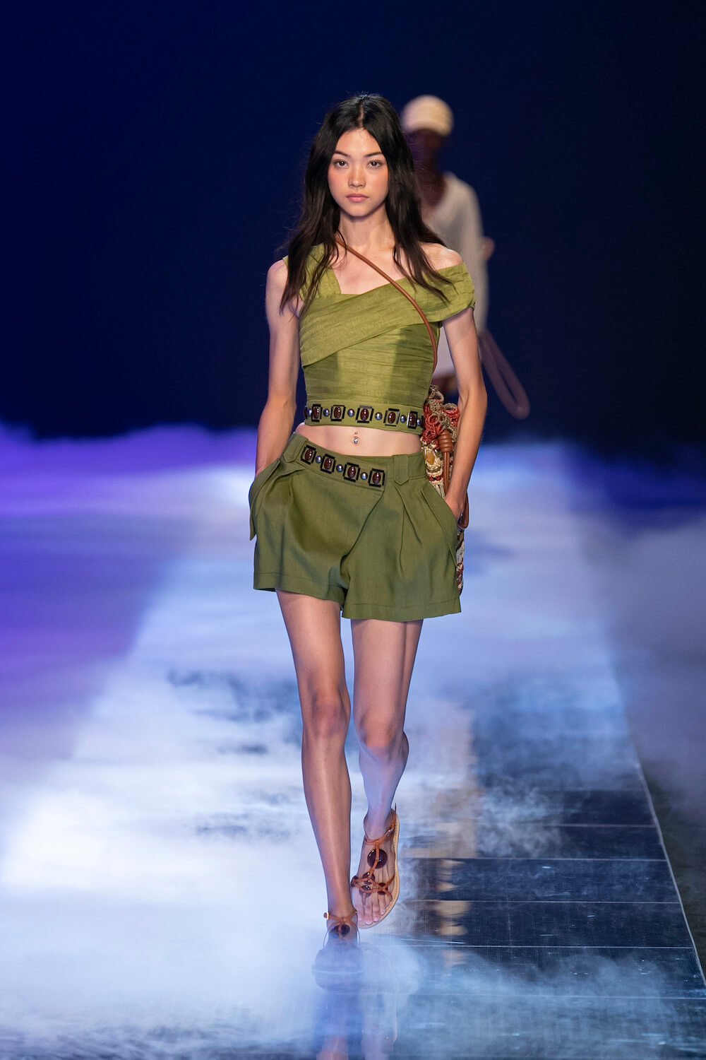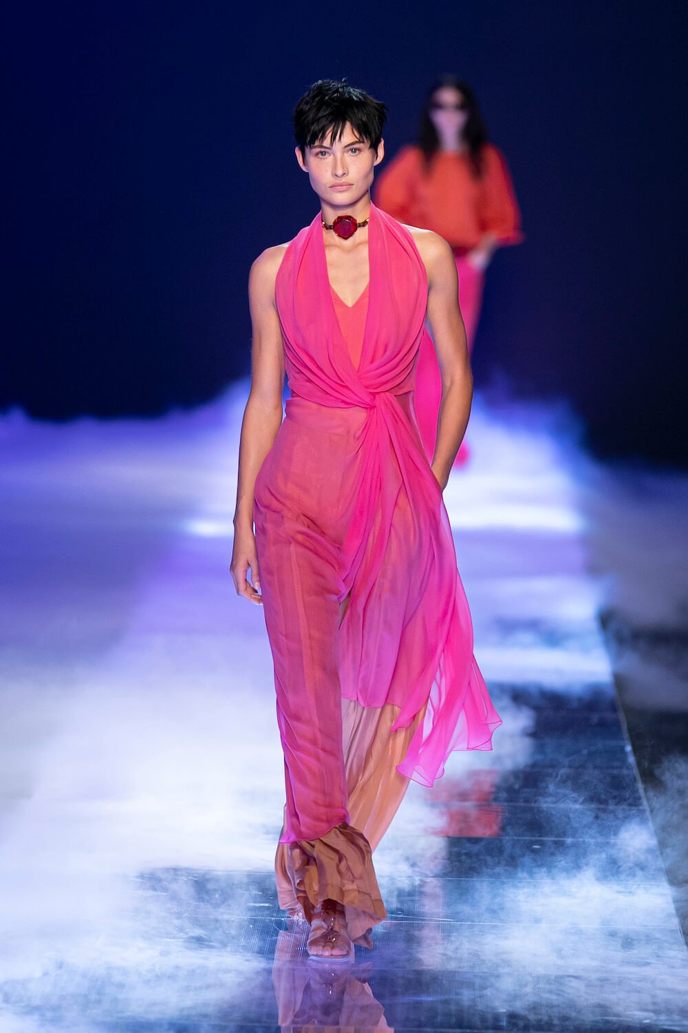 Veiled by a mirage-like mist, Alberta Ferretti’s seaside-resort-ready collection for SS23 was a hazy hymn to lightness and fluidity – no doubt, the smoke machines were hard at work. Named Wanderlust, an air of adventure prevailed, evoked in the precious elements from around the world that were woven into flowing frocks and tailoring to dance along the foggy footway. It was clothes for global citizens; travel-inflected clothing that became impalpable in the field jackets, blazers and sartorially splendid loose-fit suits. The tangy palette, too, felt fresh – think electric blue, calm clementine, fuchsia, burnt sienna, grass green, tobacco and amethyst. Peeking out from under liquid panels, bare skin turned heads while vests and jackets fall into handkerchief hems and shredded strips of chiffon spilled from structured bodices.