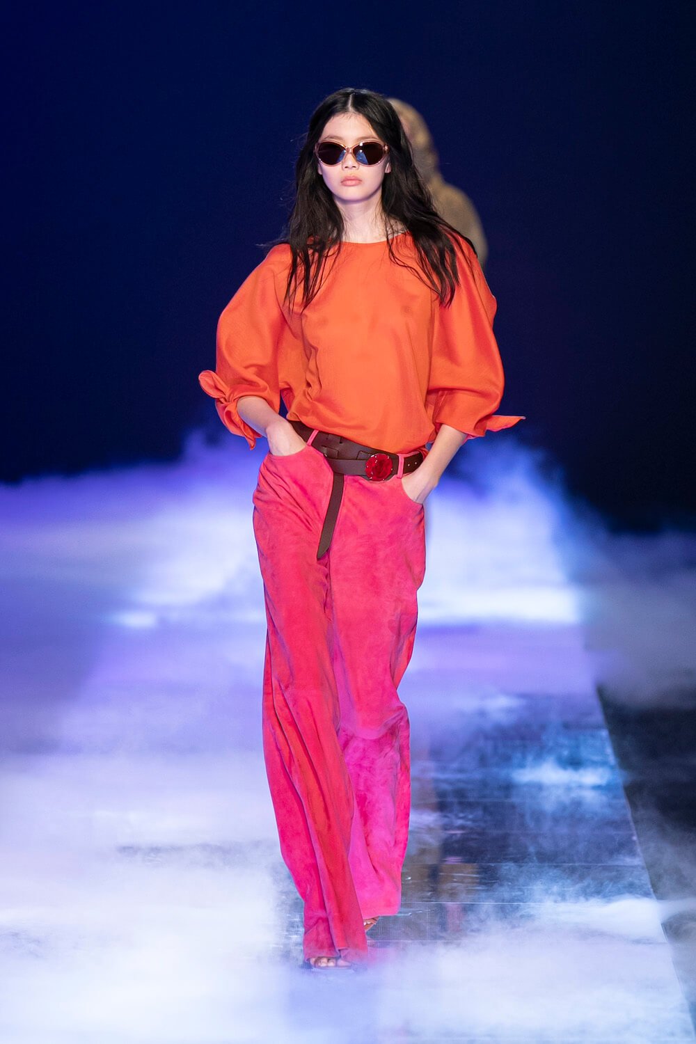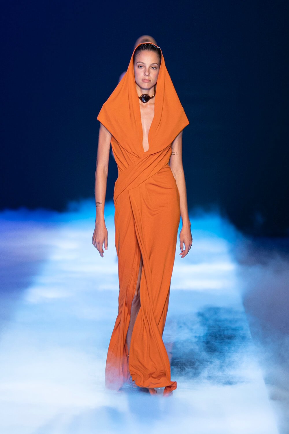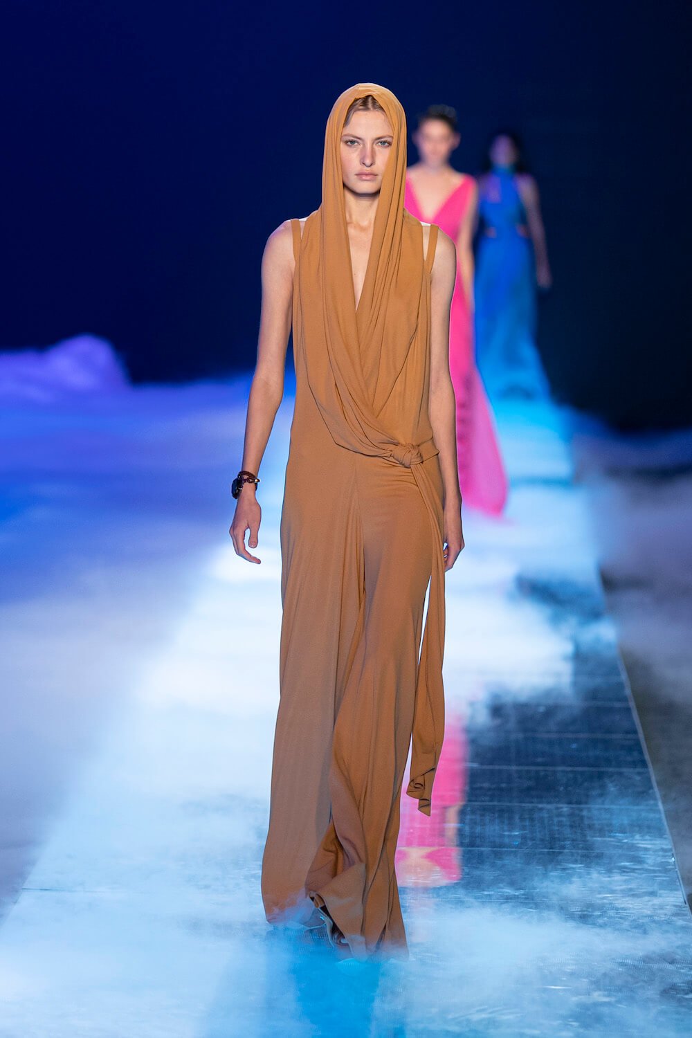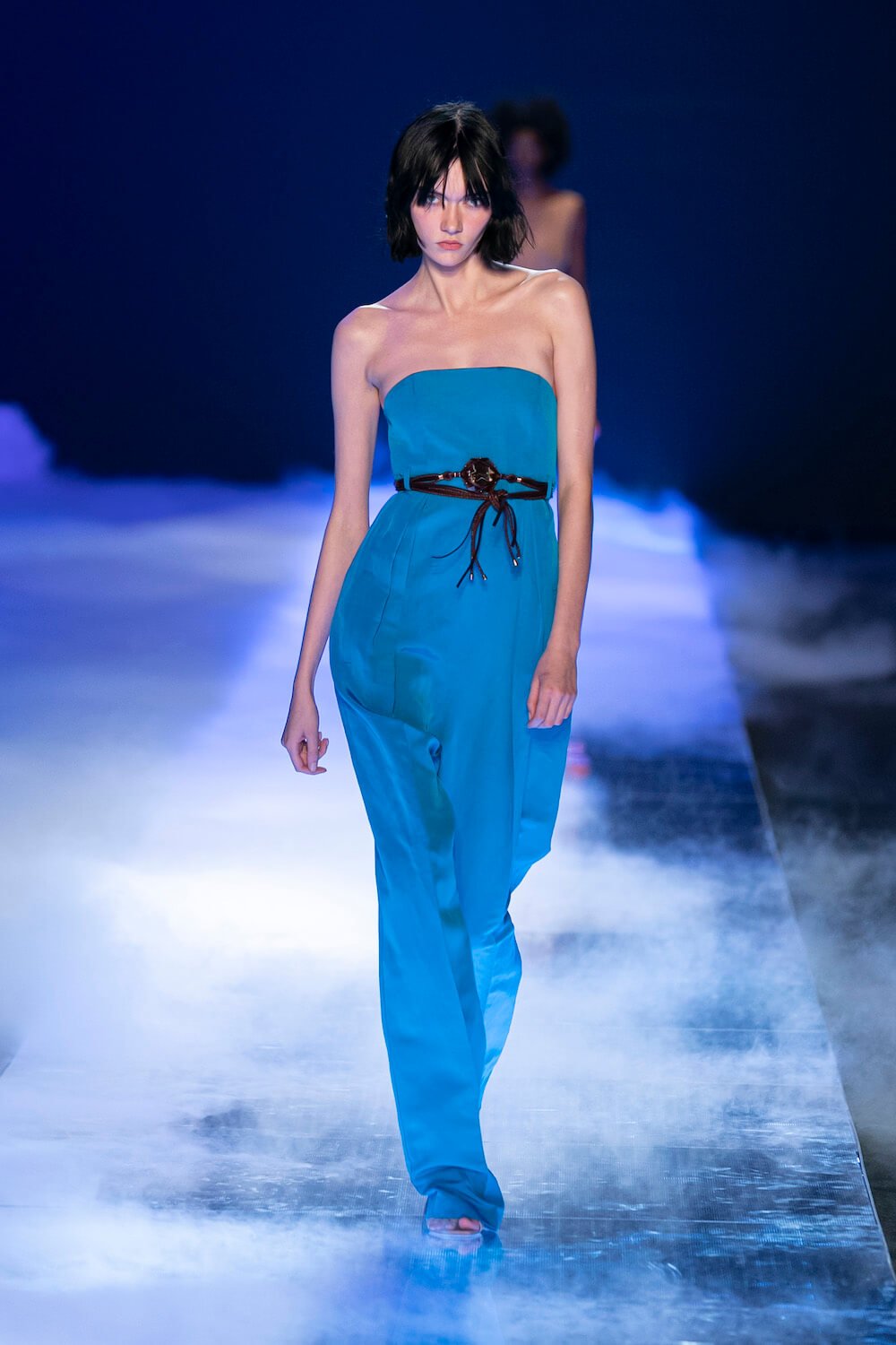 Veiled by a mirage-like mist, Alberta Ferretti’s seaside-resort-ready collection for SS23 was a hazy hymn to lightness and fluidity – no doubt, the smoke machines were hard at work. Named Wanderlust, an air of adventure prevailed, evoked in the precious elements from around the world that were woven into flowing frocks and tailoring to dance along the foggy footway. It was clothes for global citizens; travel-inflected clothing that became impalpable in the field jackets, blazers and sartorially splendid loose-fit suits. The tangy palette, too, felt fresh – think electric blue, calm clementine, fuchsia, burnt sienna, grass green, tobacco and amethyst. Peeking out from under liquid panels, bare skin turned heads while vests and jackets fall into handkerchief hems and shredded strips of chiffon spilled from structured bodices.