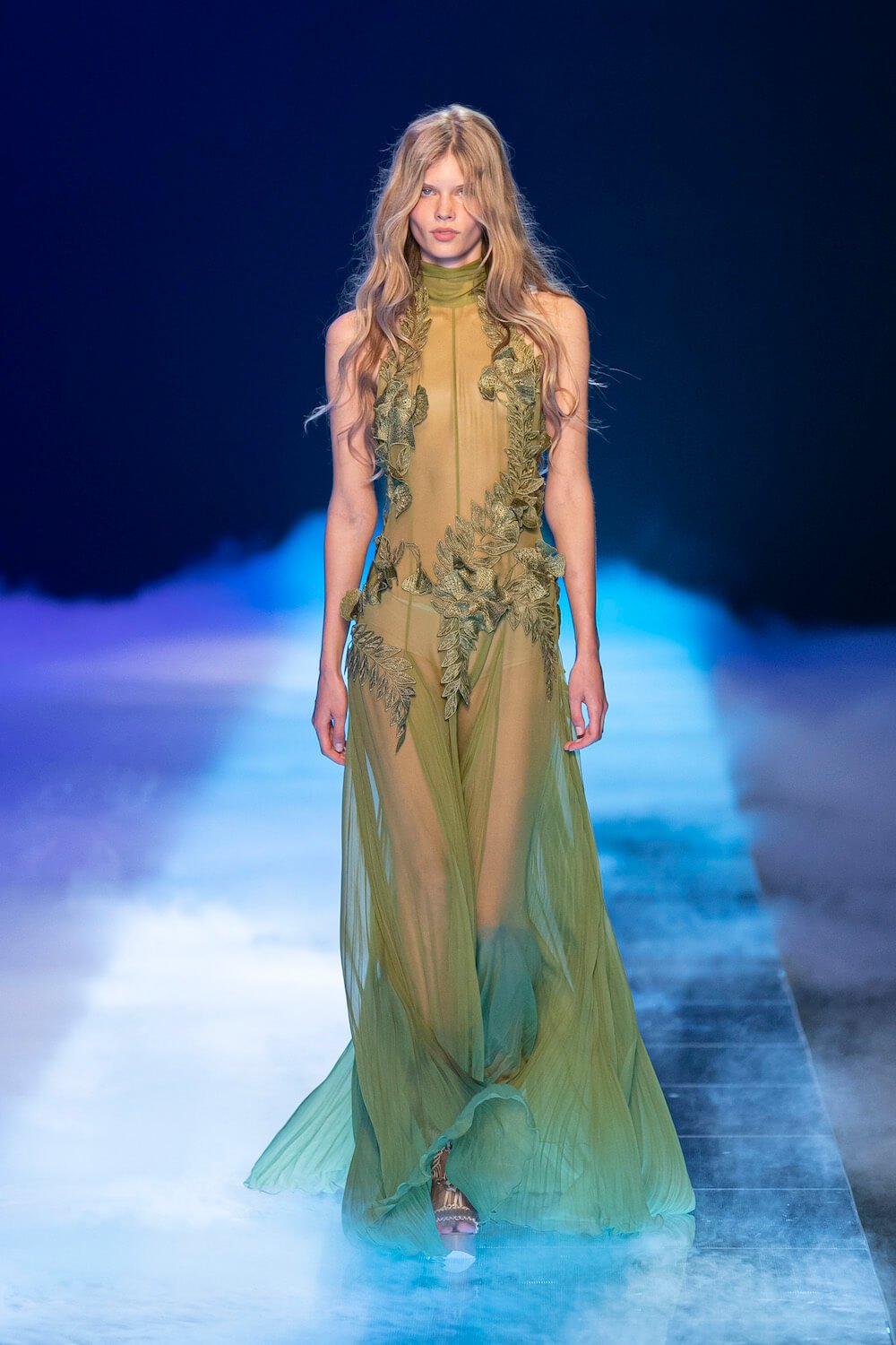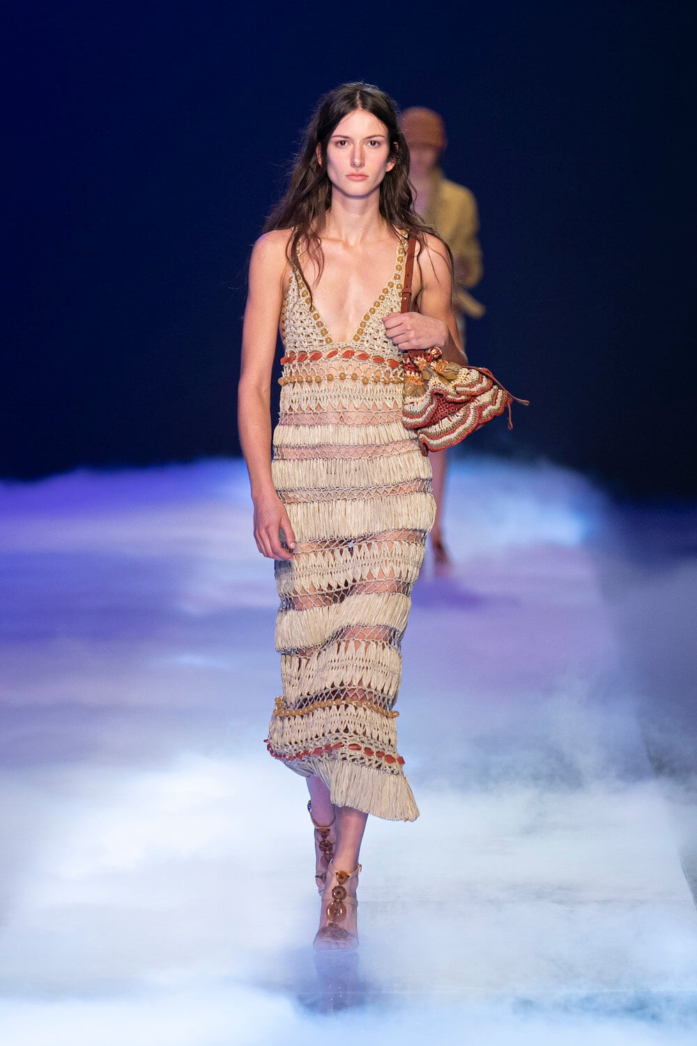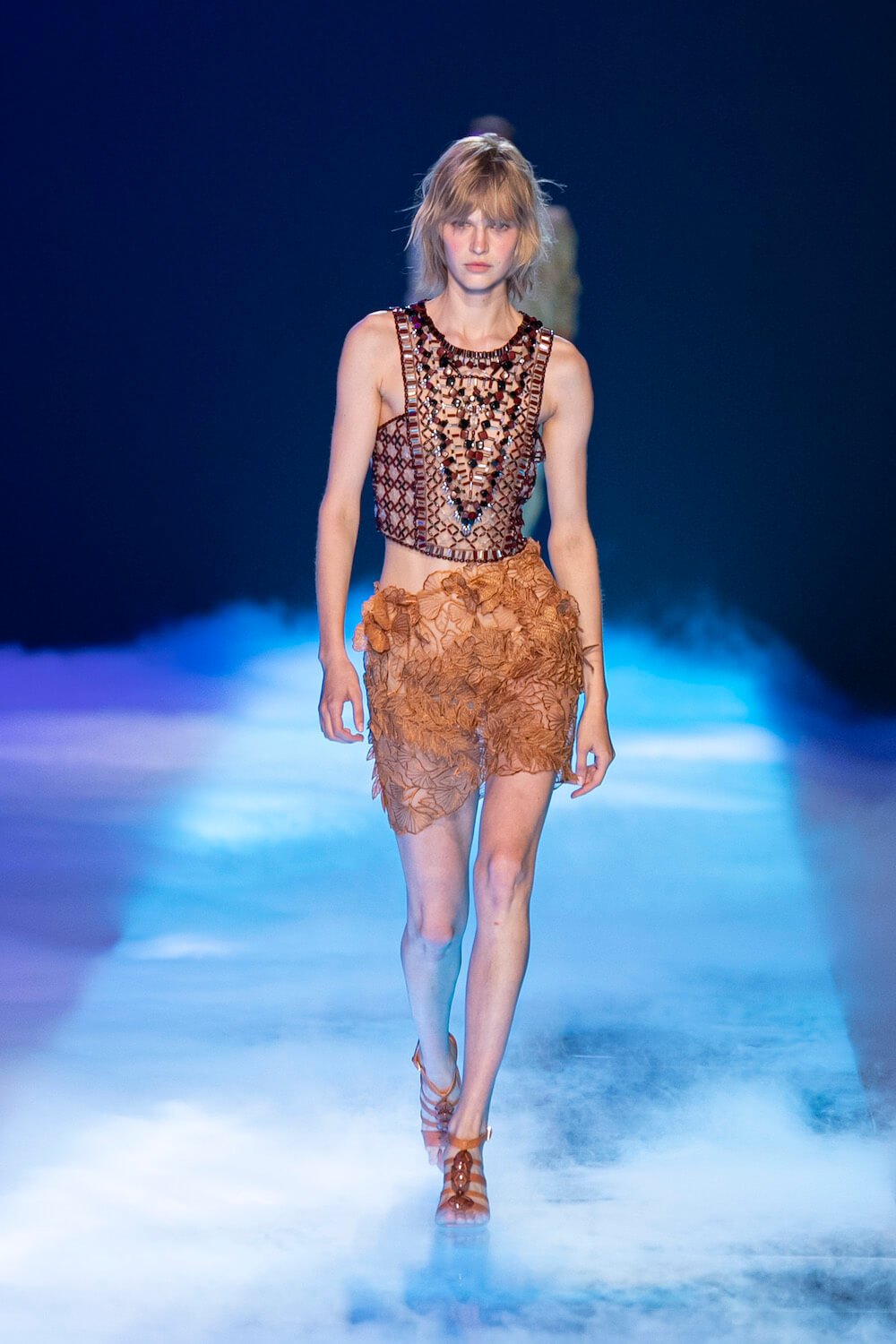 Ferretti didn’t hold back on the handicrafts either. A halter top with shorts and a bikini-top and miniskirt co-ord were made from crocheted raffia and embedded with the intercontinental stones aforementioned. For especially special occasions, botanical, chiffon dresses came delicately encrusted with macramé vines, sequins and organic ferns that crawled over the models. Dressed in Alberta Ferretti, they glowed.
