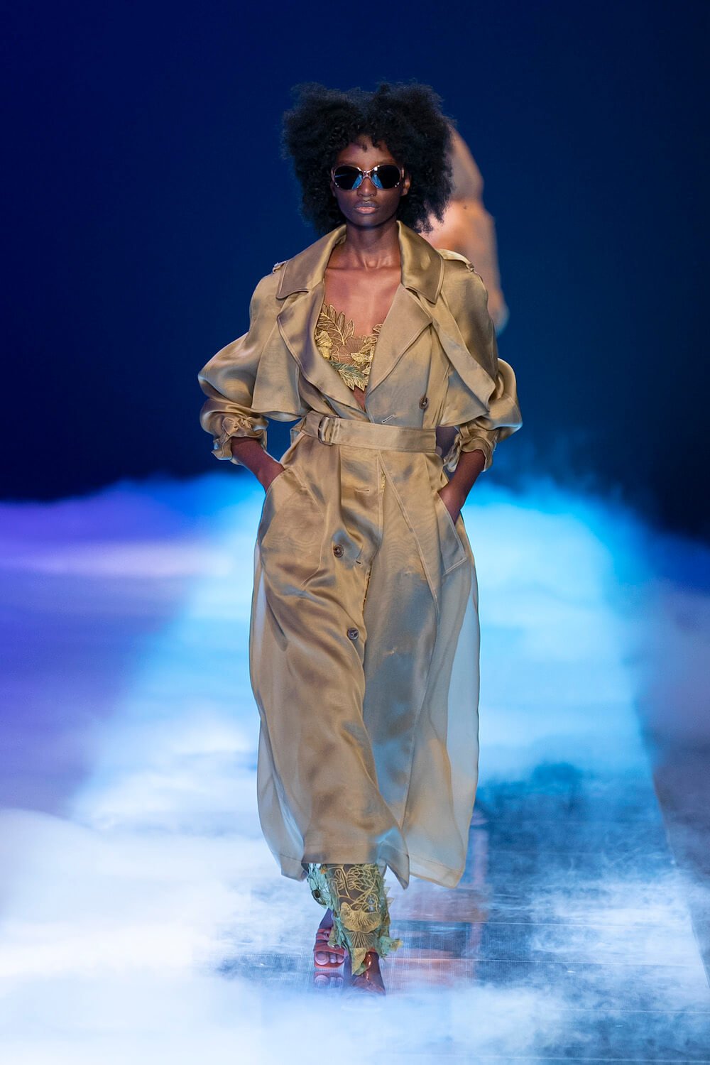 Where she was once known for party dresses, Ferretti is turning to daywear, creating more casual, tactile and timeless clothes. In recent years, she’s been delving into sportswear and even playing with old-western treatments such as lassoed cowboy hats and roper boots. This season’s dynamic daywear, however, worked with organza on expressive silhouettes including artisanal trench coats, hoodies, safari jackets and trousers. Sleeveless ecru suiting was rendered in linen too, while satin, silk and linen toile made up the rest.
