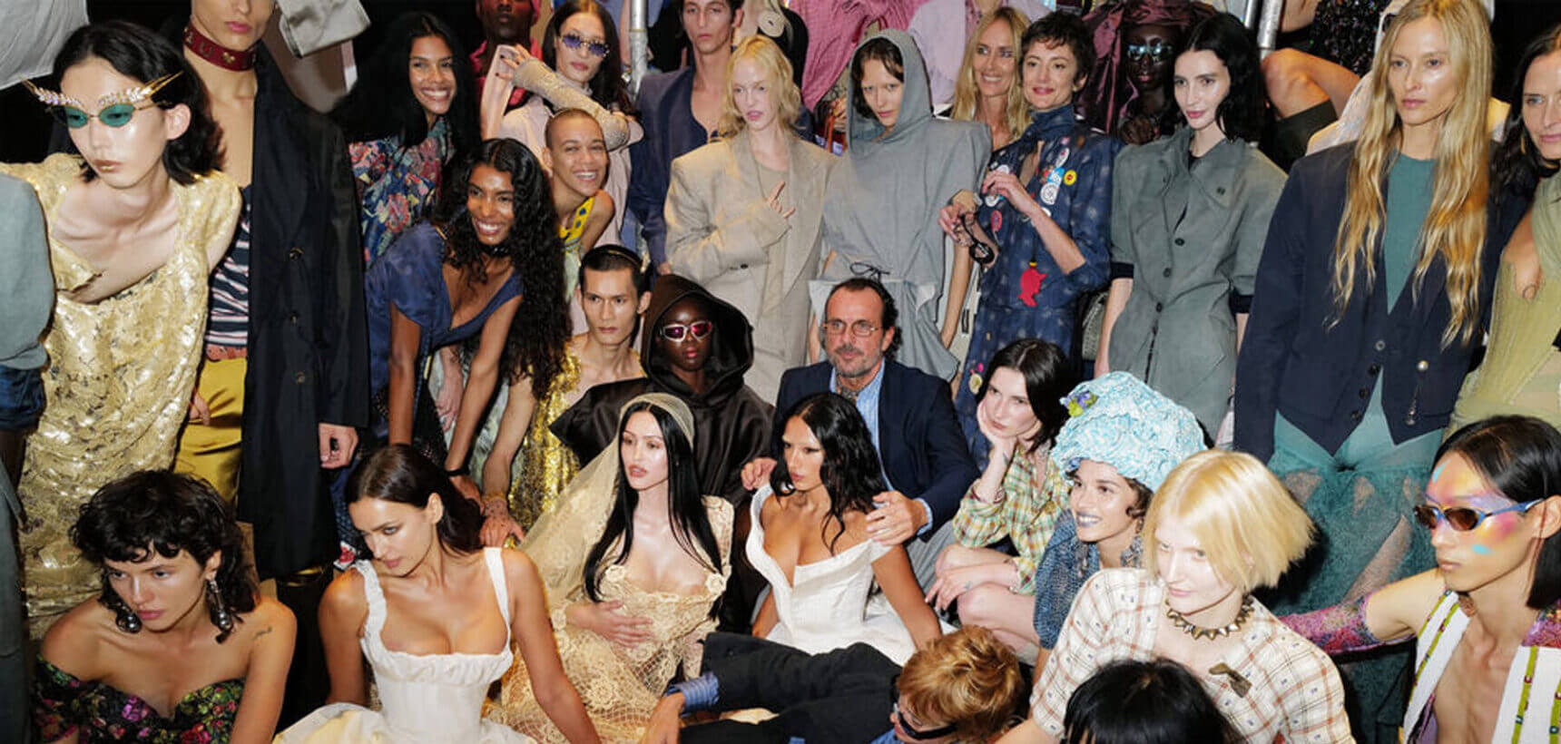 A live drummer accompanied the models as they sauntered past, exuding the kind of confidence you can’t fake. The clothes have that same sense of self, whether it’s an easy trouser suit worn with tassel loafers or a corseted gown. It felt authentic, it looked authentic and it was. Kronthaler explained that he based the collection on Dame Vivienne Westwood’s personal wardrobe. “I organised and numbered Vivienne’s personal wardrobe, clothes we did together. Revisited. Reworked…Loved the way she dressed. Always the opposite of everybody else,” he said in a statement. From the corduroy suits that she wore for decades, mending them in bed until they fell apart, to the signature teetering platforms, dresses and jackets, everything was cut with Westwood’s distinctive proportions, Kronthaler referenced decades of their work and life together. Westwood aficionados would have spotted the Cosmopolitan Jacket, from the Tied to the Mast SS98 collection, or the knitted Cora Vest and shorts from Cut, Slash & Pull, SS91, named for the designer’s granddaughter Cora Corre, who closed the show in the Infanta dress from the War & Peace, SS12 collection. He mixed different eras together, a blouse from 2001 worn with a 2016 jacket and a 1999 skirt. It’s how true Westwood lovers wear their brand, all at once, remixing eras and collections together, just like Vivienne did. It looked great and proved that a Westwood piece can stay in your wardrobe forever. Alongside the archive references there was plenty of new pieces from a rainbow sequin catsuit to glittering corsets and denim. Many of the models were friends of the house including Honor Fraser (now a gallerist), Tasha Tilburg and Sibyl Buck. They were joined by a young generation who eagerly embrace the house, its look and its values.