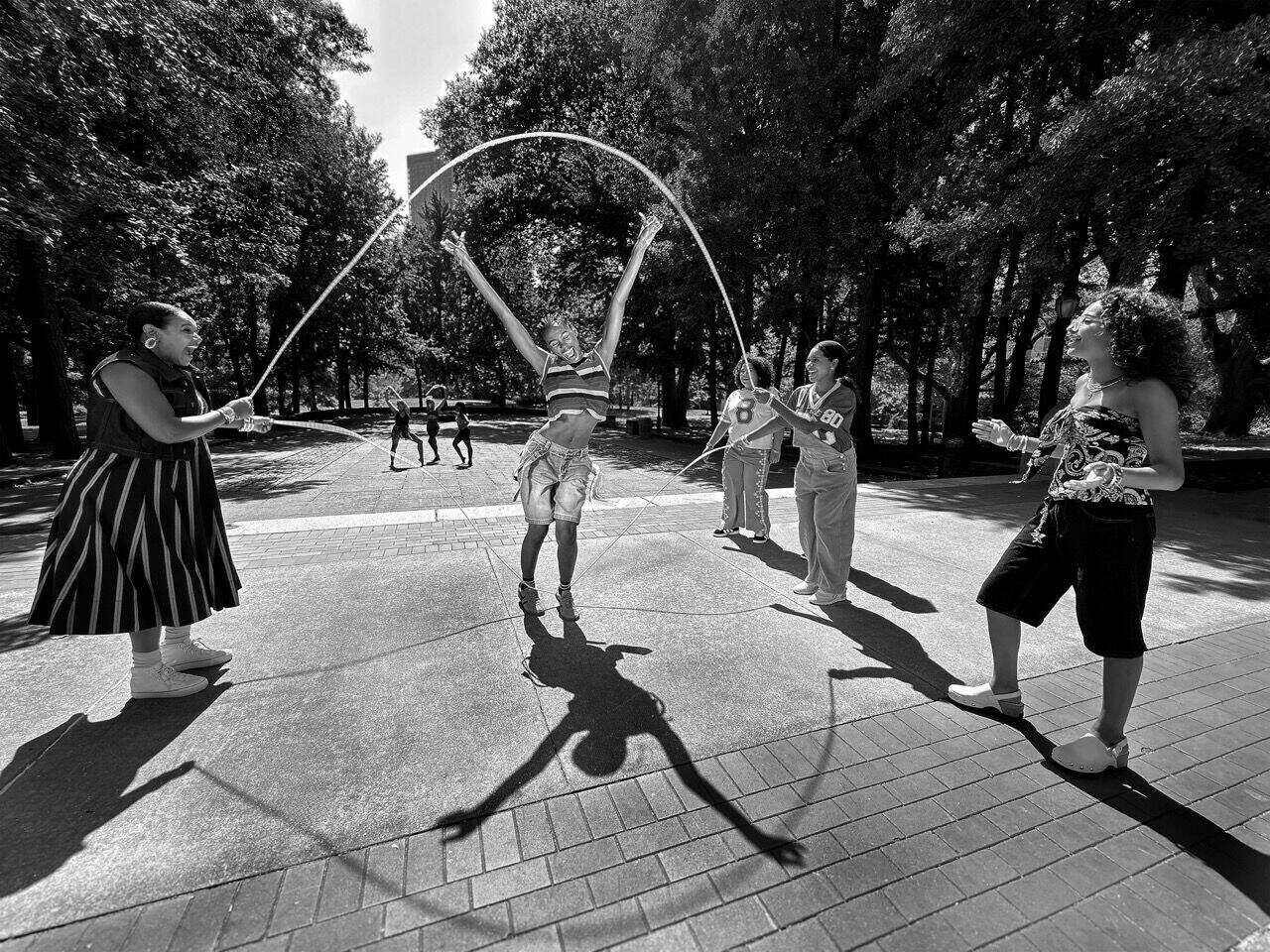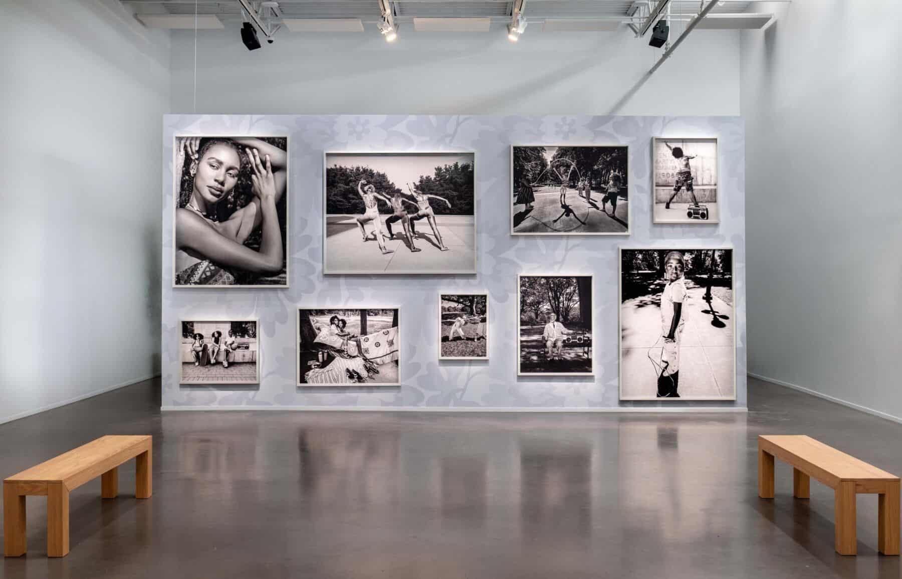 Mickalene Thomas’s photographic contribution is a love letter to Black joy, rest, and the radical act of simply being. Her nine black-and-white photographs, displayed on a freestanding wall in various sizes, create the sensation of peering through windows into intimate, everyday moments of joy. Despite some subjects being in motion, the images radiate serenity and peacefulness. “Too often, African Americans are seen through the lens of labor and endurance,” Thomas says. “This work counters that narrative, exploring rest as a form of resistance, power, and self-reclamation. It asks: What happens when we are allowed to simply be?”