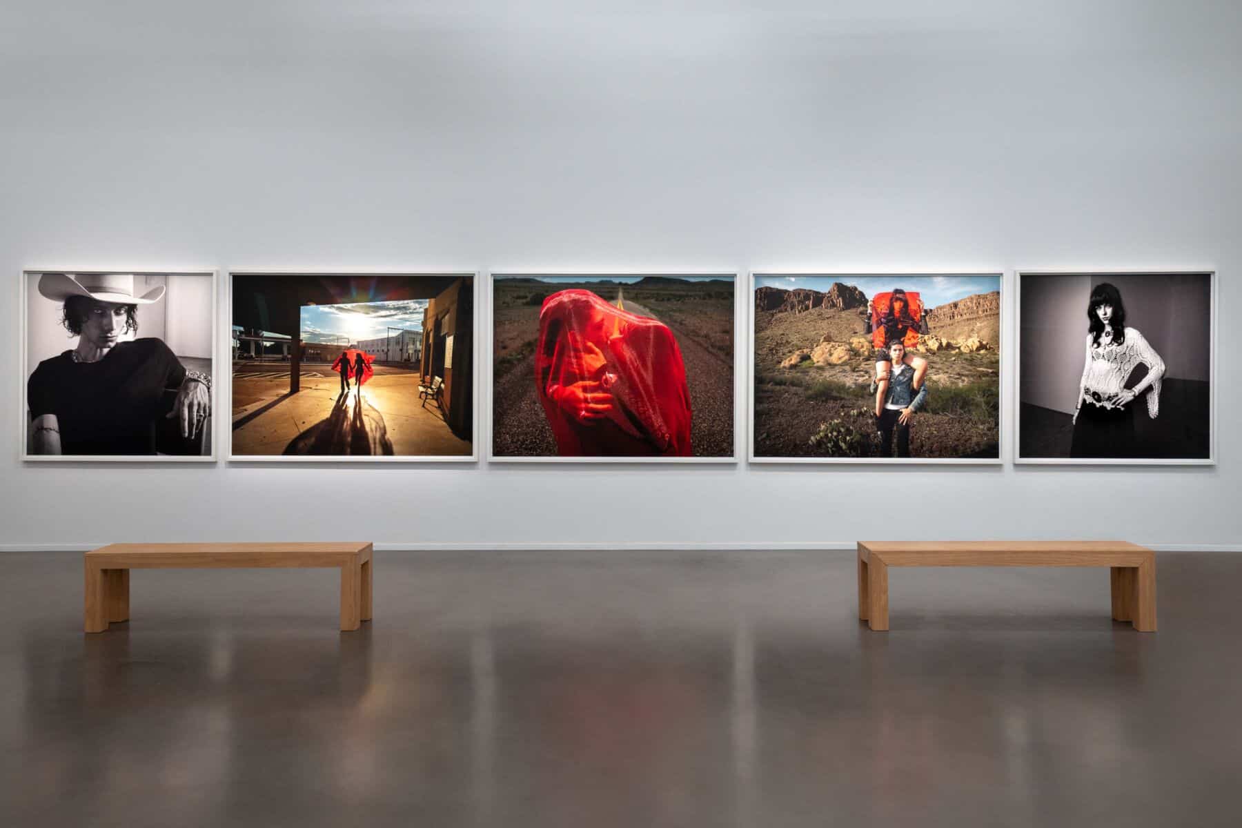 Each artist was given early access to the iPhone 17 Pro Max for their shoots, and the results are remarkable—both in subject matter and image quality. The artist duo Inez and Vinoodh present a series of five large-scale images telling the love story of their son, artist Charles Matadin, and his partner, Natalie Brumley. The three central images were shot in color and are framed by two black-and-white portraits of each individual—independent entities embarking on a shared journey of love and joy. Set in Marfa, Texas, you’ll find the couple partially veiled in red, symbolizing passion as well as caution. Against the backdrop of the desert and the seemingly abandoned town, the images evoke stills from a surrealist Western film.