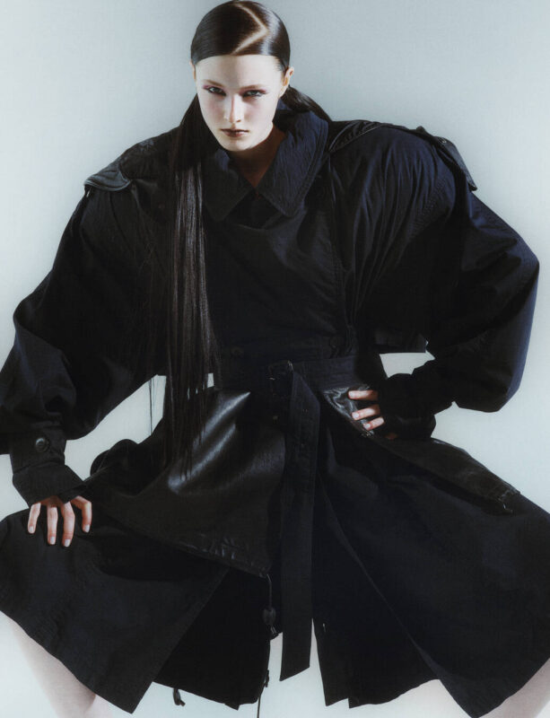 He began to think about how he could toy with garments we’re exposed to day in, day out through a radical approach to volume, whether that’s classic trench coats with hulking shoulders or micro minis so minuscule they just about cover the crotch. “They’re our extra, extra mini skirts. People get angry when we call it a skirt, but we consider it to be one,” he says with a laugh.