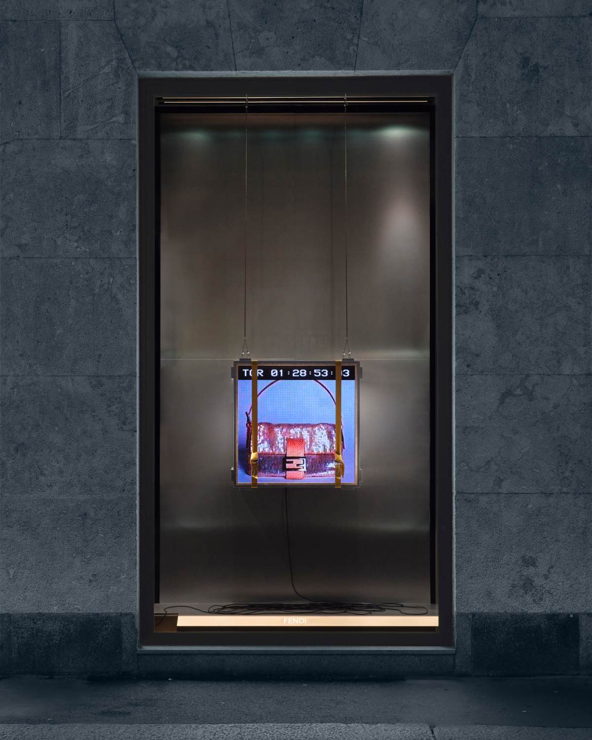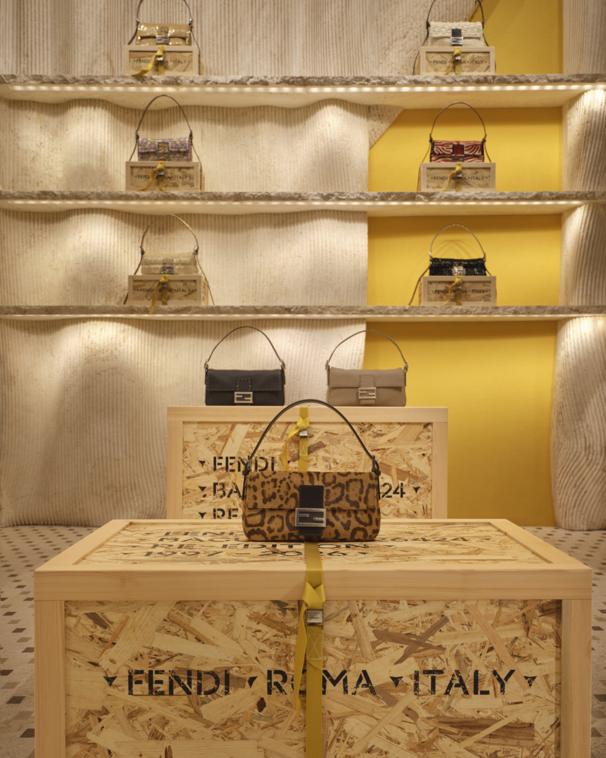 Fendi, meanwhile, turns inward—quite literally, and with a certain poetic insistence. Inspired by an encounter between Marilyn Monroe and Truman Capote, the House builds its narrative around the contents of a handbag, as fragments of identity. The re-edition of the Baguette (model 26424, for those who care about origins) becomes less about archival revival and more about multiplicity: who you are, what you carry, and how many selves coexist in one silhouette. At Palazzo FENDI, the installation leans into this idea, staging the bag as both object and archive. Crates, packaging and suspended displays evoke the journey of the Baguette from atelier to icon, transforming it into something closer to a collectible artwork than a fashion item. Even the presentation—with custom wooden boxes and almost museological staging—reinforces the point: this isn’t nostalgia, it’s self-definition.