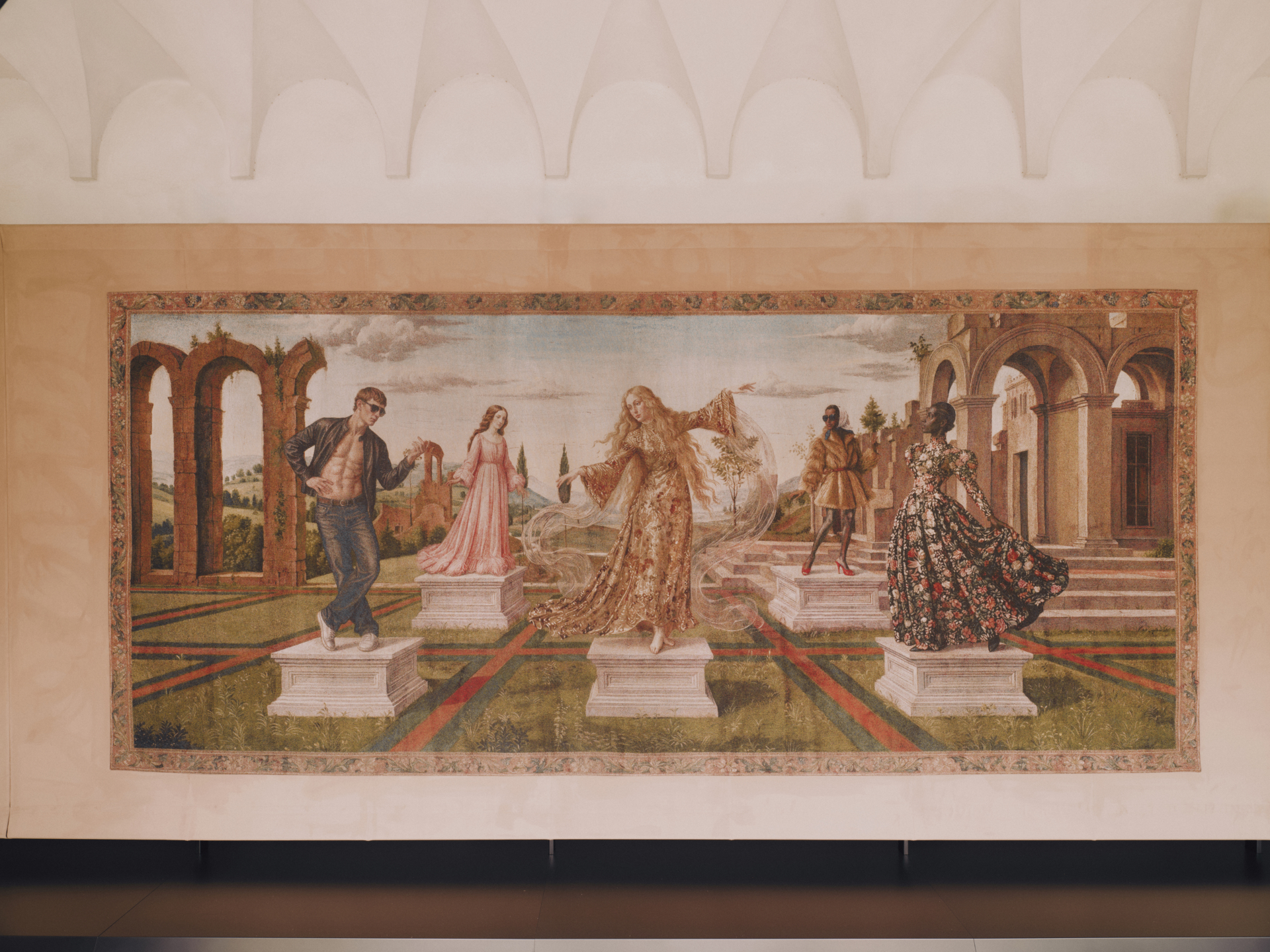 Across the city, Gucci opted for immersion over introspection with Gucci Memoria, curated by Demna. Staged in the Chiostri di San Simpliciano, the exhibition unfolds like a living archive of the House’s 105-year history—only less dusty, more cinematic. At its core: a series of elaborate tapestries retracing key moments, from Guccio Gucci’s early days at The Savoy to the ever-shifting visions of its creative directors: Tom Ford, Frida Giannini, Alessandro Michele, Sabato De Sarno and Demna himself. Around them, a layered set design mixes botanical installations inspired by the Flora motif with interactive elements, including vending machines dispensing drinks tied to fictional Gucci personalities (because of course identity is now a beverage.)