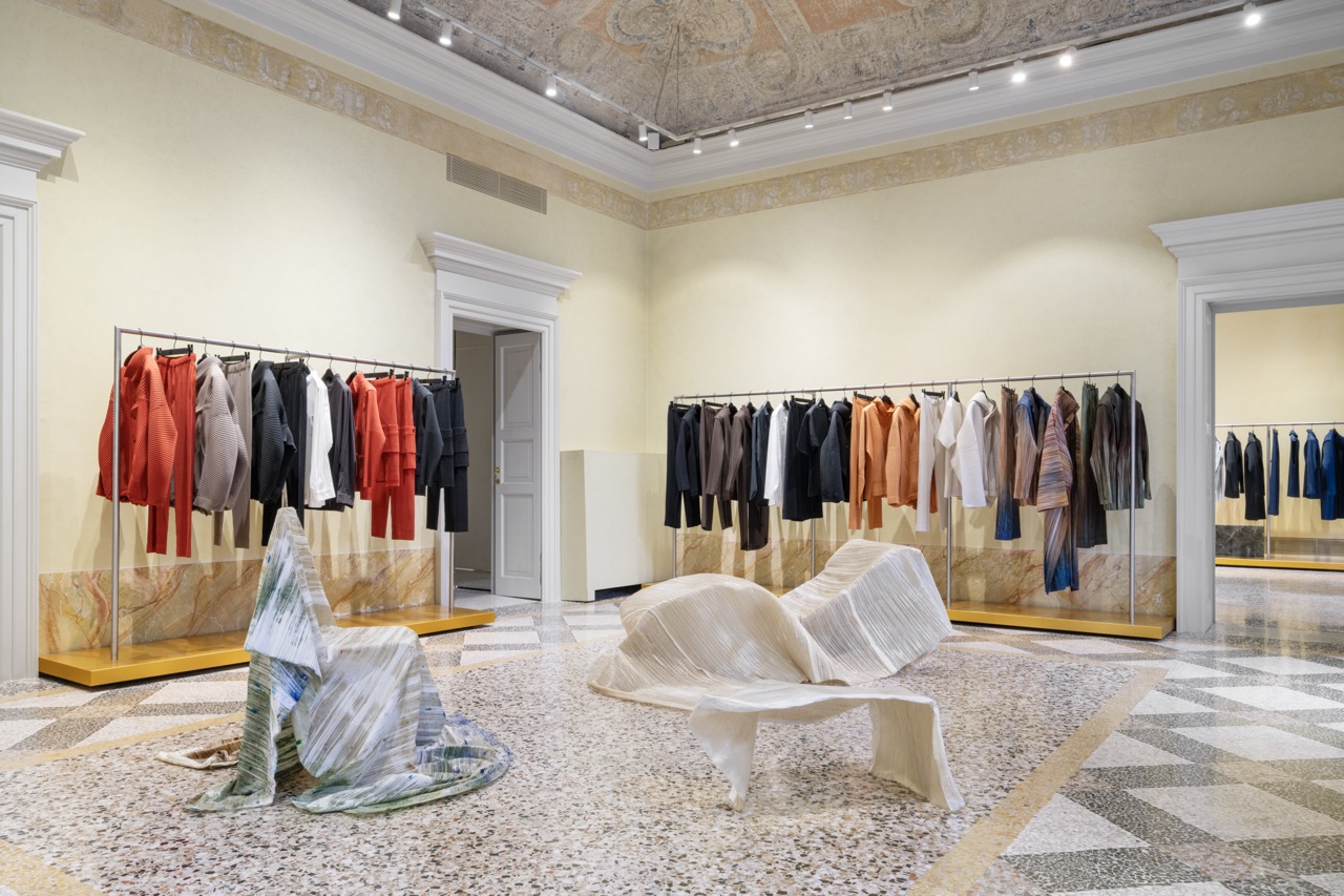 And if all this thinking risks becoming too abstract, craftsmanship brings things back to ground level. Somewhere between process and poetry, it becomes the real protagonist. Issey Miyake approaches it sideways, turning industrial leftovers into quiet design statements: compressed pleated paper logs become stools, sculptures, even a philosophy about seeing value where others see waste. It’s less recycling, more existential upgrade. Tod’s, on the other hand, leans proudly into tradition, staging the Gommino as both artifact and canvas, reworked through the lens of Italian design masters while artisans stitch away live—because nothing says authenticity like doing it in front of an audience. Then there’s Ginori 1735, which strips porcelain back to its essence with Officina Ultra, proving that even a centuries-old material can still have an identity crisis—and come out sharper, sleeker, and more self-aware. Different approaches, same conclusion: craft is a moving target.
