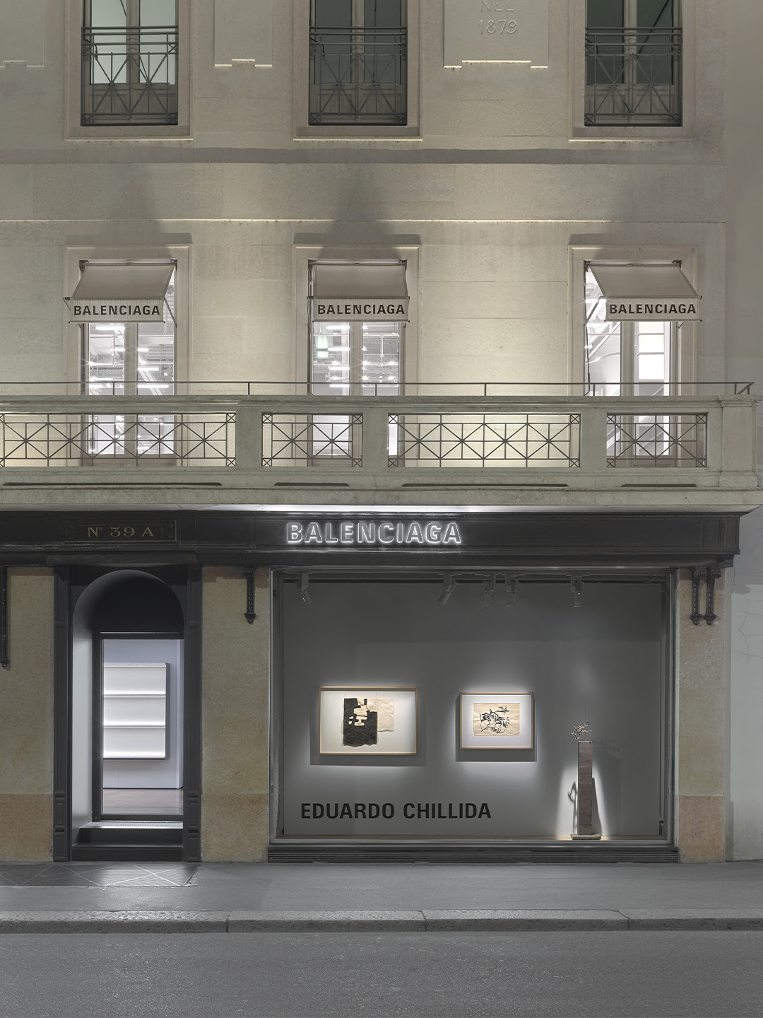 Balenciaga doesn’t stage an installation so much as it opens a conversation—one that has been quietly unfolding for decades. With Artean – Eduardo Chillida, the House transforms its Via Montenapoleone flagship into a space of in-between: between art and fashion, past and present, volume and void. The title itself—Artean, meaning “between” in Basque—sets the tone for a project that resists easy categorization. Here, sculptures by Eduardo Chillida sit among contemporary collections not as decorative gestures, but as active counterparts. Iron forms and suspended works on paper echo Cristóbal Balenciaga’s own obsession with volume, not as something that follows the body, but something that defines space around it. If for the couturier volume precedes form, for Chillida it reveals absence, turning emptiness into structure. Under Pierpaolo Piccioli’s direction, the installation becomes less about homage and more about continuity. At Balenciaga, art doesn’t interrupt the shopping experience—it reframes it.