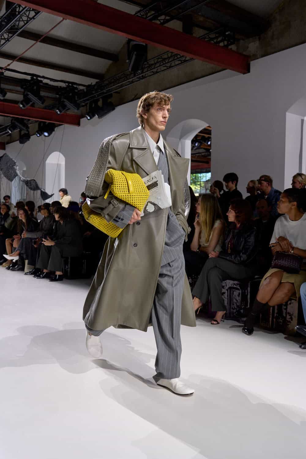 The woven intrecciato leather was used throughout not just for bags and shoes but for lapels and belts to full trench coats and skirts. Trotter revived the original width, 9mm x 12mm, introduced at the launch of the house in 1966. “I’ve come back to the beginning. I’m starting from the beginning and looking where I see a connection,” she said of her approach to the house’s heritage.