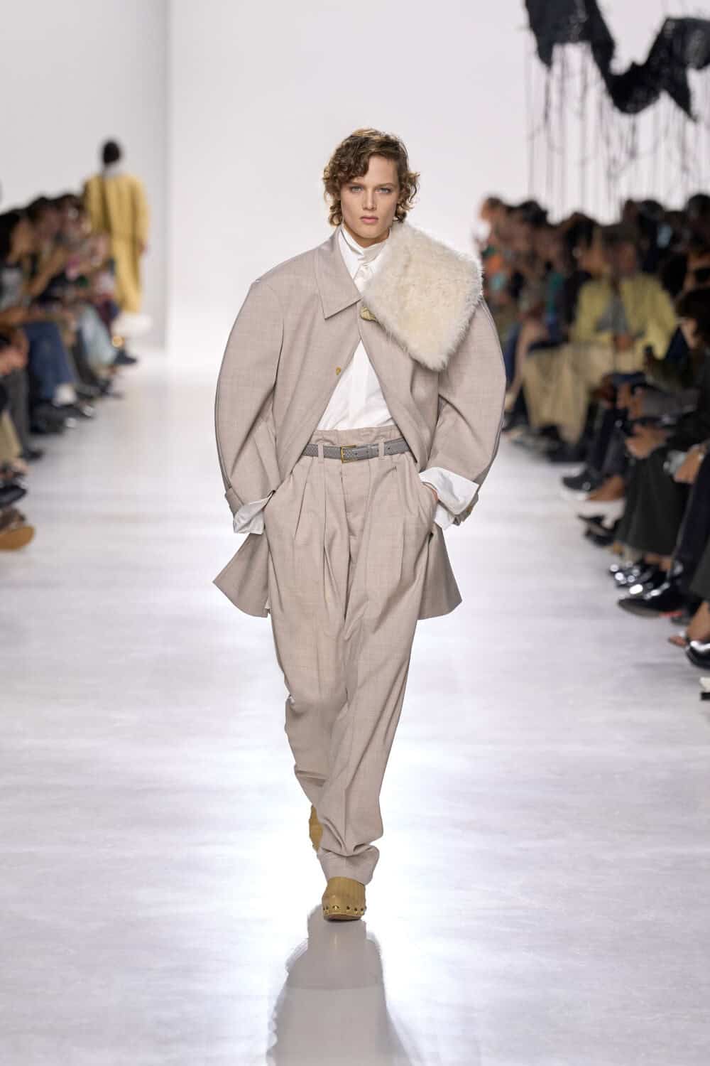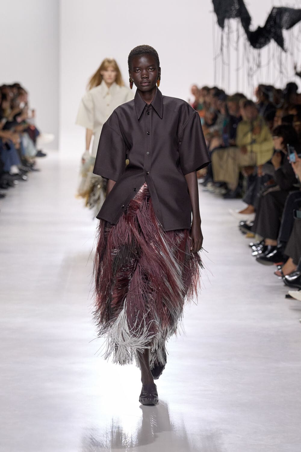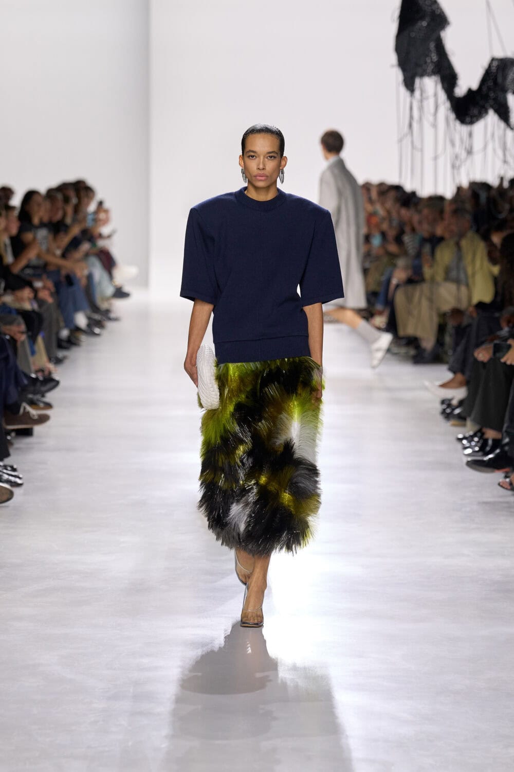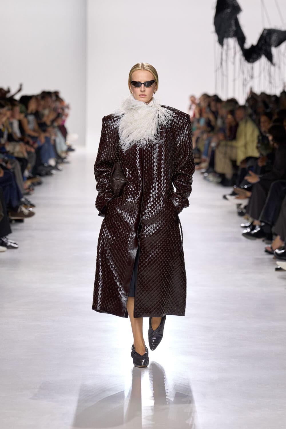 Witness lush ‘tinsel’ chubby coats and skirts worn with oversized tees that bounced joyfully down the runway. They were made with strands of recycled glass, (her tribute to Merano, said the designer) each one hand-applied. Or the floor-length leather cape, crafted from the house’s famous intrecciato woven technique which took 4000 hours to craft. “There’s not a single thing on that piece that wasn’t made by hand,” said the designer, likening it to couture. For that piece, Trotter used a 3mm x 3mm width of intrecciato, because the narrower the strips of leather in the weave, the softer the piece.