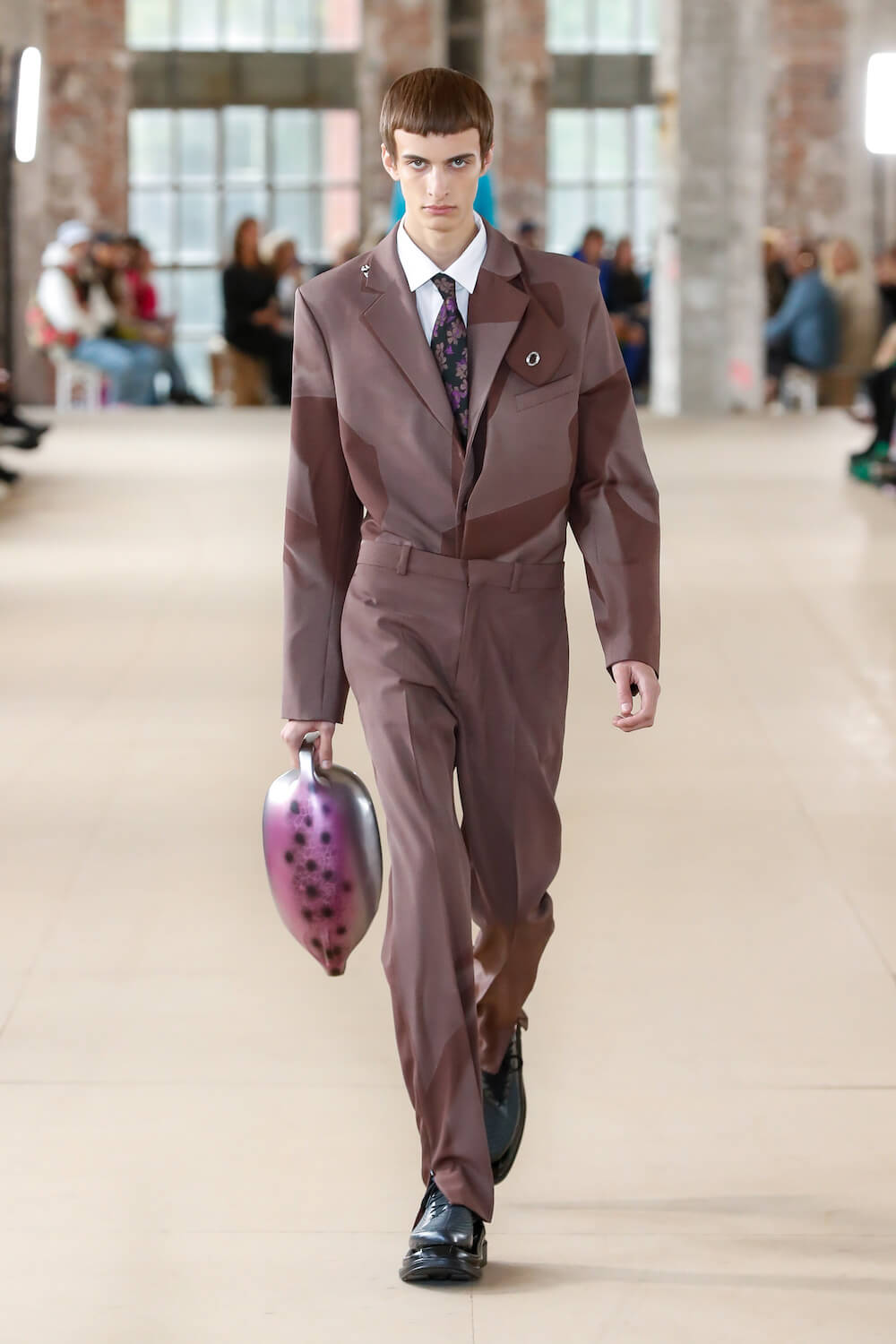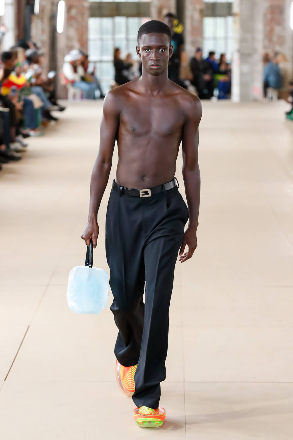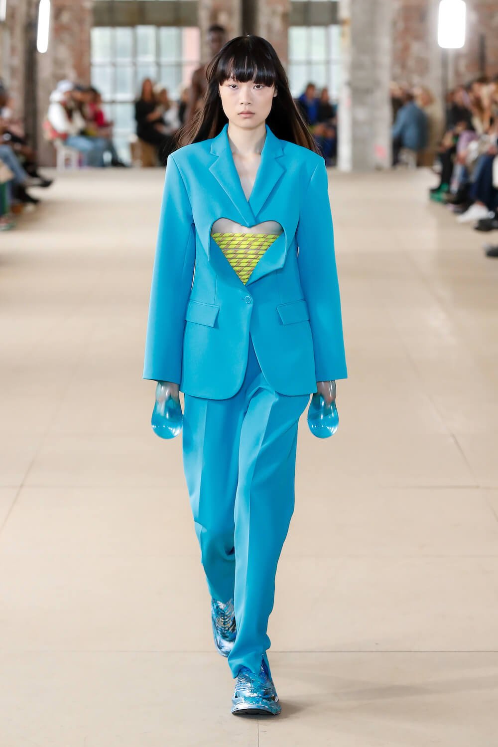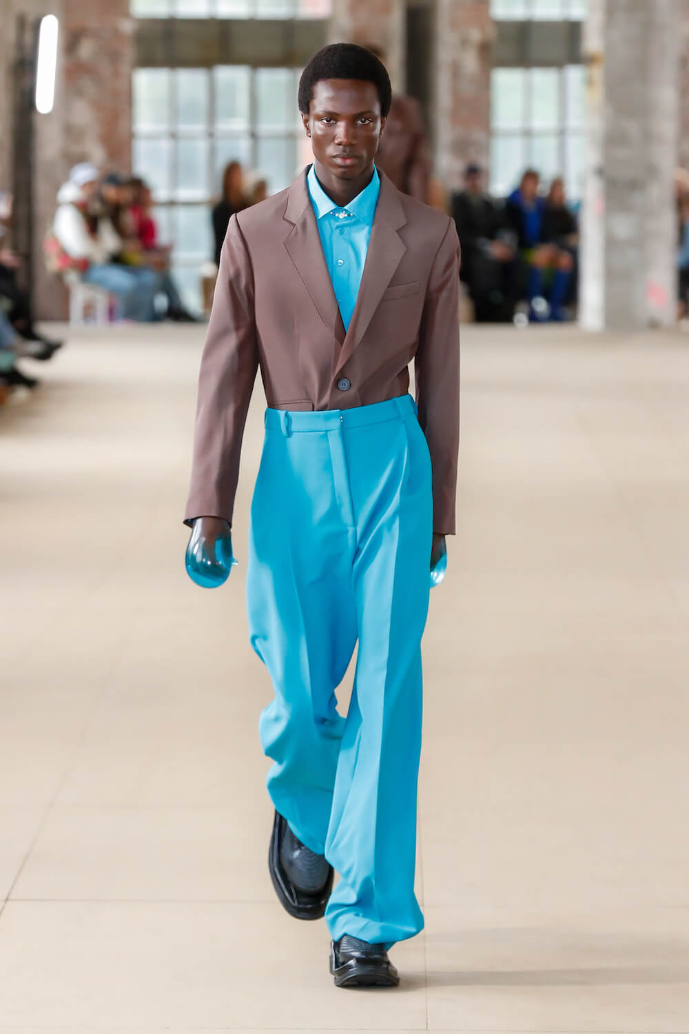 Inspired by the Caribbean Sea – where the duo have set up a coral farm – suits also surfaced in Botter’s blue brand colour, some with heart-shaped lapels and others with subversive slits. Something especially arresting was how models’ hands swam in little prophylactic aquariums across the catwalk, their fingers submerged in XXL condoms filled with dyed water. But Herrebrugh and Botter didn’t come up for air just yet: they also proposed bags made of ice – as ephemeral as the current state of our seas.