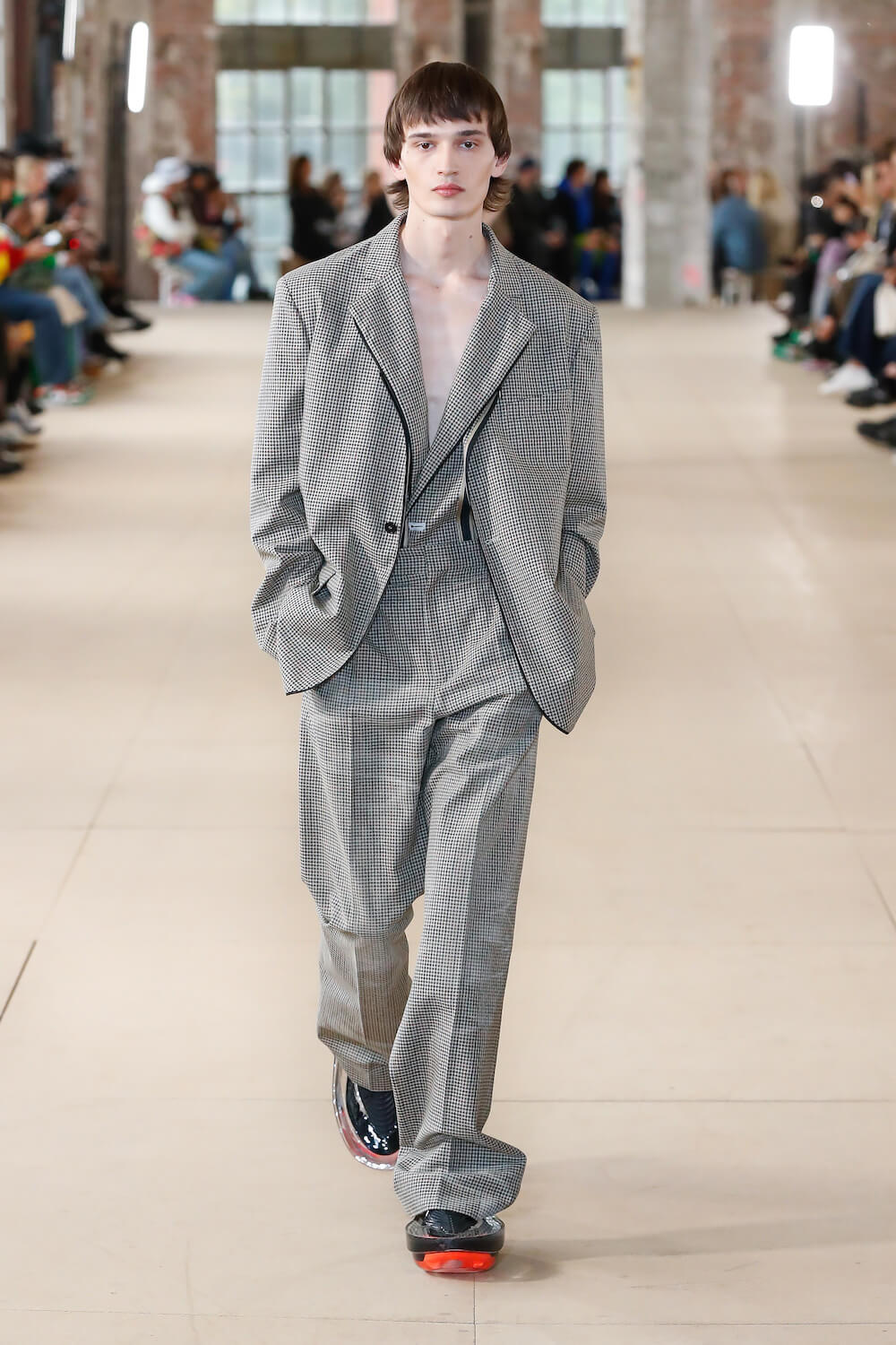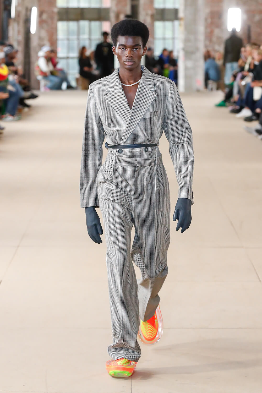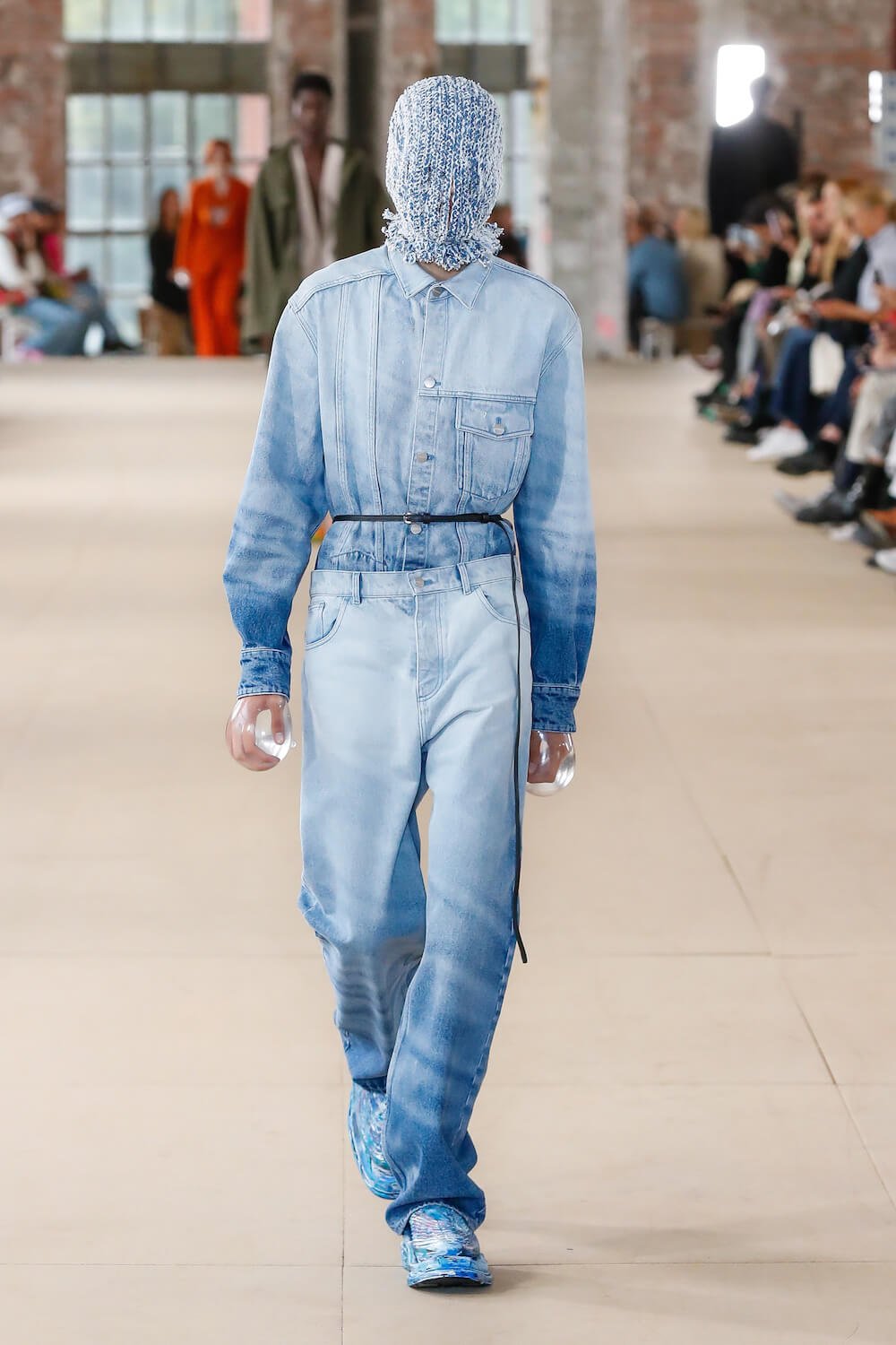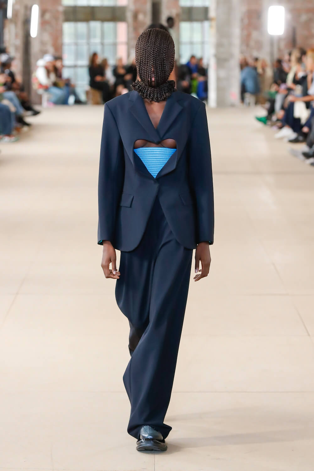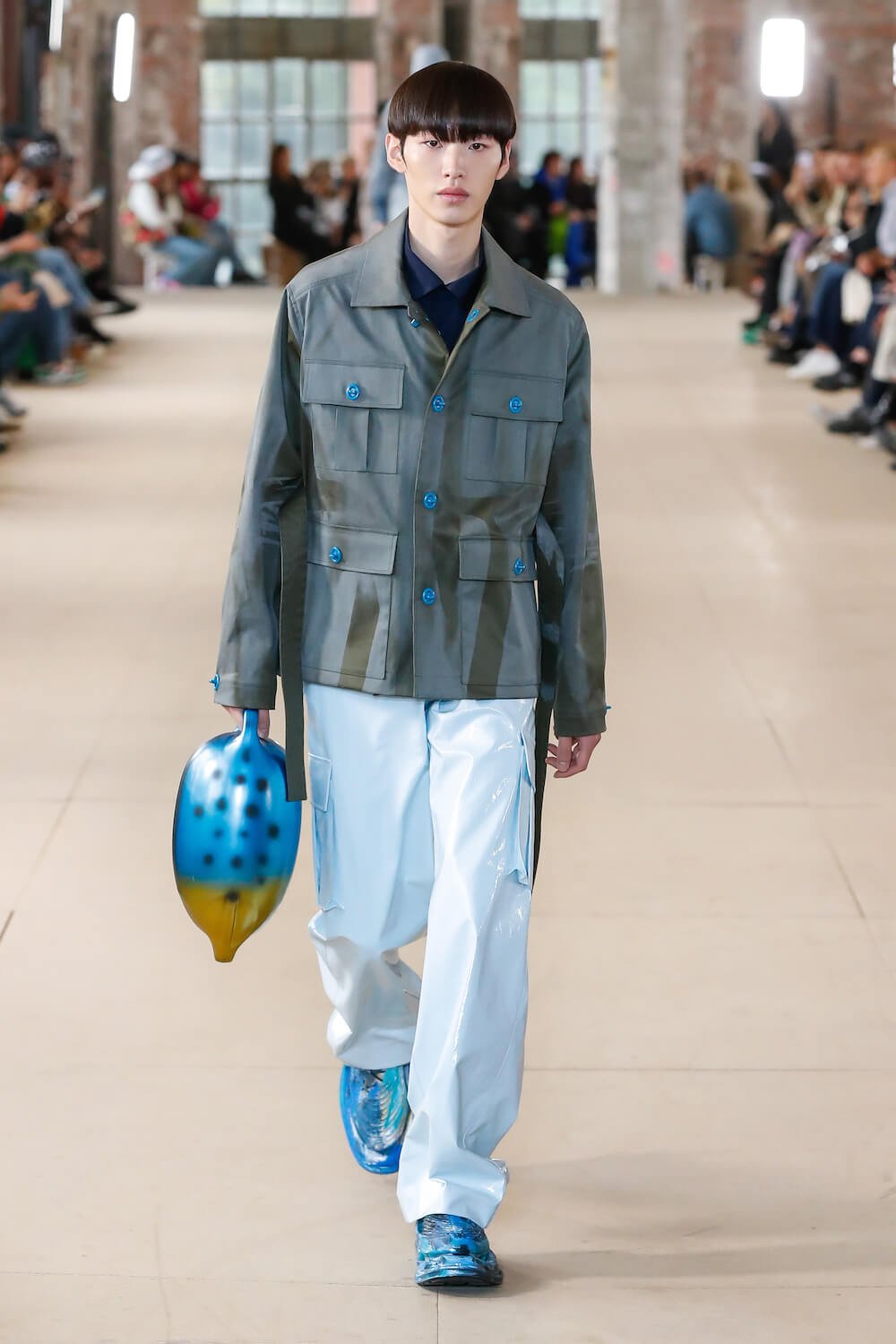 Inspired by the Caribbean Sea – where the duo have set up a coral farm – suits also surfaced in Botter’s blue brand colour, some with heart-shaped lapels and others with subversive slits. Something especially arresting was how models’ hands swam in little prophylactic aquariums across the catwalk, their fingers submerged in XXL condoms filled with dyed water. But Herrebrugh and Botter didn’t come up for air just yet: they also proposed bags made of ice – as ephemeral as the current state of our seas.