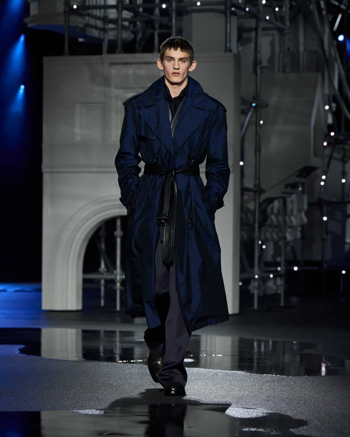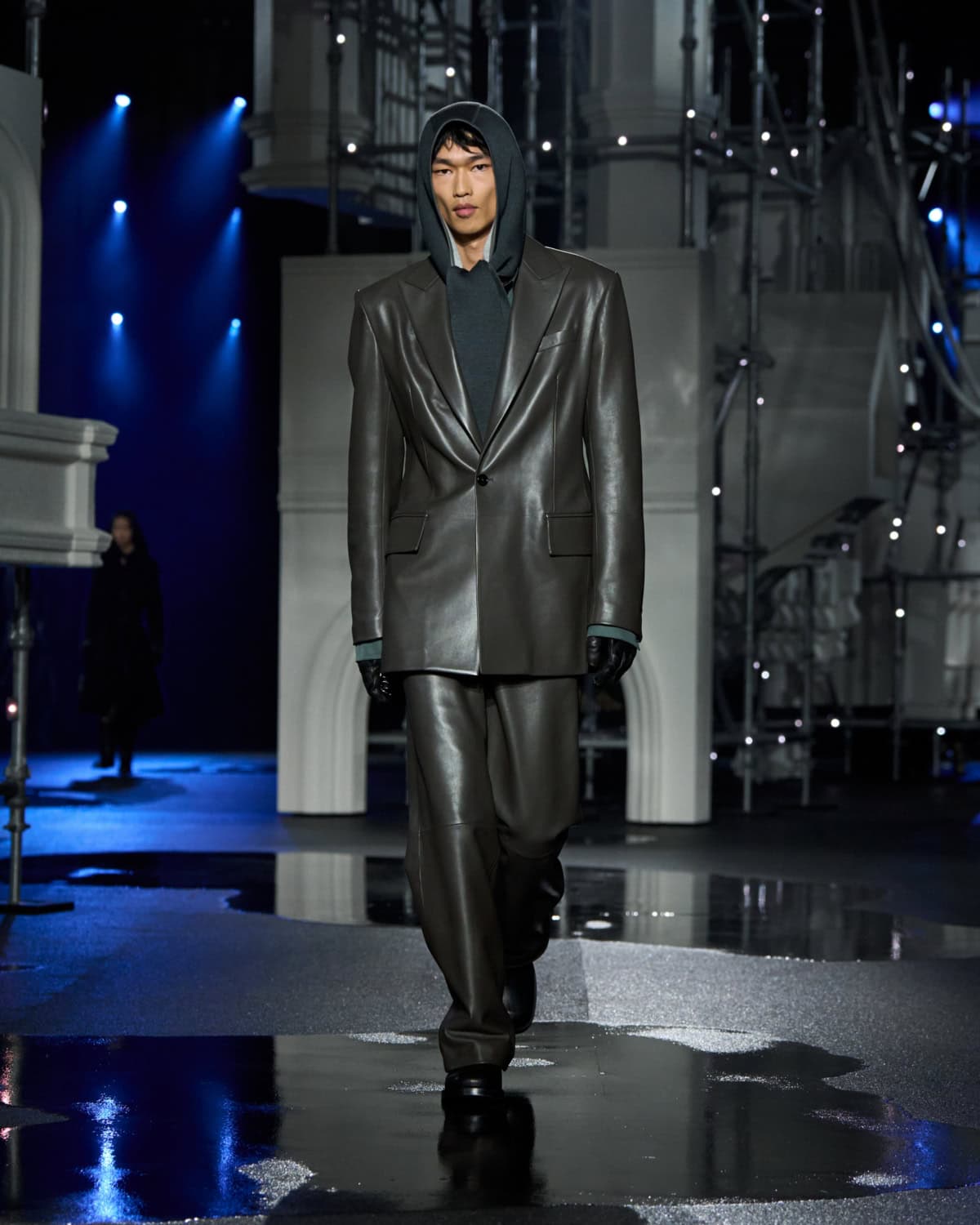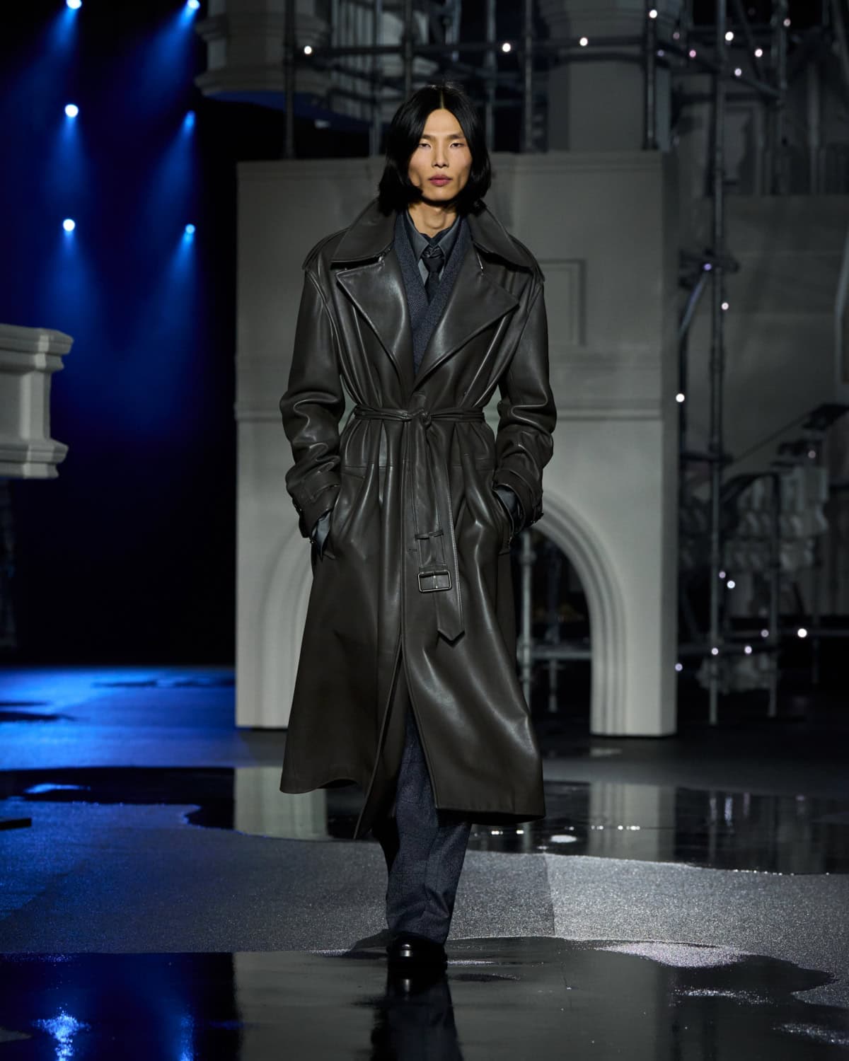 With an all-star cast that included Romeo Beckham and Rosie Huntington-Whitley, Lee made clear distinctions in his approach to menswear versus womenswear without sacrificing cohesiveness. On the men’s side you saw leather bombers, hoodies, and raincoats juxtaposed against more formal elements like a tuxedo or a silk shirt. For women a similar idea applied with trenches turning into toppers for silky dresses. Mixed in with shearling or iridescent leather, it reflected the rainy evening glow both inside and outside the venue. As guests stepped out to a light drizzle, it felt like a fitting end to five days in London.