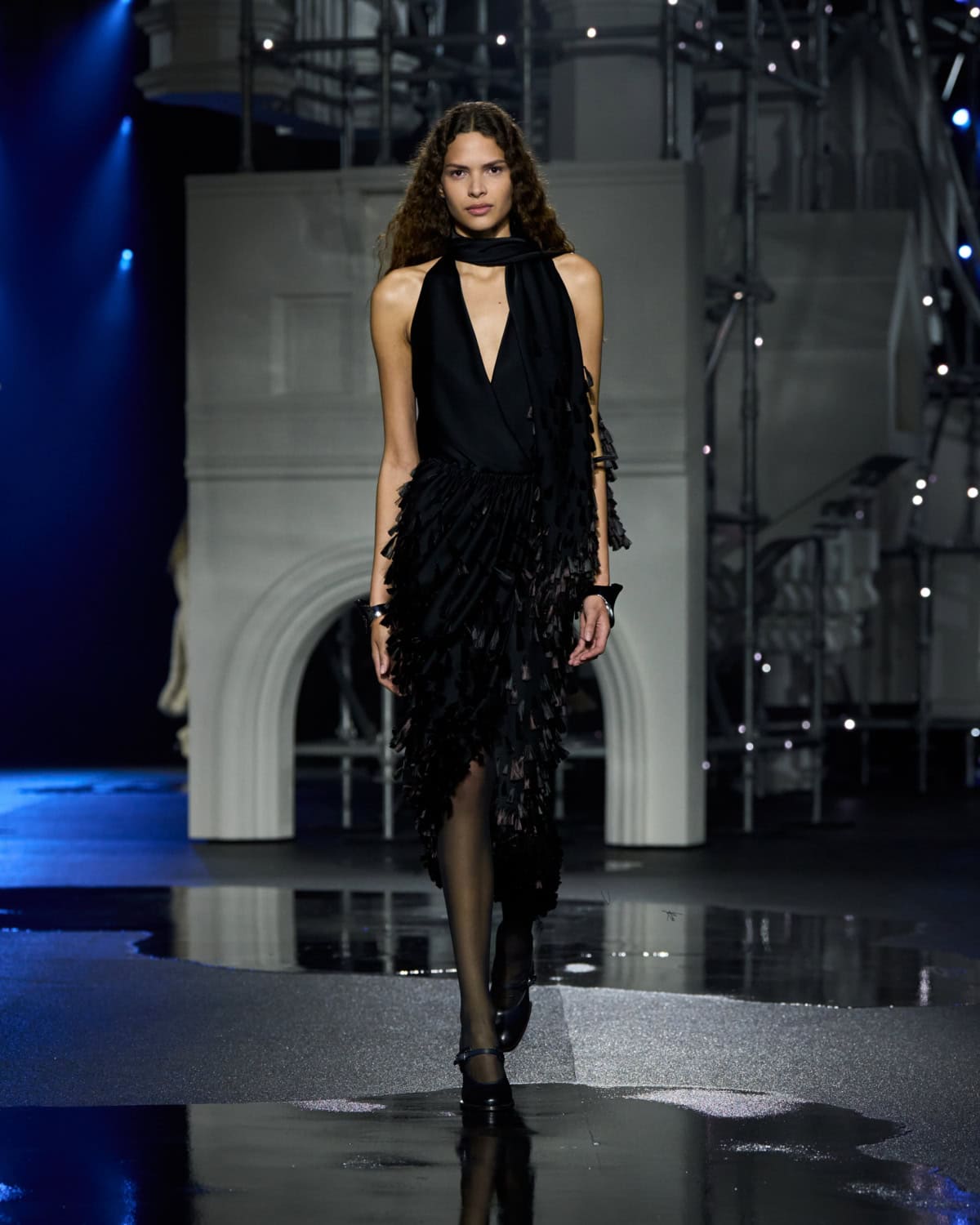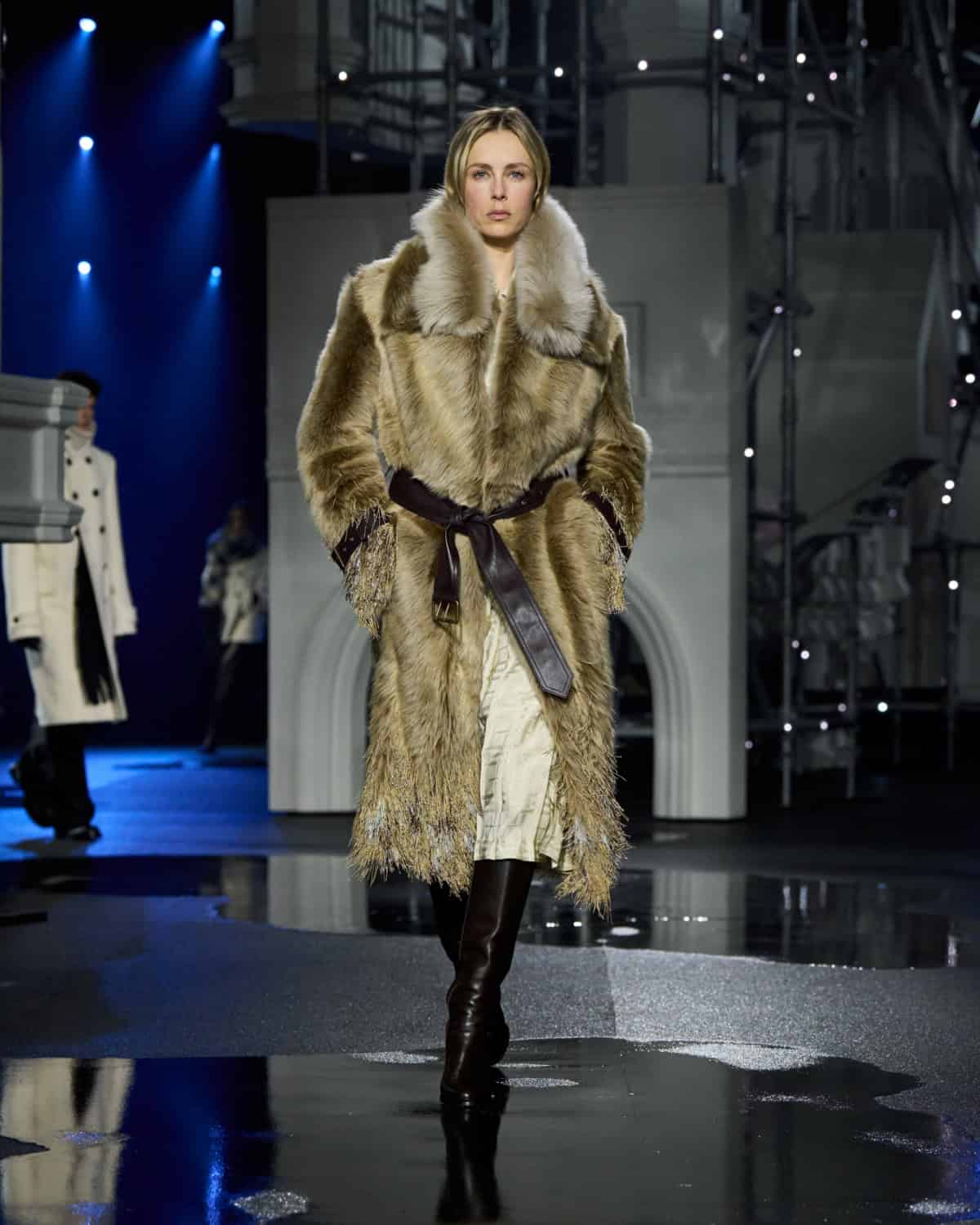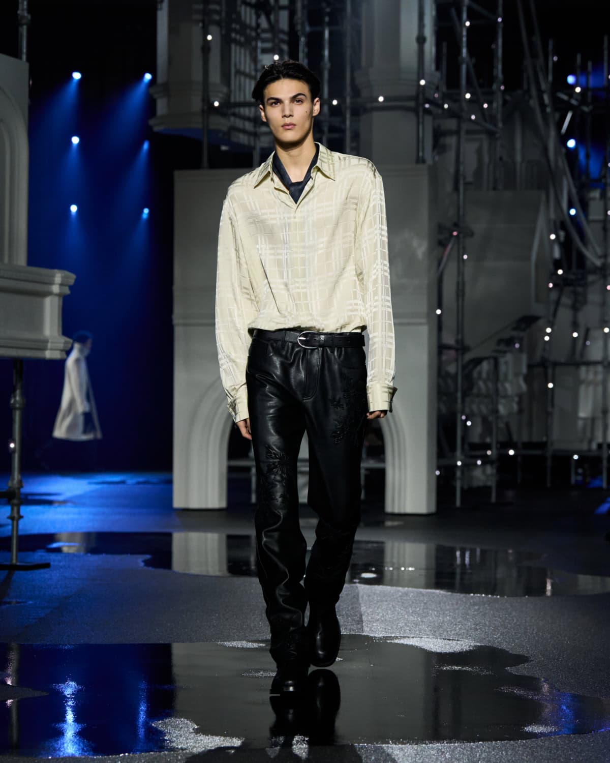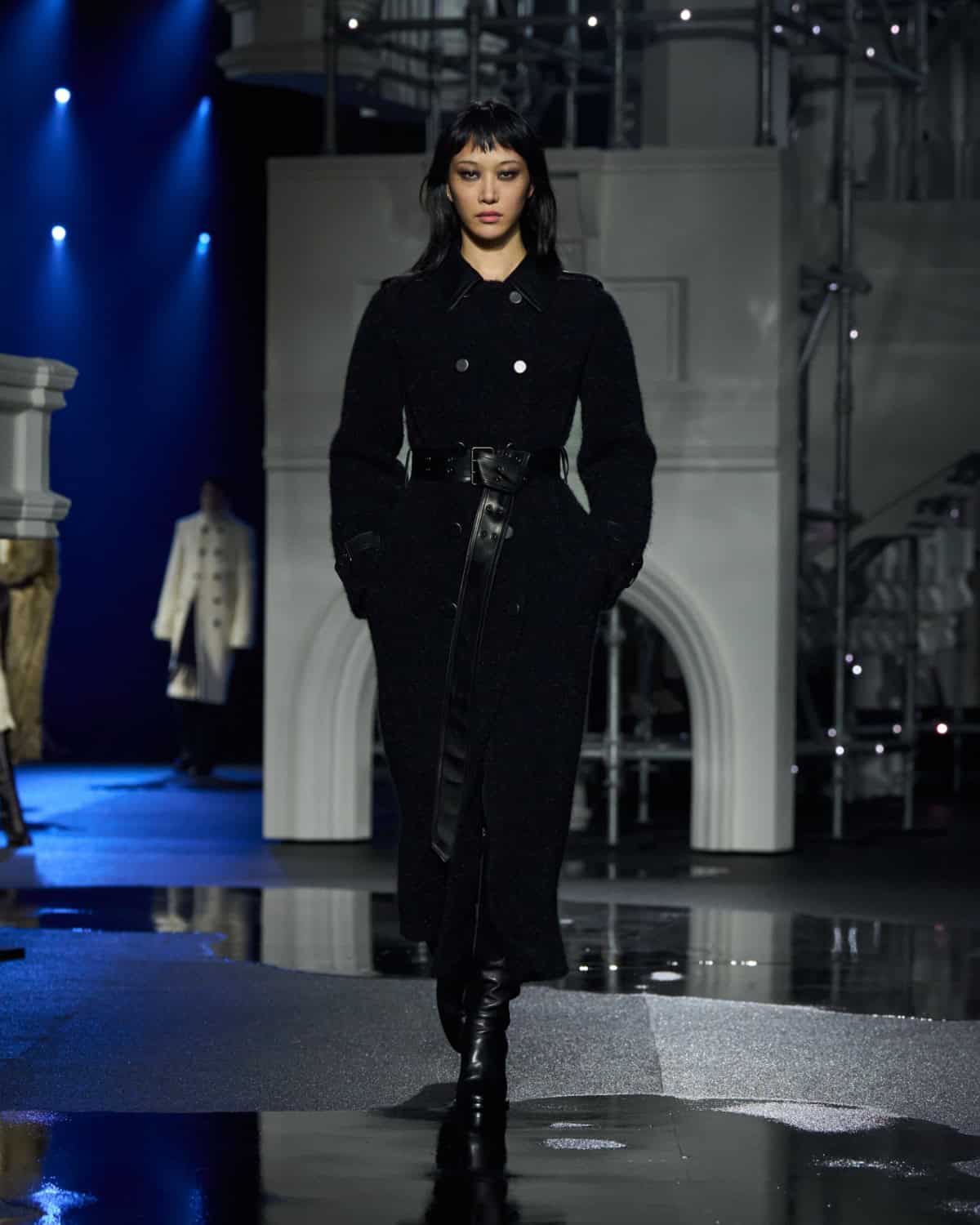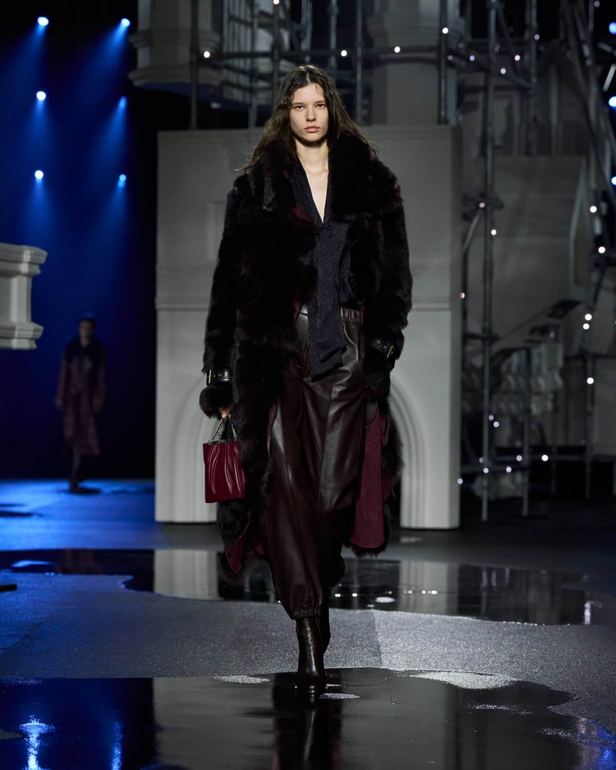 Per Lee, the inspiration for the fall 2026 collection was “going out in a particularly London way.” As the lights twinkled on the miniature Tower Bridge in the middle of the runway, that translated into an opening look that is quintessentially Burberry: a trench trimmed in ruffles at the lapels for flair. That silhouette would be a recurring motif throughout the show. From there it transitioned into a series of sleek tailored coats before segueing into sharp leather separates. Designed for urban settings, the pieces reflect the sense of urgency one has in a big city — life is go, go, go and everyone has a place to be. For Lee the idea is taking classics and heritage and letting this youthful vigor lend a spark of energy, which could be seen in every brisk step the models took.