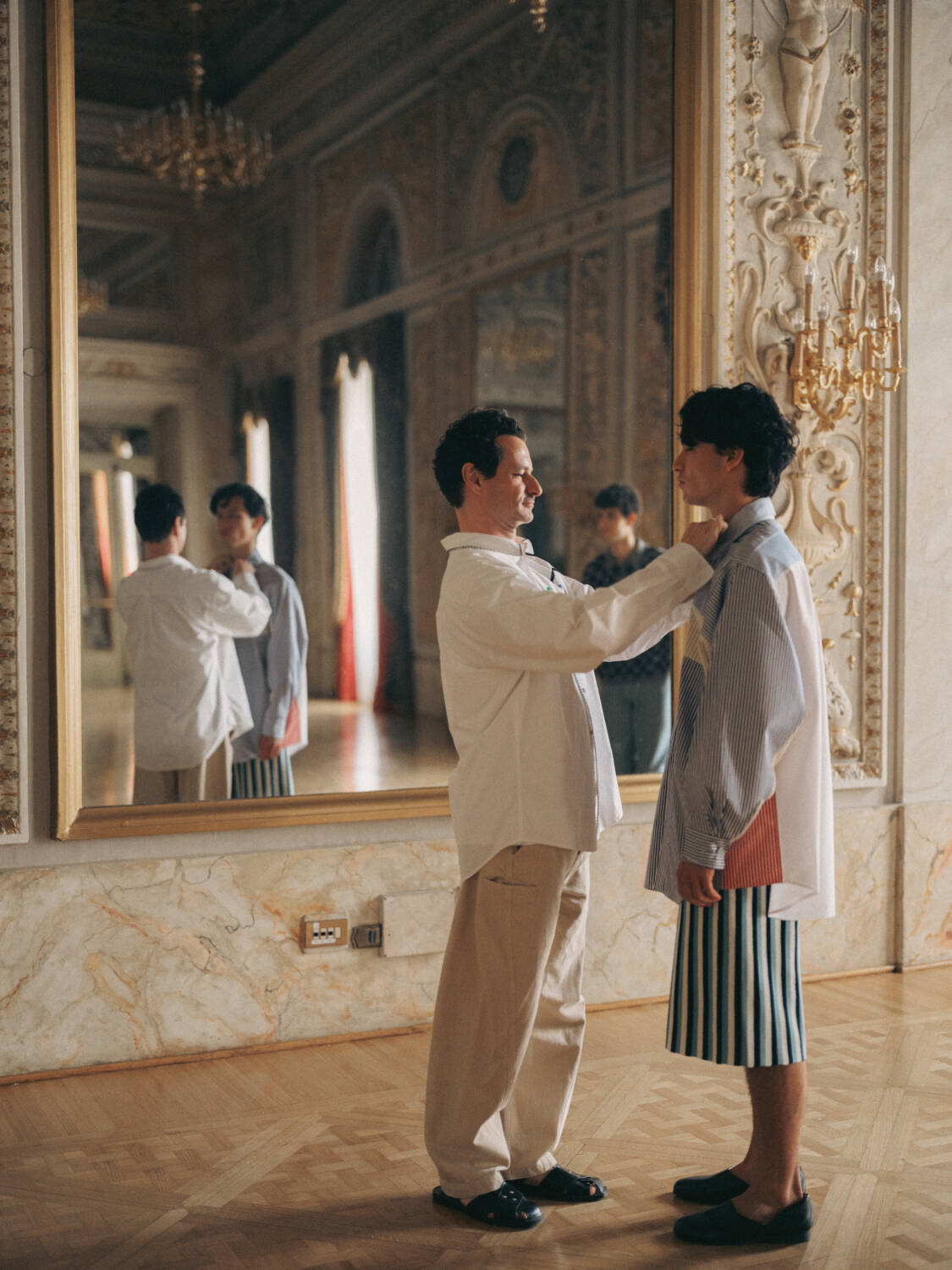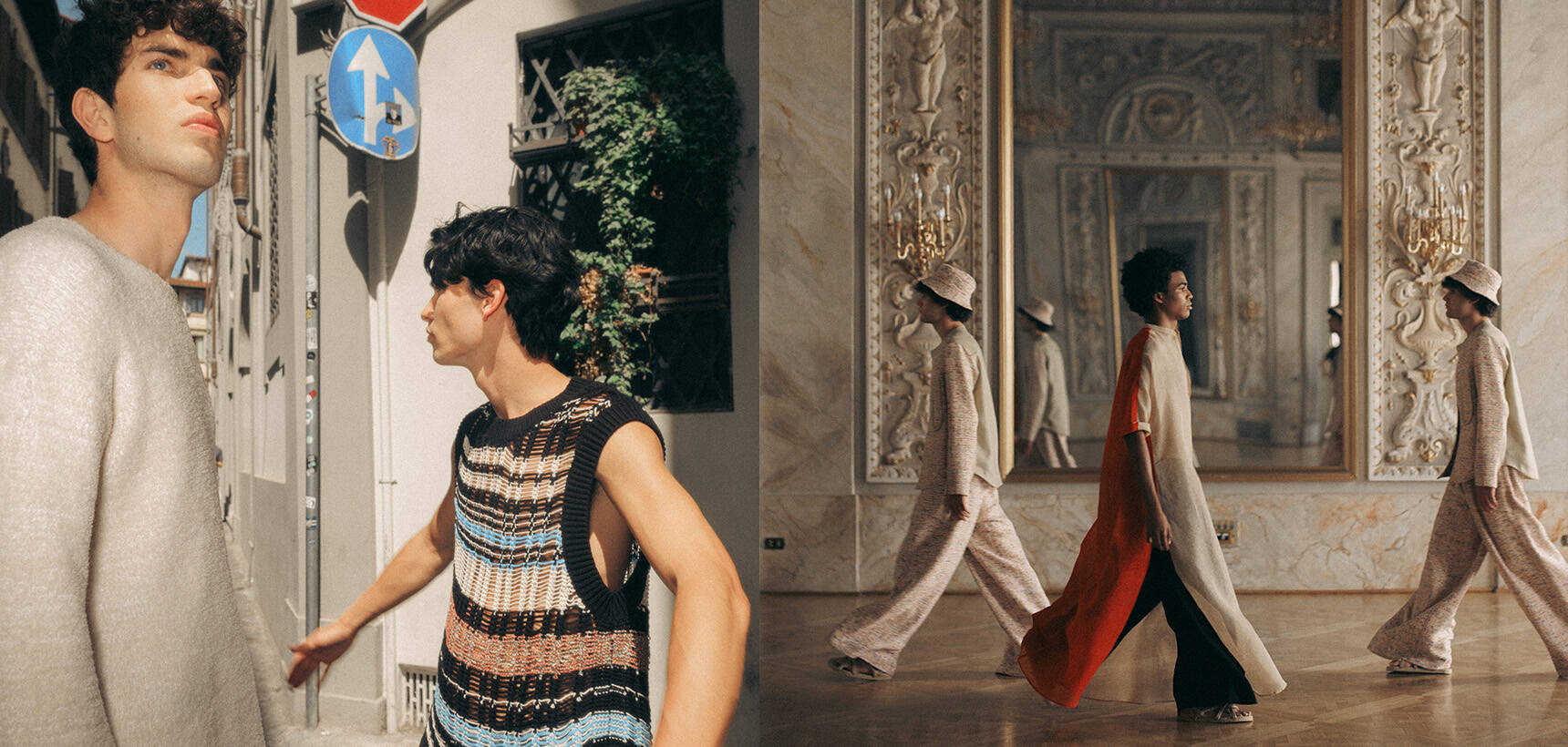 In the case of Manel Garcia Espejo and Michael Ward, the designers behind thesalting, Florence and its surrounding areas also play a huge role in how they’ve built out their five-year old label. “We’ve grown up coming here for years and know a lot of the mills that are located nearby. [The fabrics] inform our work — we’re not tailored, but we have soft tailoring elements that make our pieces suit everyone,” says Ward. How that translates is in the form of easy separates, whether it’s drawstring trousers, a slouchy blazer inspired by Jackson Pollock, or their Adirondack striped set. Fluidity and elegance play a huge role in the evening pieces with standouts being a breezy red silk gown as well as a two-tone ivory and white caftan that was teamed with wide-legged pants for the evening’s festivities.