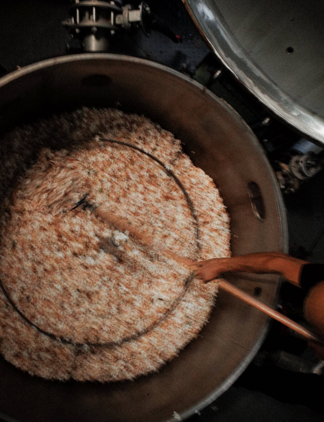 Jasmine being prepared to be distilled in a cauldron; Workers at Chanel’s extraction facility