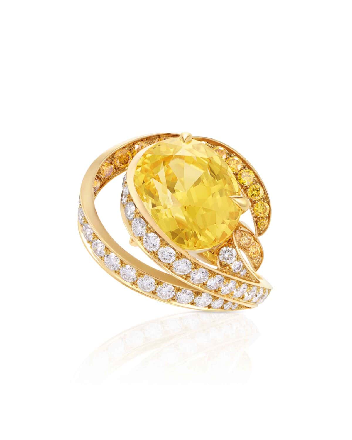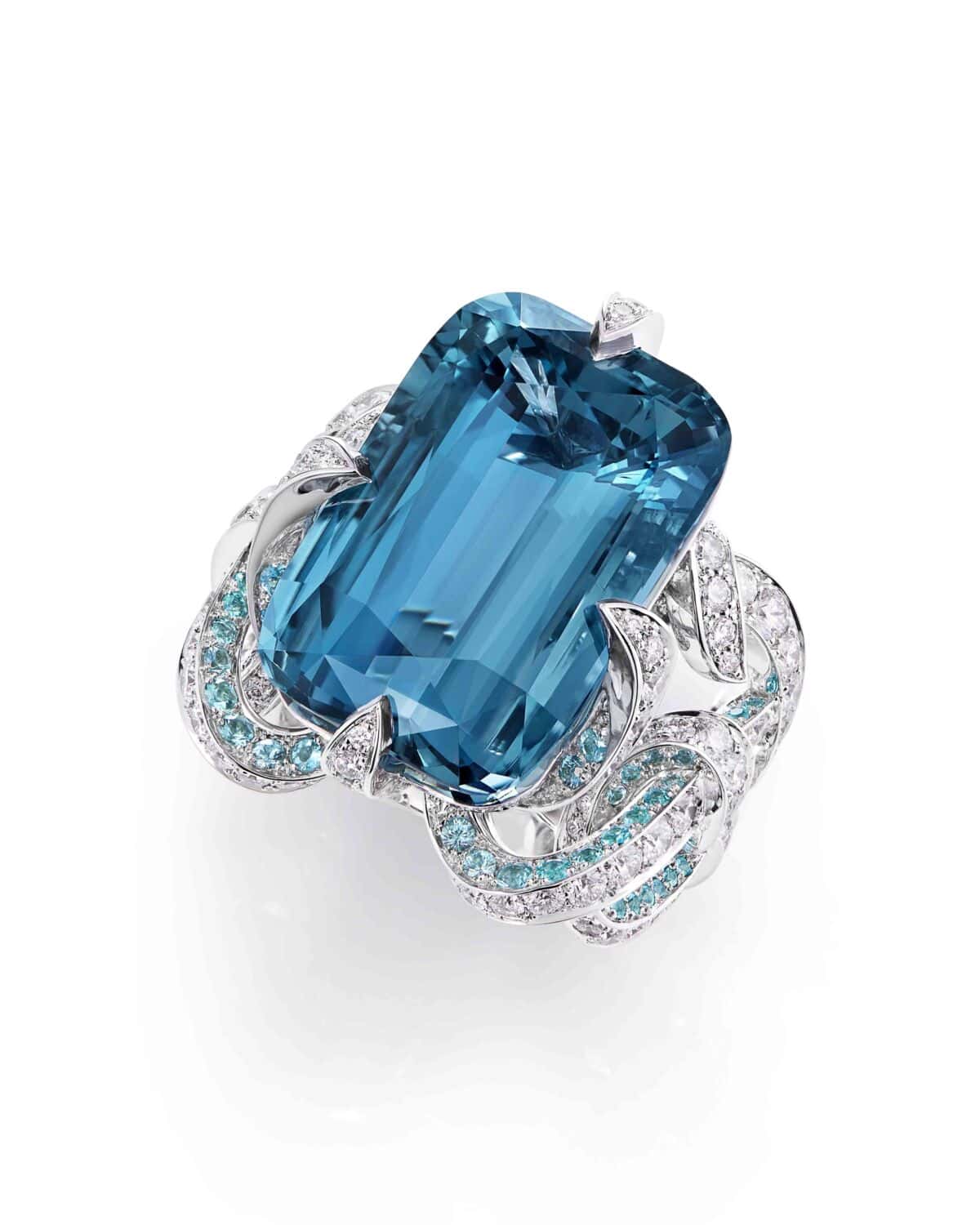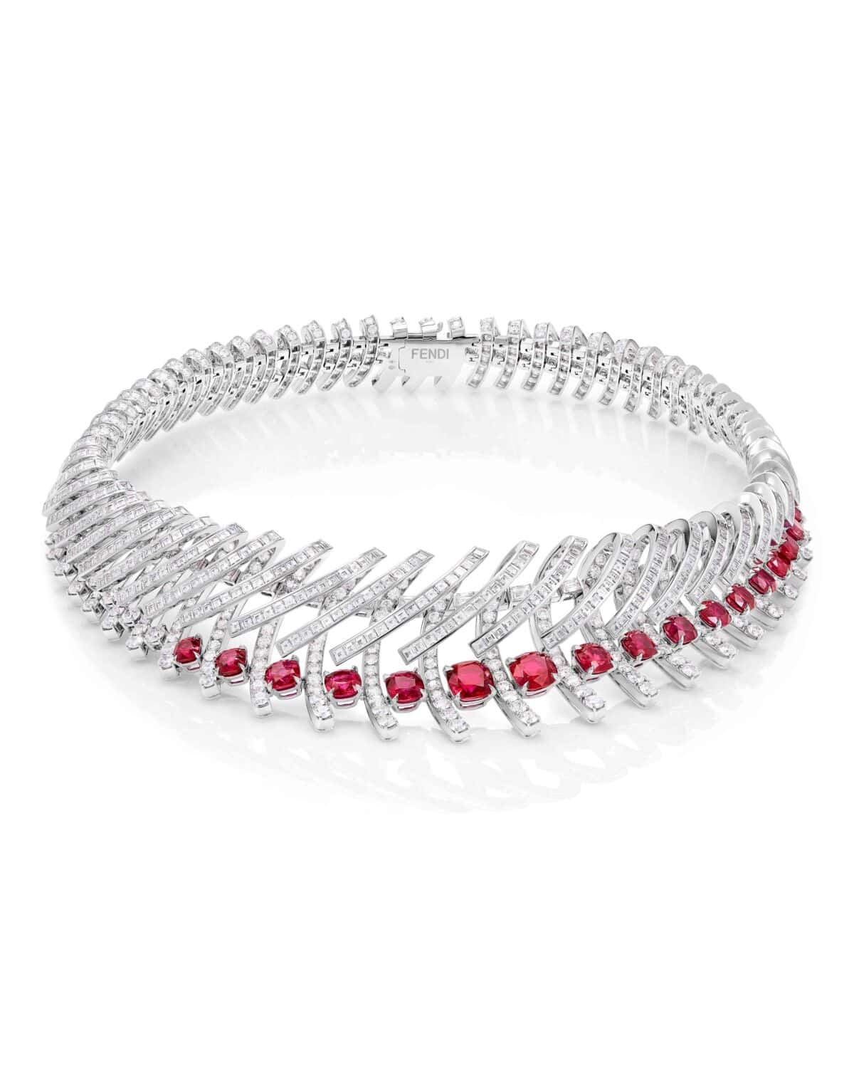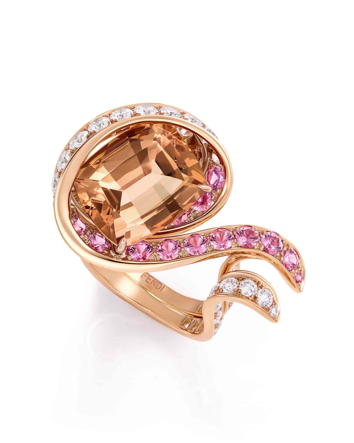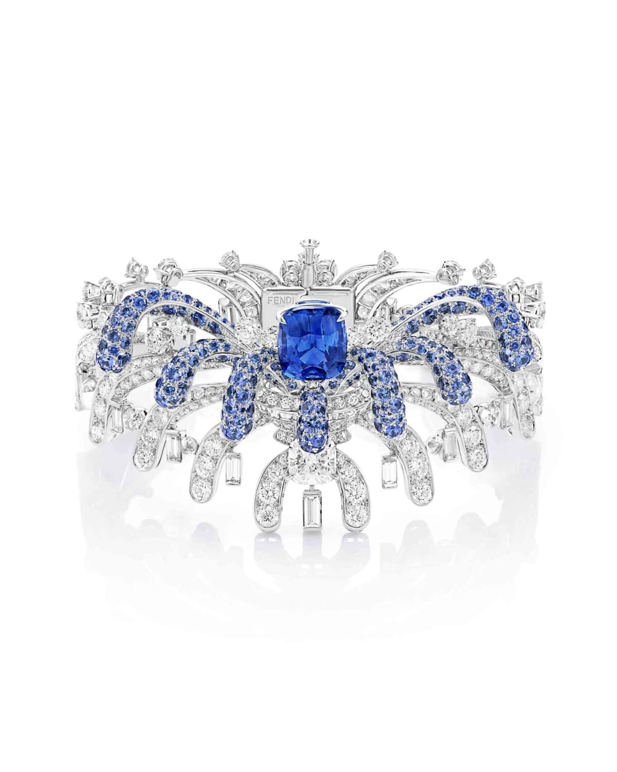 Imagine Rome without its aqueducts or the iconic Trevi Fountain — it’d be impossible given their history within the Eternal City. And it’s this extensive water system that serves as the source of inspiration for Fendi’s new high jewelry collection, Eaux D’Artifice. Designed by Delfina Delettrez Fendi, the seven piece collection consists of three cocktail rings, three parures, and a spectacular necklace. Featuring Mozambique rubies, Colombian emeralds, spinel, topaz, garnets, and yellow sapphires, the designs evoke everything from the water coursing through ancient fountains to the mosses and flowers fed by its flow. Most notable of the grouping is the necklace, designed to commemorate the brand’s centennial anniversary. At its center is a 20.25 carat cushion cut yellow diamond set on the diagonal and surrounded by round and baguette cut white diamonds. To finish, 100 pear-shaped diamonds, one for each year, are sprinkled throughout creating a glittering shower of gems. Talk about a special way to celebrate a special birthday.