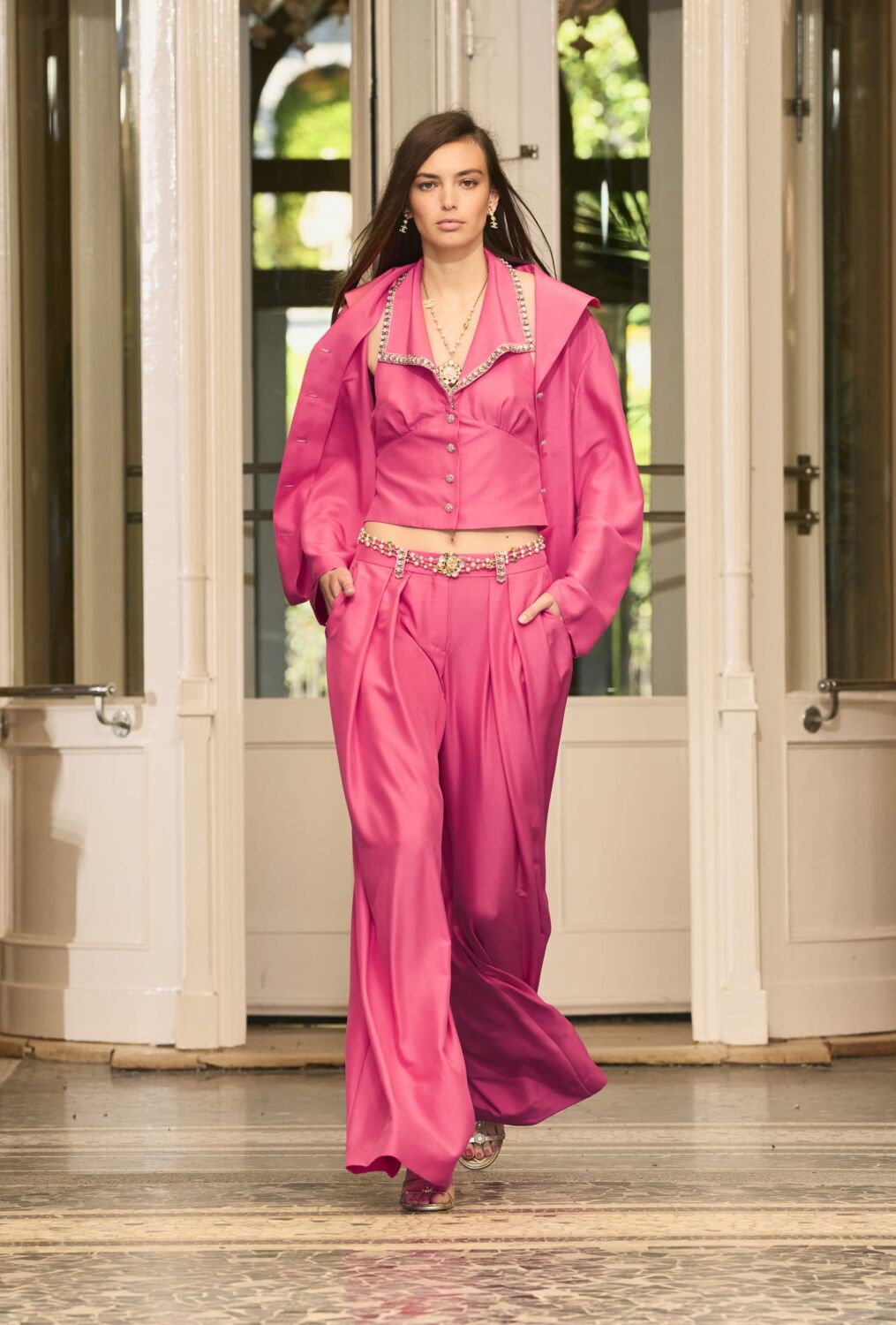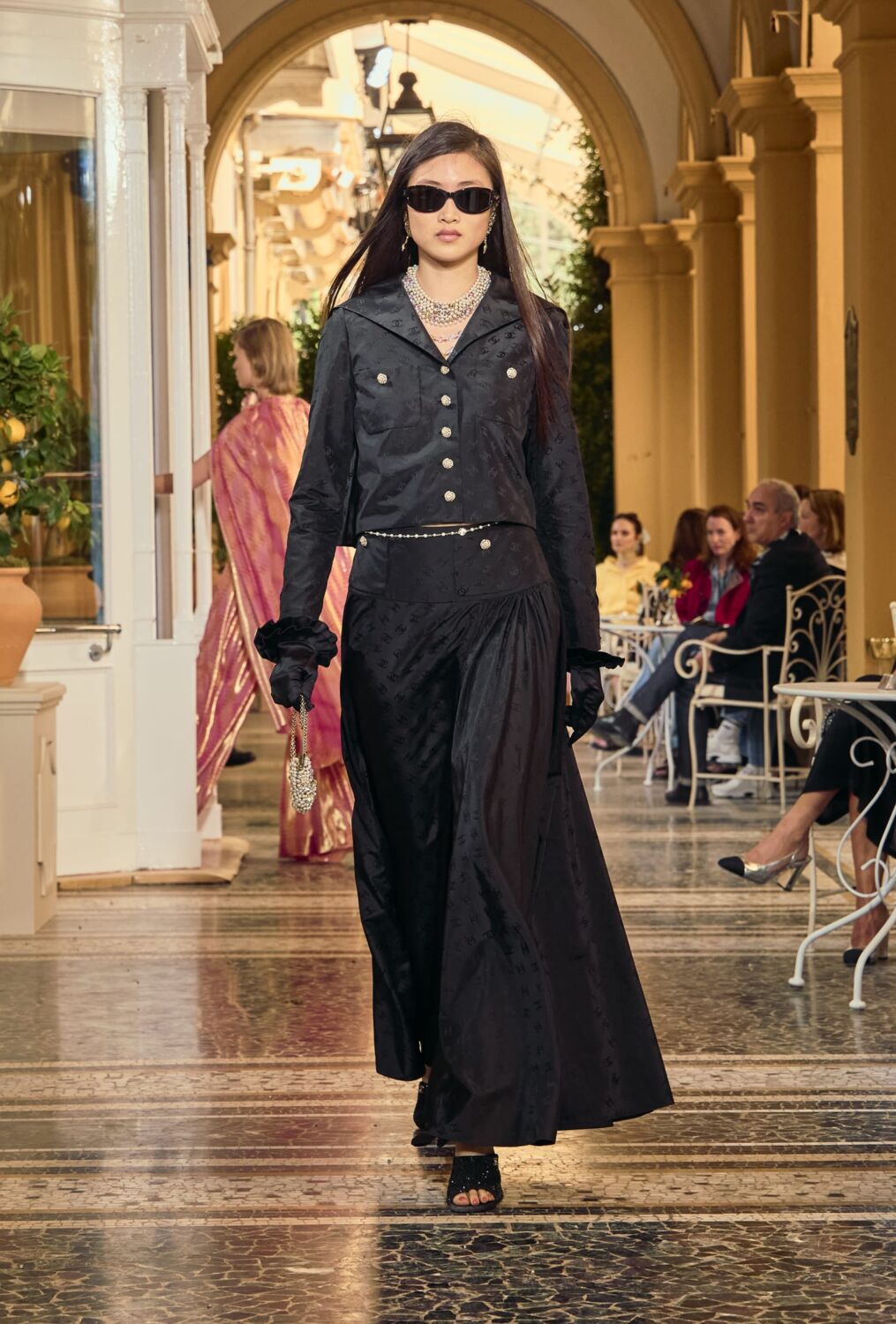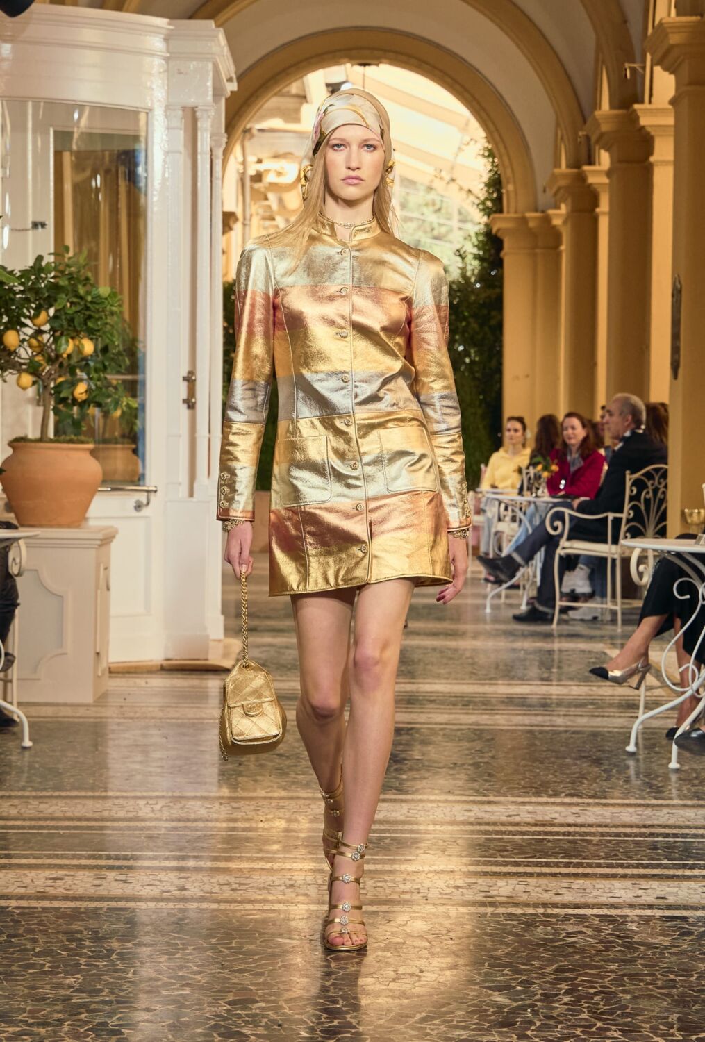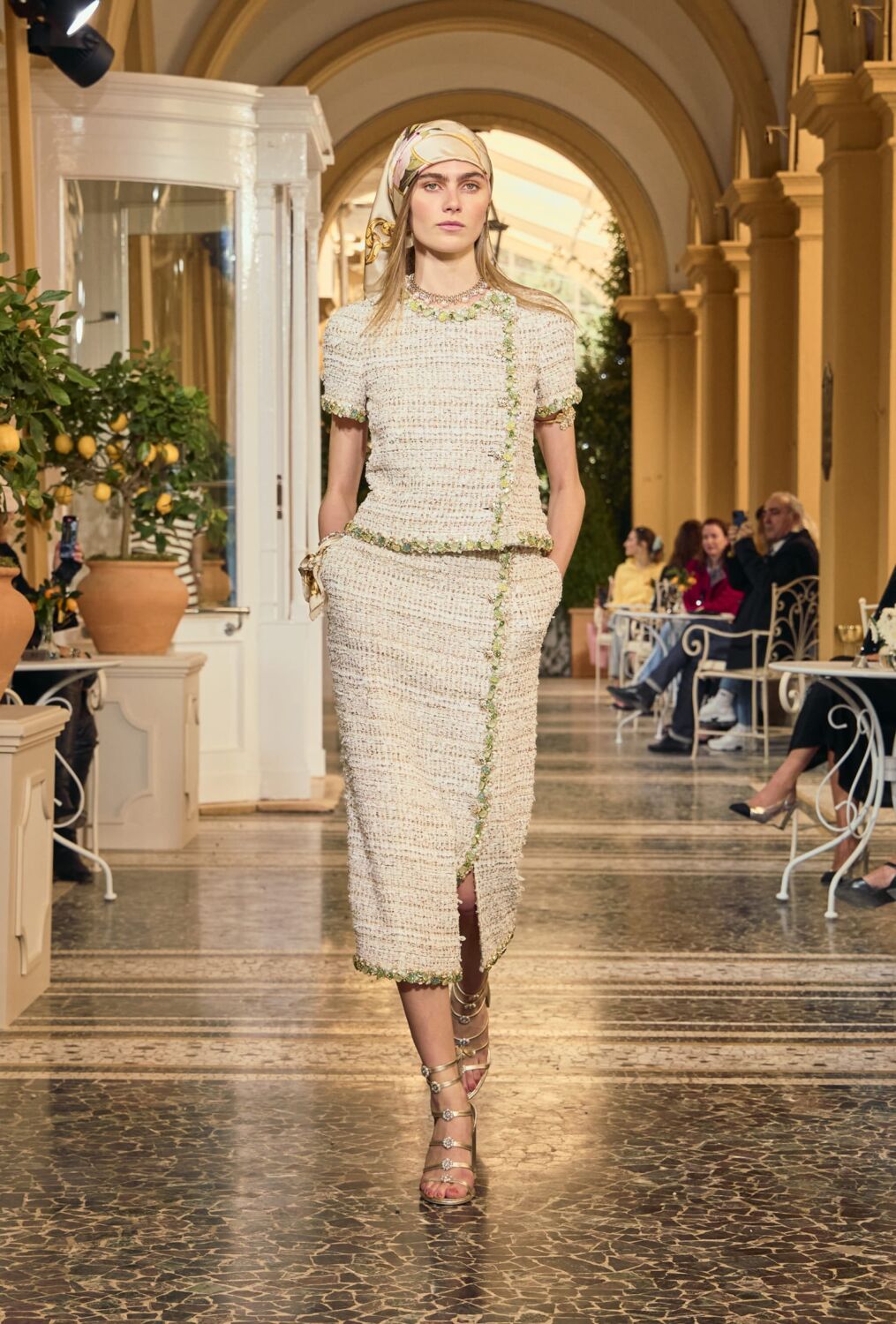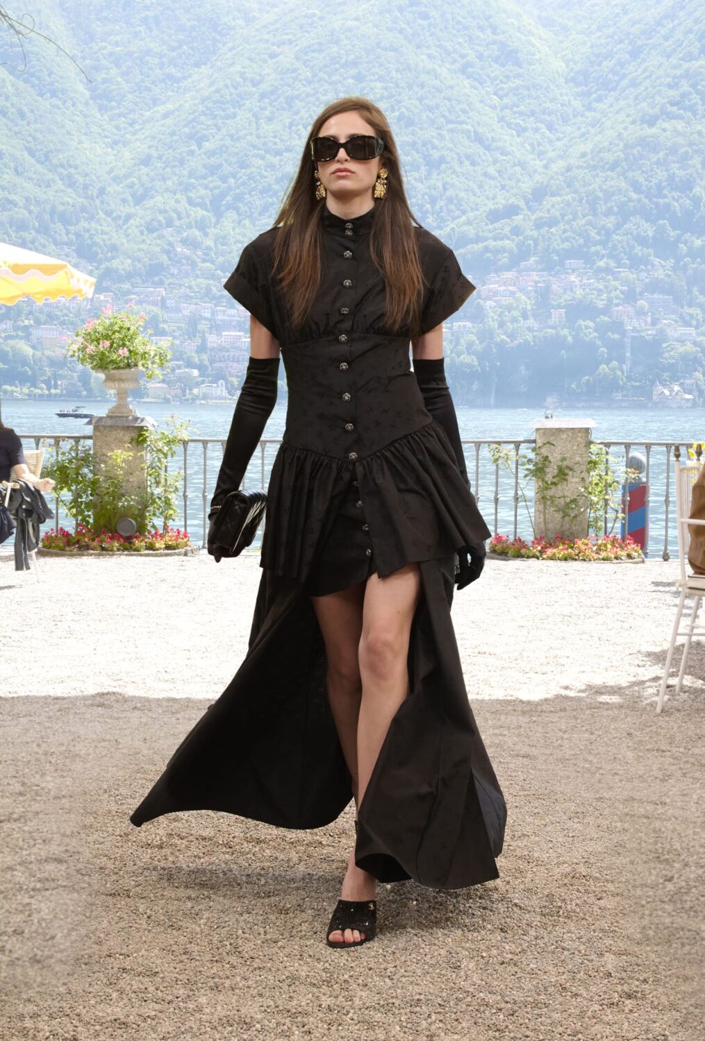 Coco Chanel was familiar with the place. She was friends with legendary Italian director Luchino Visconti and spent time at his villa on the lake, meanwhile the nearby Villa d’Este played host to the likes of Alfred Hitchcock (who filmed The Pleasure Garden there), Rita Hayworth, Elizabeth Taylor, Winston Churchill (who painted the gardens) and the Duke and Duchess of Windsor. Then and now, if you’re wealthy and elegant, the historic lakeside hotel will lure you. Fitting then that the foyer, terrace and gardens served as the catwalk for this show.