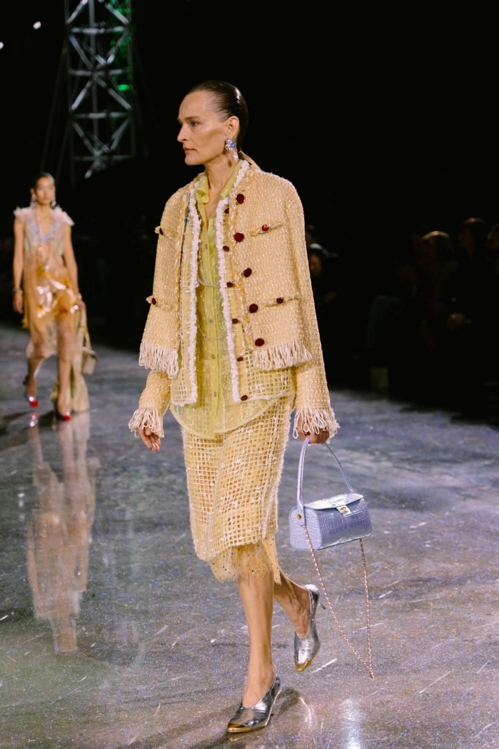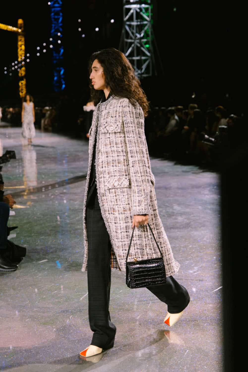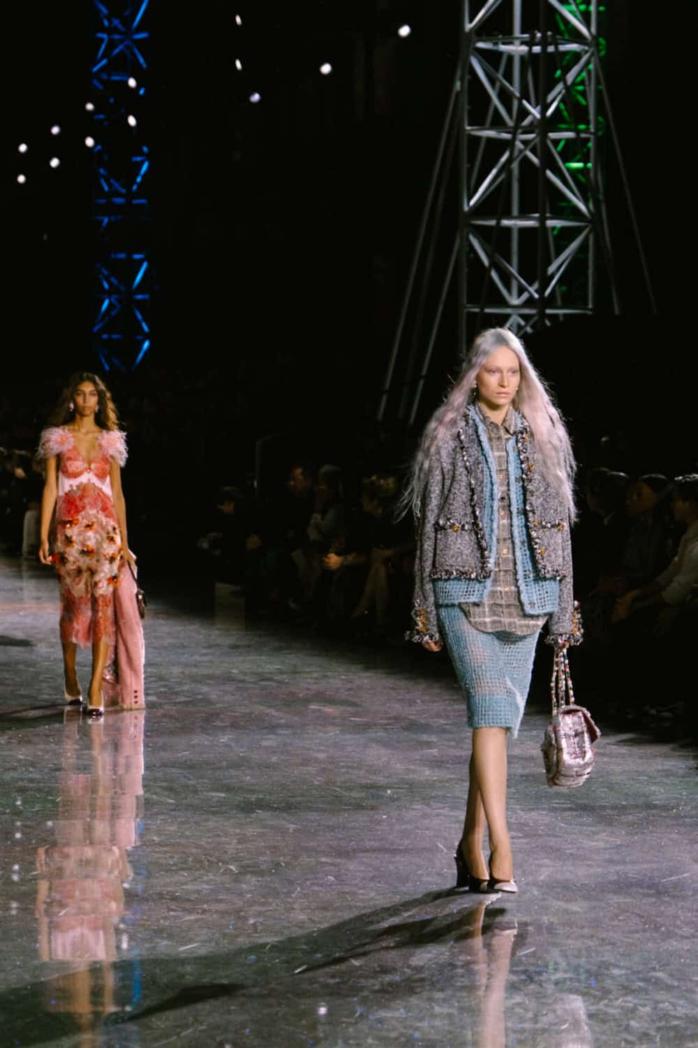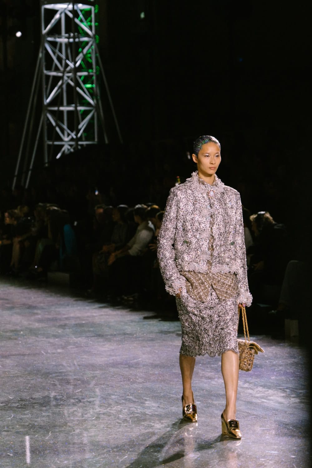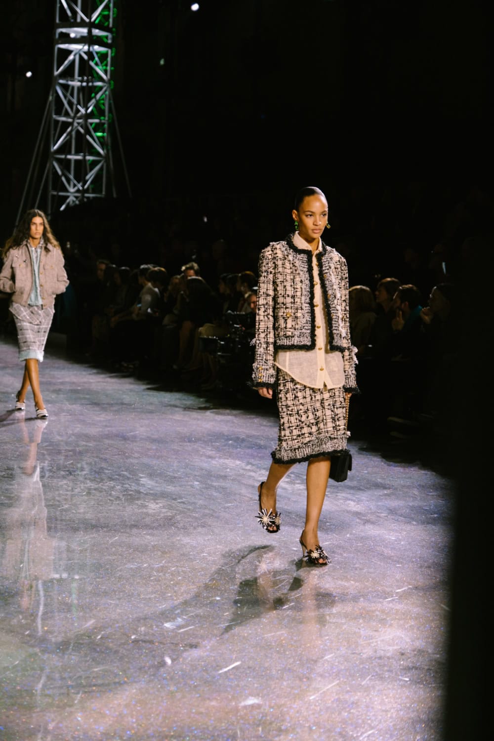 Speaking of social media, Monday night’s show offered two moments. The first was the holographic hair, a dazzling effect that was hinted at by the sparkling floor of the venue. It’ll be interesting to see who dares to recreate that style. The second came courtesy of a musical break as Lady Gaga’s “Just Dance” played, much to the delight of the front row which included Jennie, Margot Robbie, Teyana Taylor, and more. As Blazy came out to yet another roar of approval, it’s safe to say he’s laid down quite the foundation for his future at Chanel.