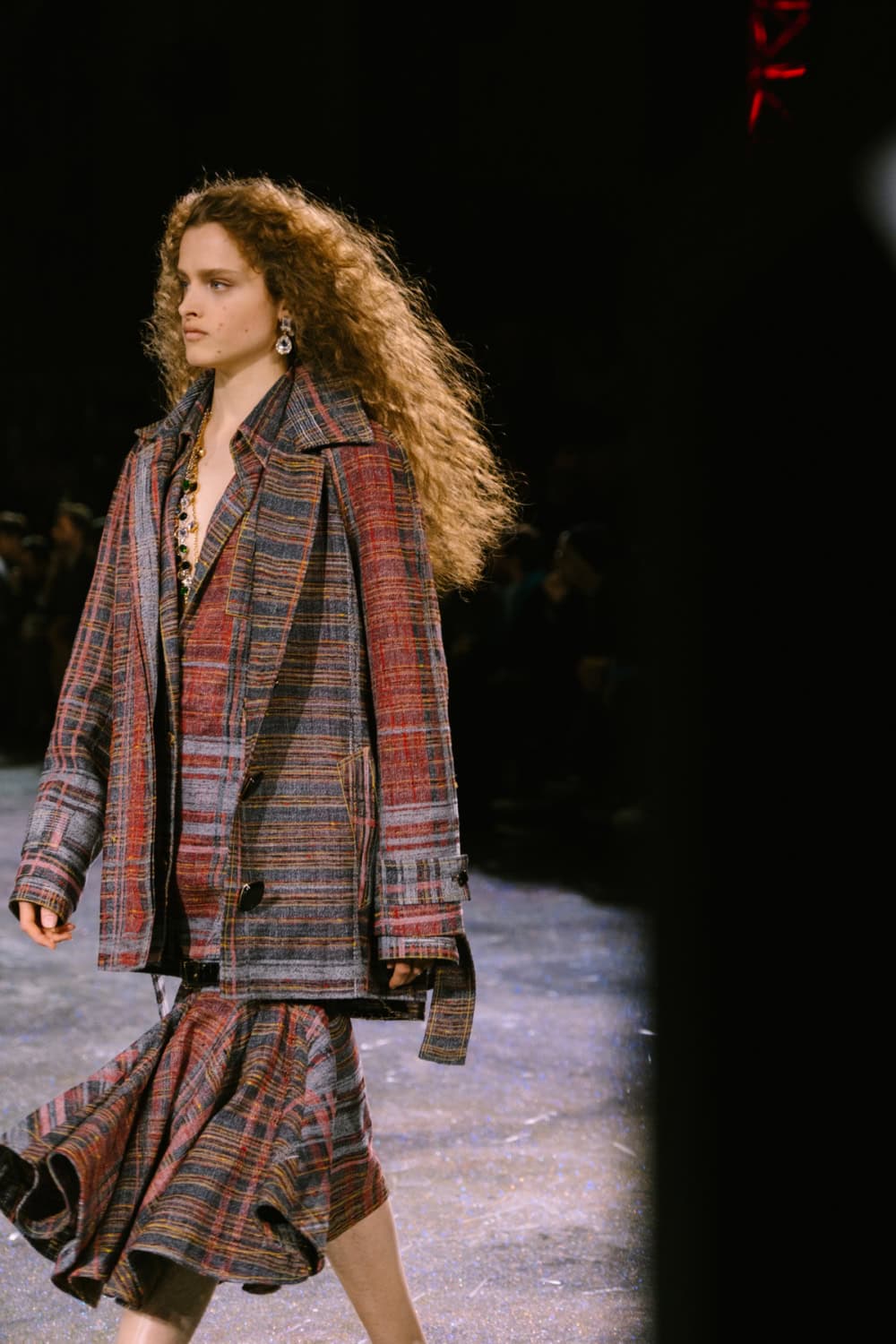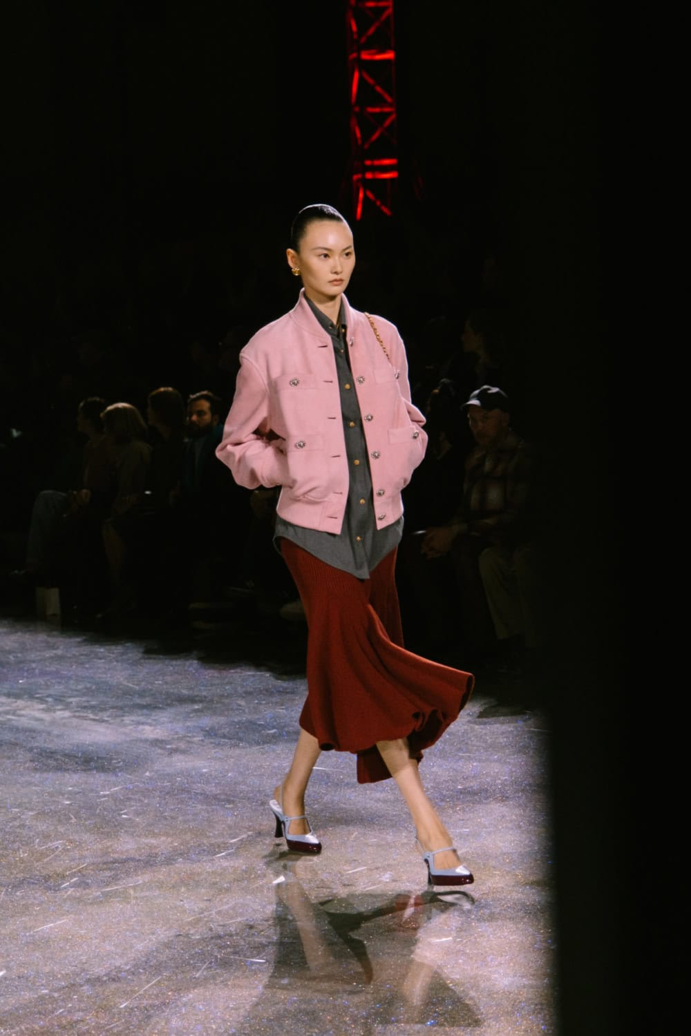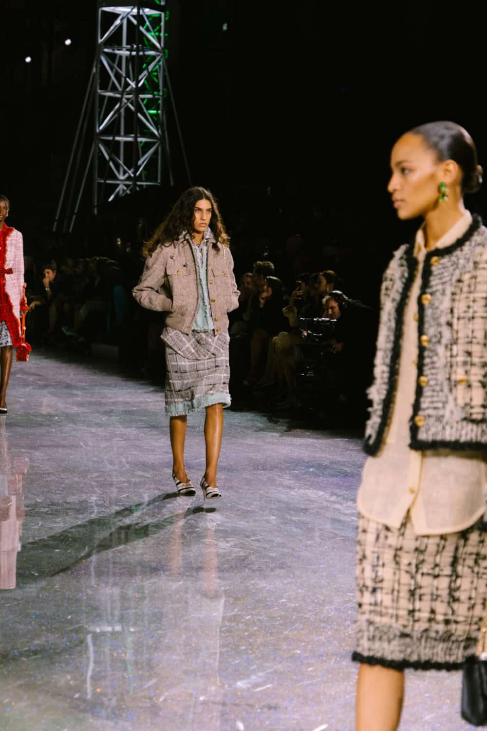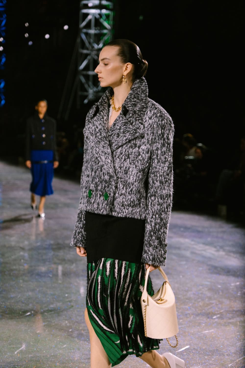 Opening with a sleek black skirt suit, it was a reminder that throughout the years this the brand’s foundational silhouette. Under Blazy and his love of textiles, you’ll see iterations that incorporate everything from gleaning lurex to modern silicone to classic tweeds to gleaming metallics — options for both the woman whether in caterpillar or butterfly mode. Jackets ranged from slouchy bombers to workwear inspired cuts to boxy takes on the classic Chanel blazer. There was plenty for his customers to fall in love with. As for the skirts, some were aggressively drop-waisted, an interesting silhouette that feels fresh, while others skewed more traditional, skimming the knees and calves, occasionally tempered with a bit of a slit at the thigh.