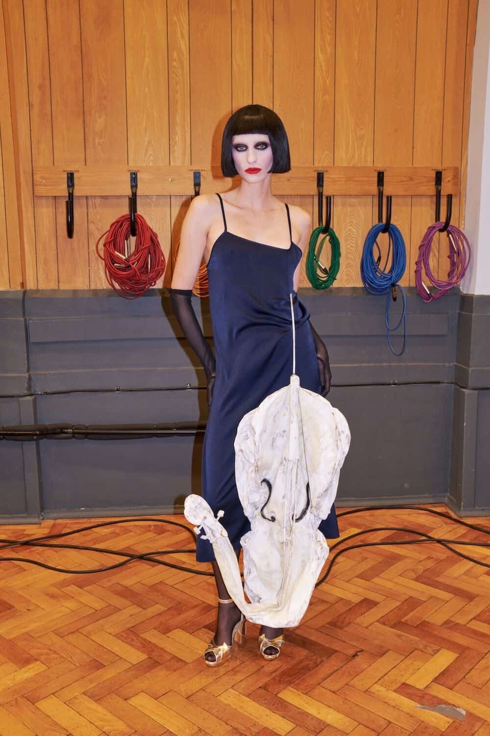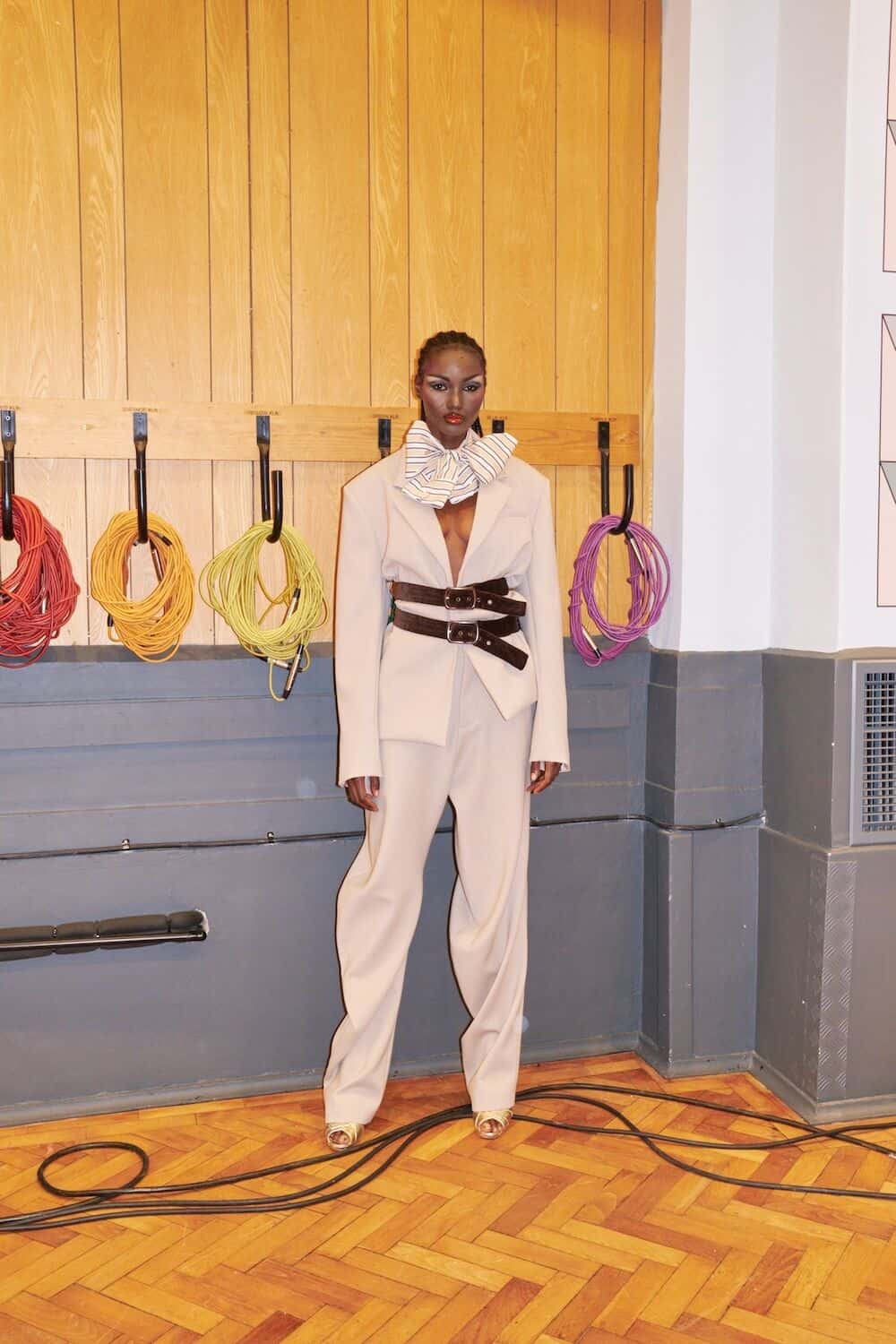 The idea of the prepared piano, the logic behind it and the unpredictable results, spurred Jeffrey’s process this season, with each garment skewed and interrupted, rallying against tradition like, well… a prepared piano. That meant shirts were cut with extra sleeves that tied around the waist like belts, trompé l’œil belts were built into trousers and ties were built into shirting; the kind of stuff that makes you do a double take. One suit was wonkily cinched along the breast creating a molten-like effect while certain shirts were worn backwards or upside down, the kind of intentional mistakes a kid might make when playing dress up in their parent’s wardrobe. Like a prepared piano, nothing was as it seemed.