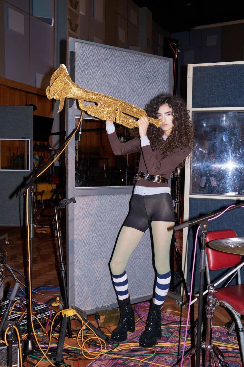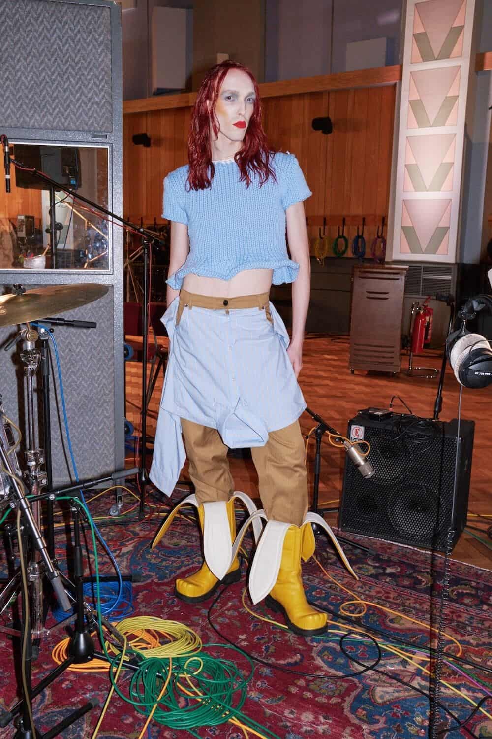 The collection itself, dubbed Prepared Piano (a nod to John Cage’s 1940s technique of modifying the instrument with bolts, rubber and cutlery), cast a symphony of quirky characters to play into distilled archetypes imagined from the characters seen in film material discovered in Abbey Road’s archives. Crisp-suited execs, flamboyant ‘60s musicians and the lab-coated engineers that once shaped Abbey Road’s soundscape are, for 2026, reimagined. Loverboy presents instead, Gen Z producers cocooned in fuzzy beanies and hoodies, defiant rockstars in trumpet-flared sleeves and precise technicians in oversized lab coats. One glitter-sprayed gold dress unpeels like a banana while also somehow resembling a trumpet and another, heavy red crochet frock cocoons the body like a wearable sculpture. Classic tailoring is joyfully distorted – fashion remixed like sound.
