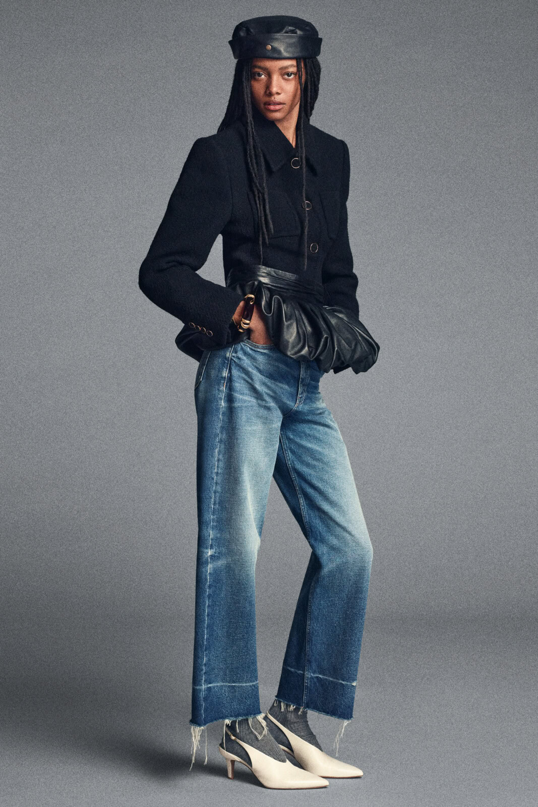 Kamali’s focus is on clothes that slip easily into an existing wardrobe. There is garment-dyed denim and softened workwear, worn with draped leather Basque belts that sit high on the waist and recalibrate proportion. Fluid blouses and lace lingerie tops introduce transparency, while cropped leather jackets sharpen the silhouette. Knitwear is soft but architectural, often sculpted by wide maxi belts that pull volume into focus rather than flatten it.