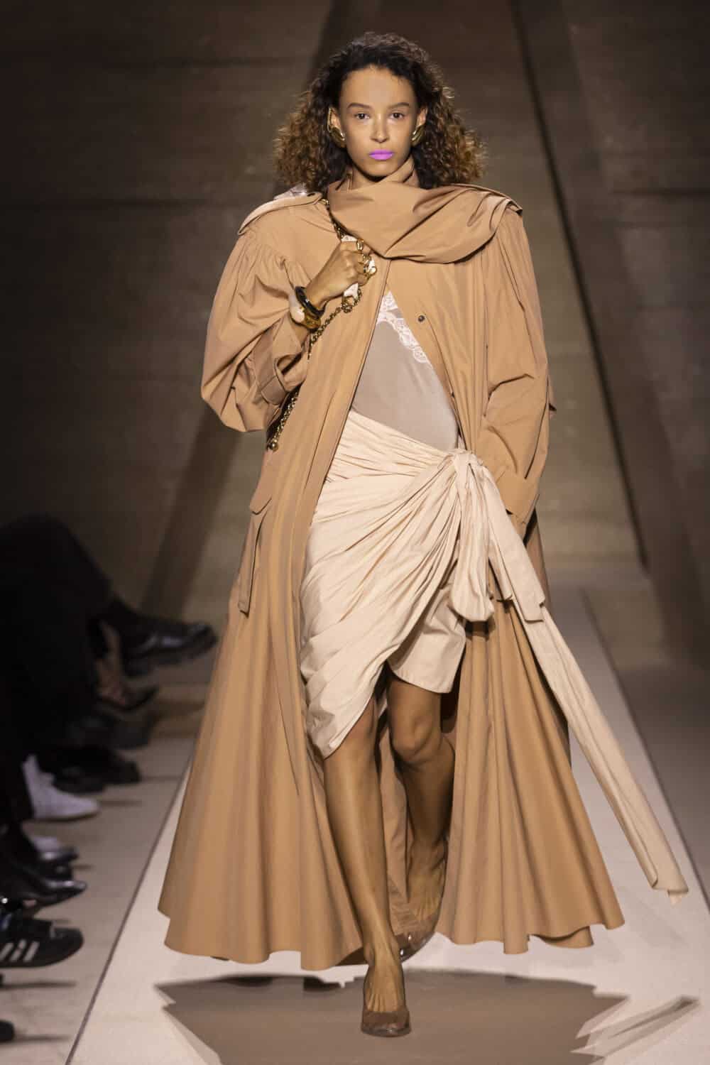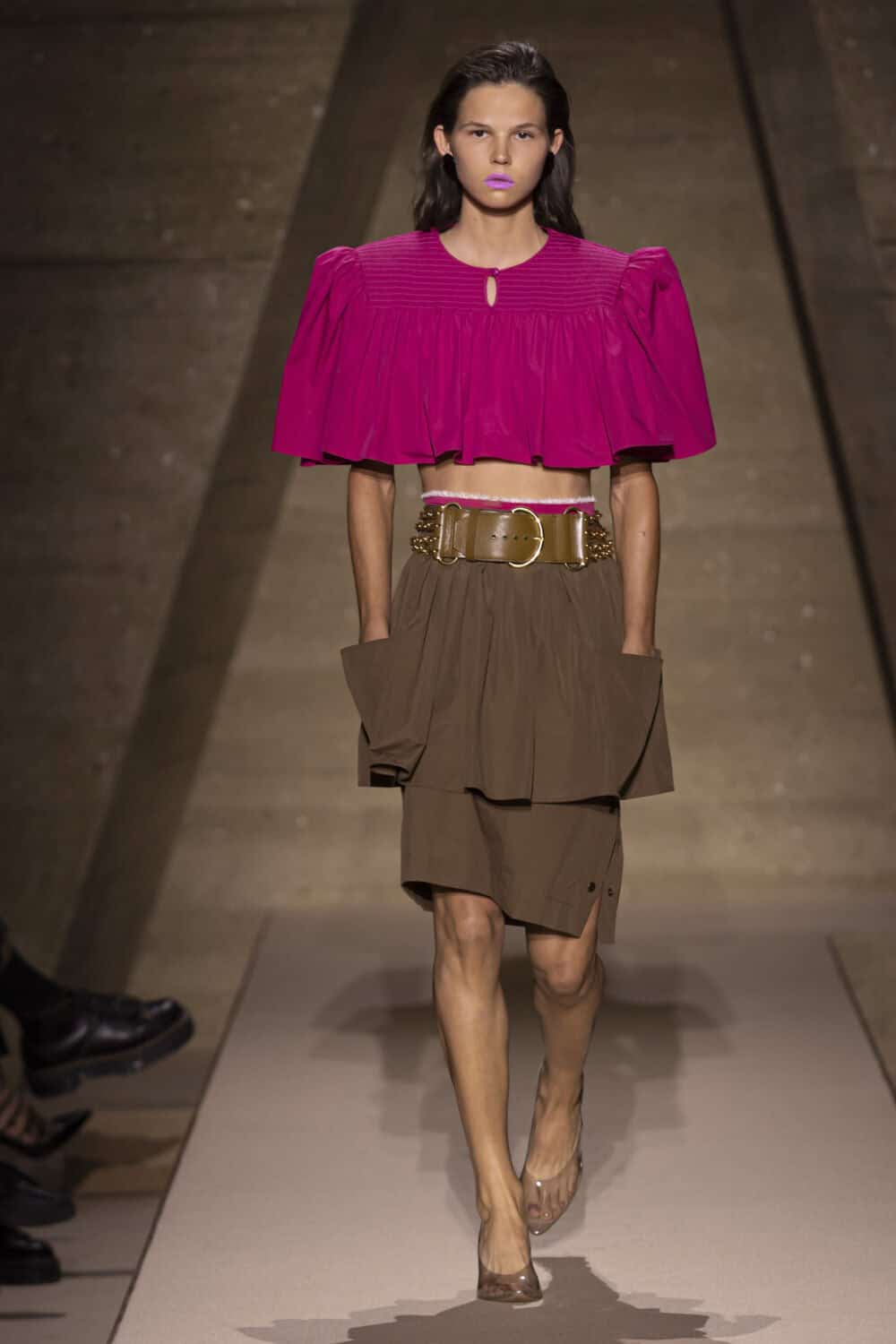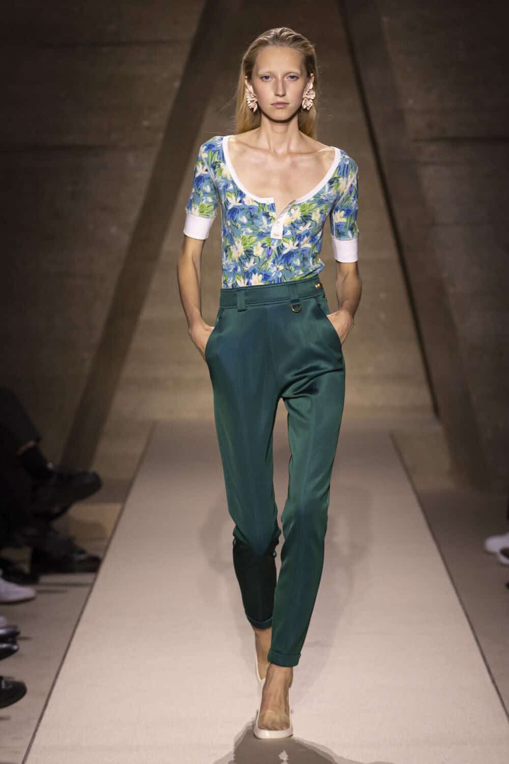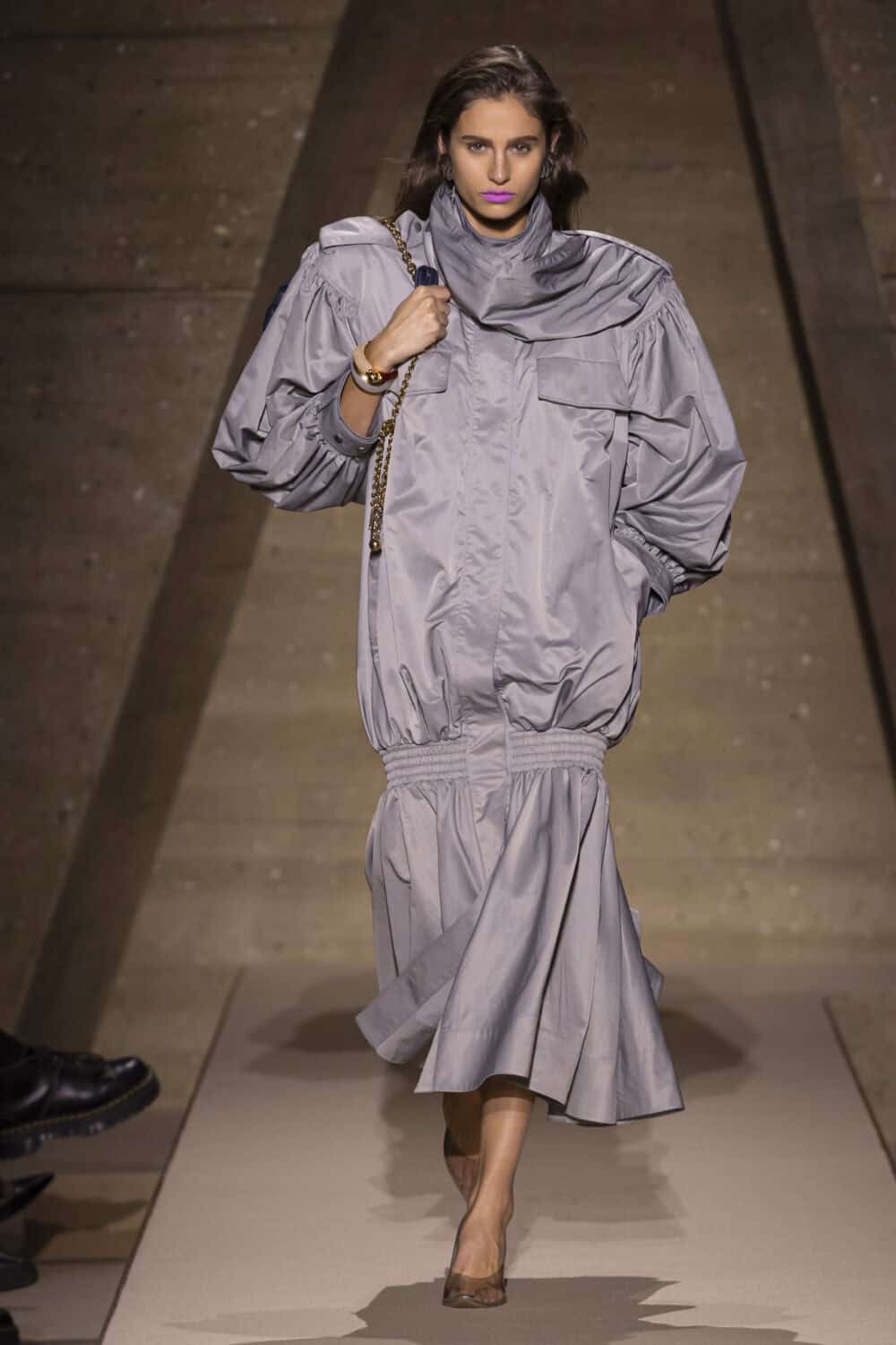 Alongside many variations on the little draped floral dresses, the designer added strong shouldered duster coats in pastel lemon and pink, and slouchy scarf necked leather blousons. These voluminous ’80s proportions added a new swagger to the prettiness of her Chloé look.