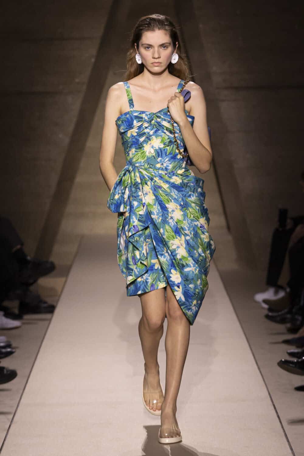 That was her queue to redraw vintage florals from the ’50s and ’60s on humble cotton poplin and silk jersey, and drape them into little ruched and swagged bustier dresses, sarong skirts and party tops. Some shapes were inspired by the archive 1950s dresses others by ruched vintage swimwear. Draping she said was one of her favourite ways to create silhouettes because it is “so instinctive.”
