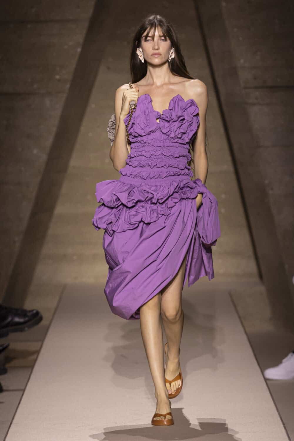Her aim was to achieve “an airiness through pleating knotting and wrapping. Spontaneous but precisely studied.” A few cotton and lace gypsy dresses apricot and lemon nodded to her boho look and she amped up the charm with accessories sending out nicely shell and watermelon slice clutch bags and a joyful leather hydrangea pouch that came in all the soft pastel Chloé colours.
