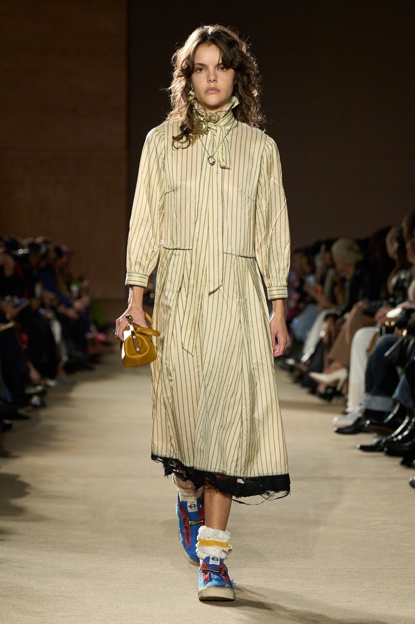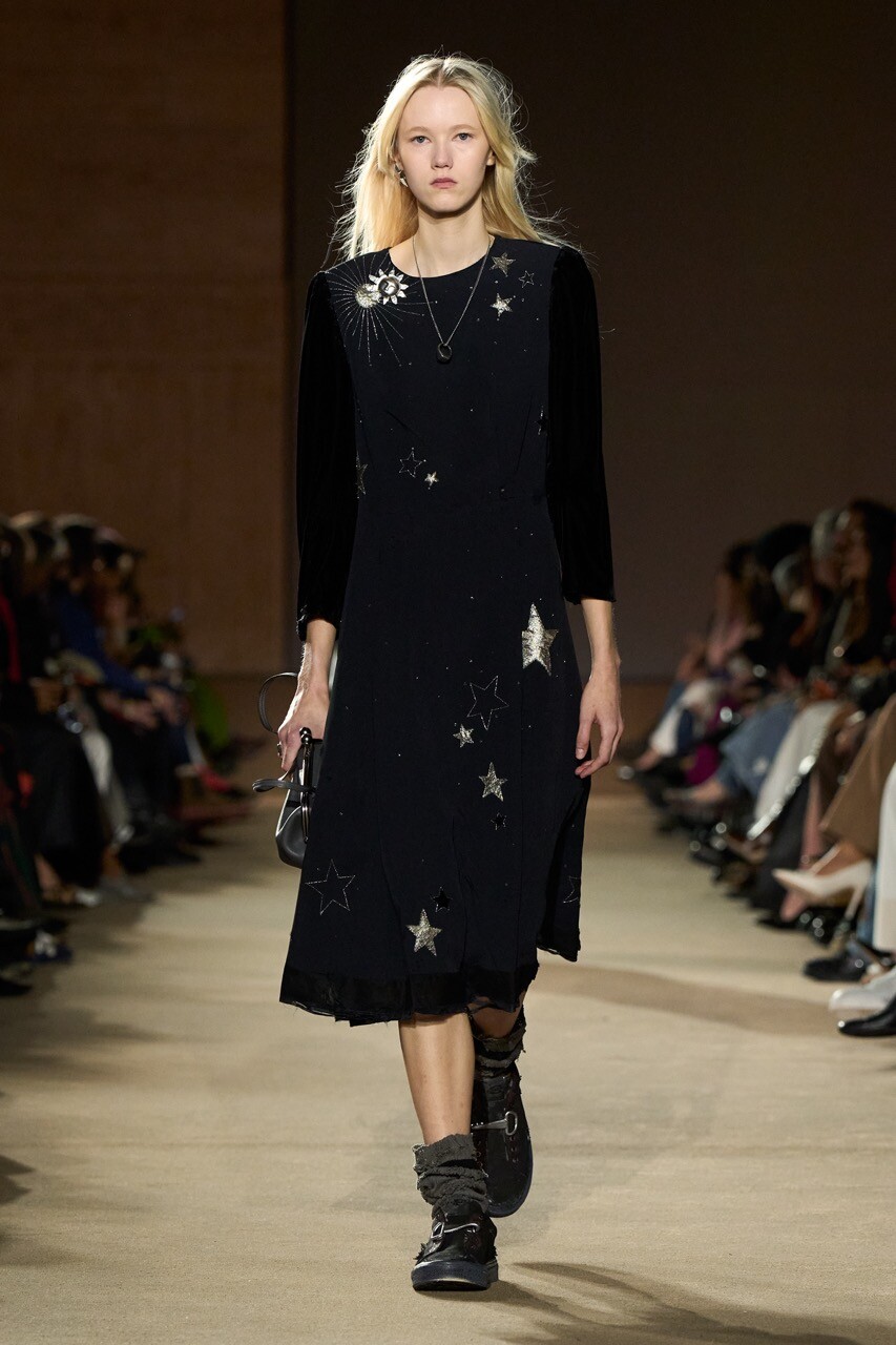 Stuart Vevers is, understandably, feeling a bit emotional. As a parent of three young children (he dedicated the fall 26 show to his newborn daughter, Fawn), he’s been thinking about the passage of time. His show notes were tinged with tenderness. There were references to watching The Wizard of Oz at Christmastime and to the film’s optimism as it transitions from black-and-white to Technicolor. Though sustainability is an oft-used catchphrase, not many designers at big conglomerates use their press materials to express that “recycling means sharing,” or that gently worn hand-me-downs are love notes passed between siblings.