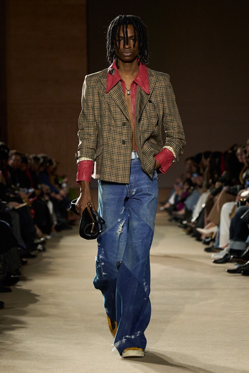 Fittingly, vintage was a big inspiration here, with a youthful, updated twist. Varsity jackets, patchwork denim, and lots of jorts for the skater types, should they want to invest in that kind of thing. Blazers were spliced three ways, featuring different suiting fabrics on each panel. Most models were shirtless underneath their sporty jackets (when you’re a rebel, shirts aren’t totally necessary). Like Dorothy’s famous footwear, there were pops of color in the form of red slouchy pants. shorts, and dresses, but overall, the tones were pretty muted. The best dresses closed the show, black velvet with silver star motifs.