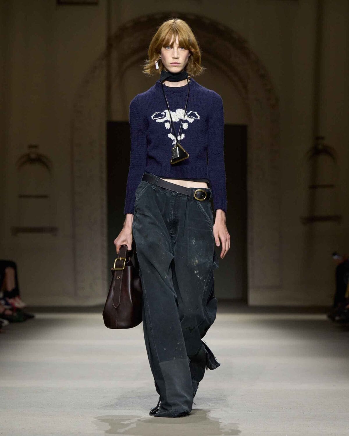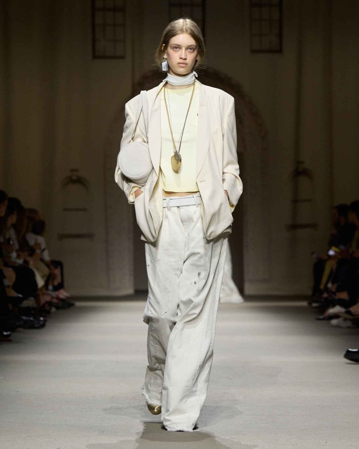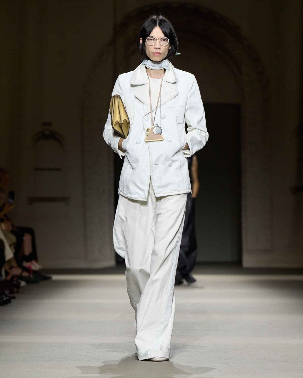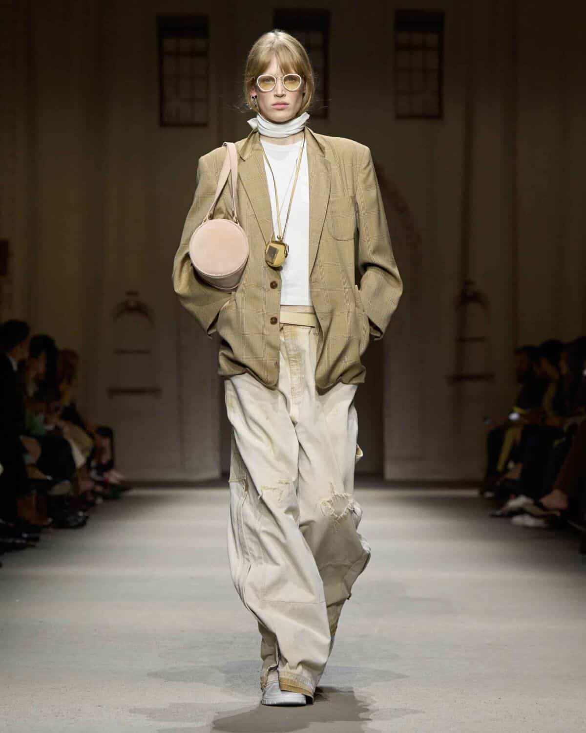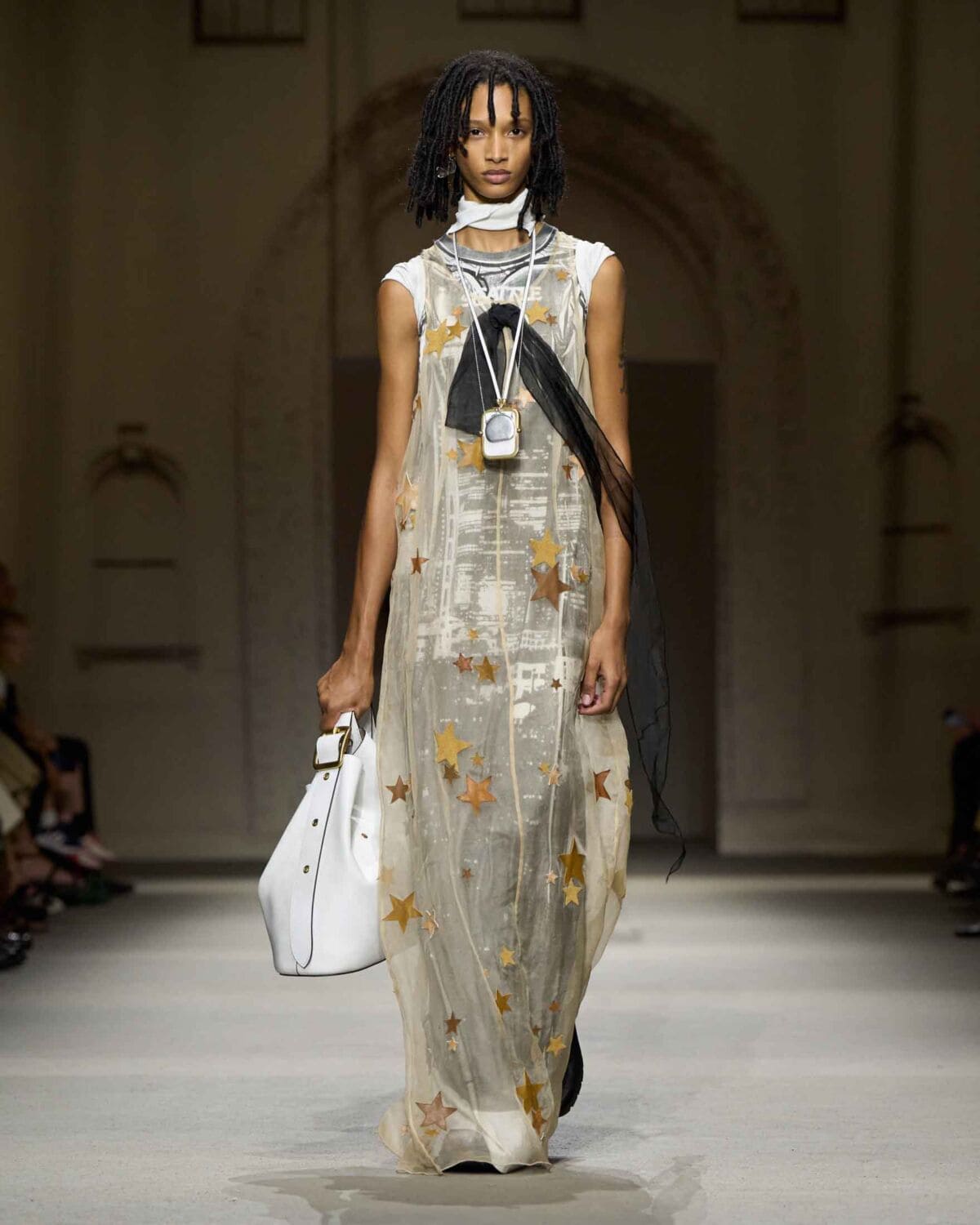 Every look came styled with a bag, the most prominent of them being the Kisslock Barrel Bag, which came in a variety of hues and is available, like, now. (Why wait?) There were also sizable satchels and coin purses worn as necklaces. Occasionally, a look featured a jaunty clip-on tie—the remnants of last night’s party, perhaps. The soundtrack, an extended remix of Elton John’s Yellow Brick Road, was orchestrated by the downtown darling of yore, Fabrizio Moretti of The Strokes (his bandmate Albert Hammond Jr was also seen sitting in the front row). Further down sat Soyeon, Koki, and Storm Reid. In a way, it was the ultimate passing of the torch.